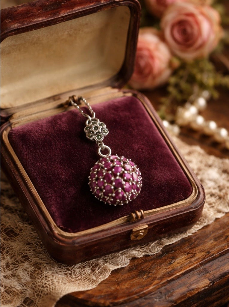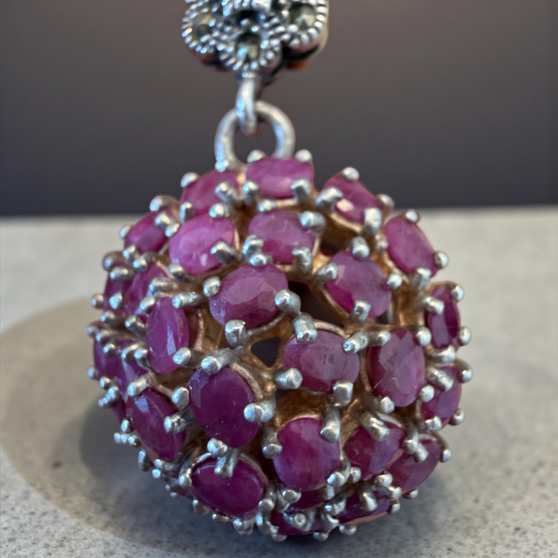 Pendente gioiello in argento con marcasiti e radici di rubino, 60s-70s