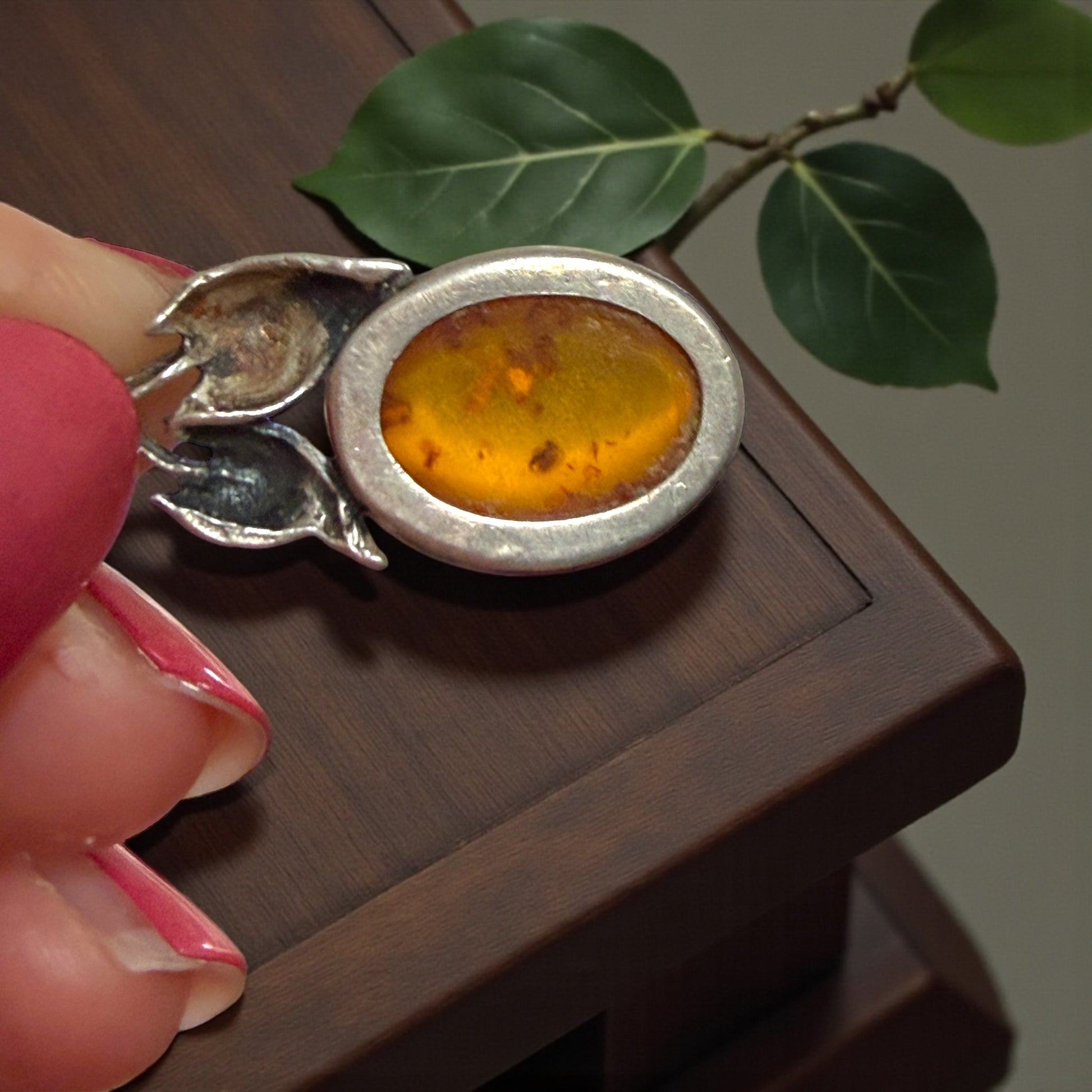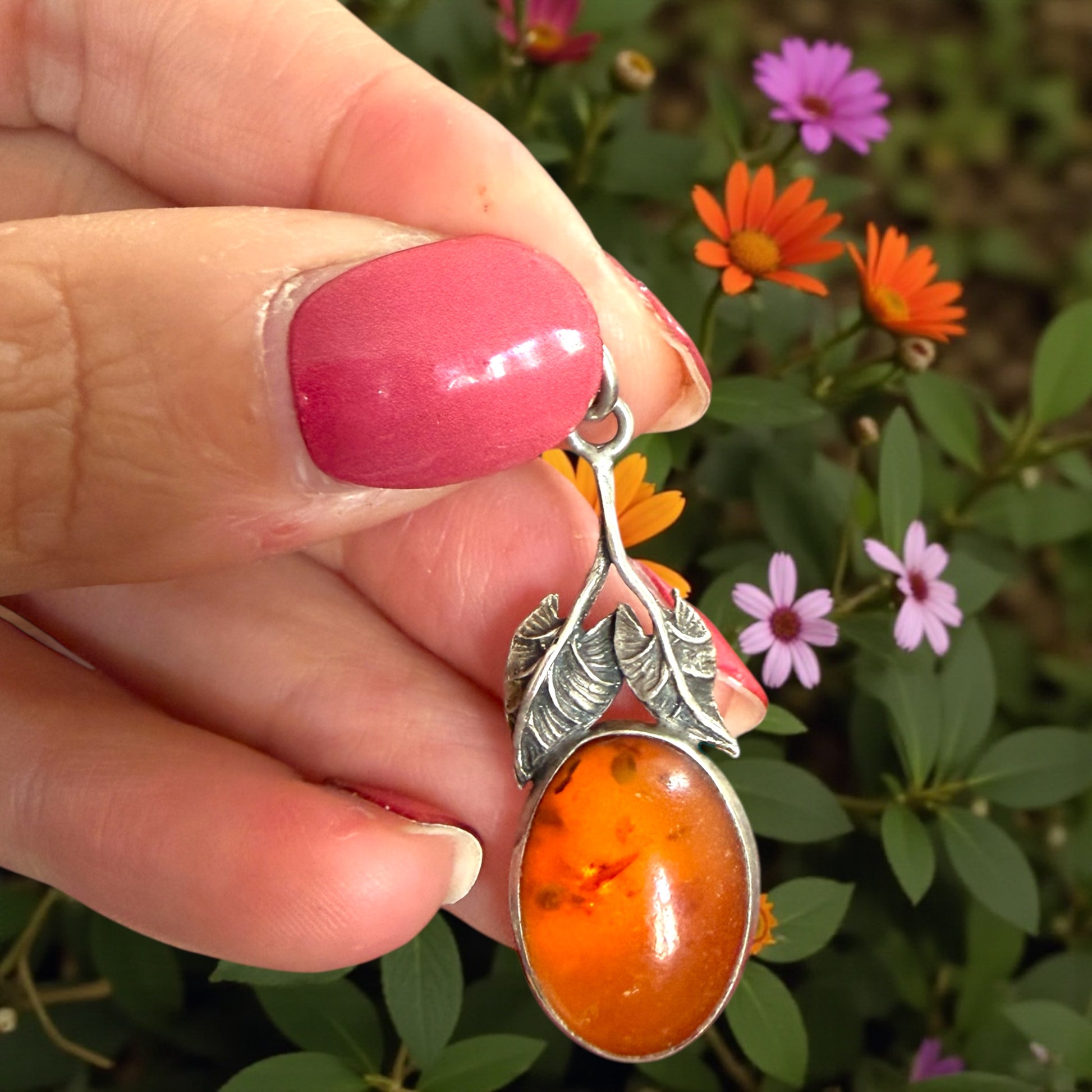 Ciondolo in argento 925. Epoca: anni ’70. Pietra: ambra baltica naturale, ovale a cabochon. Colore: miele/arancio con inclusioni visibili. Dimensione totale: 3,6 cm. Lavorazione: foglie in argento a rilievo, montatura manuale. Condizione: ottima con naturale patina dell’epoca.