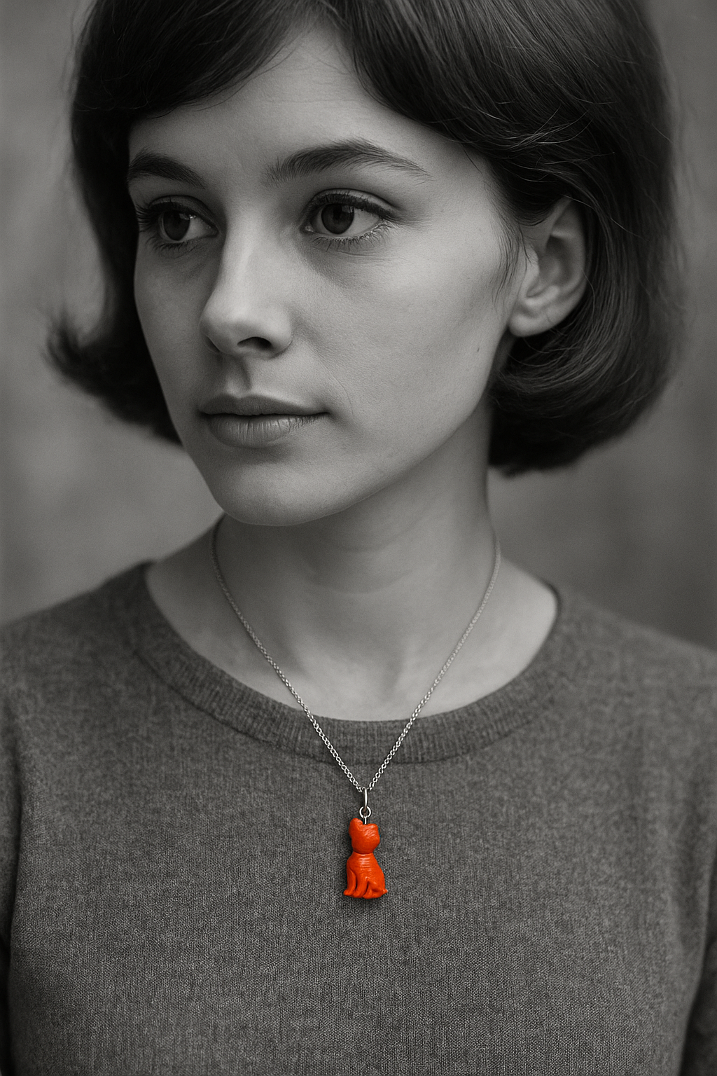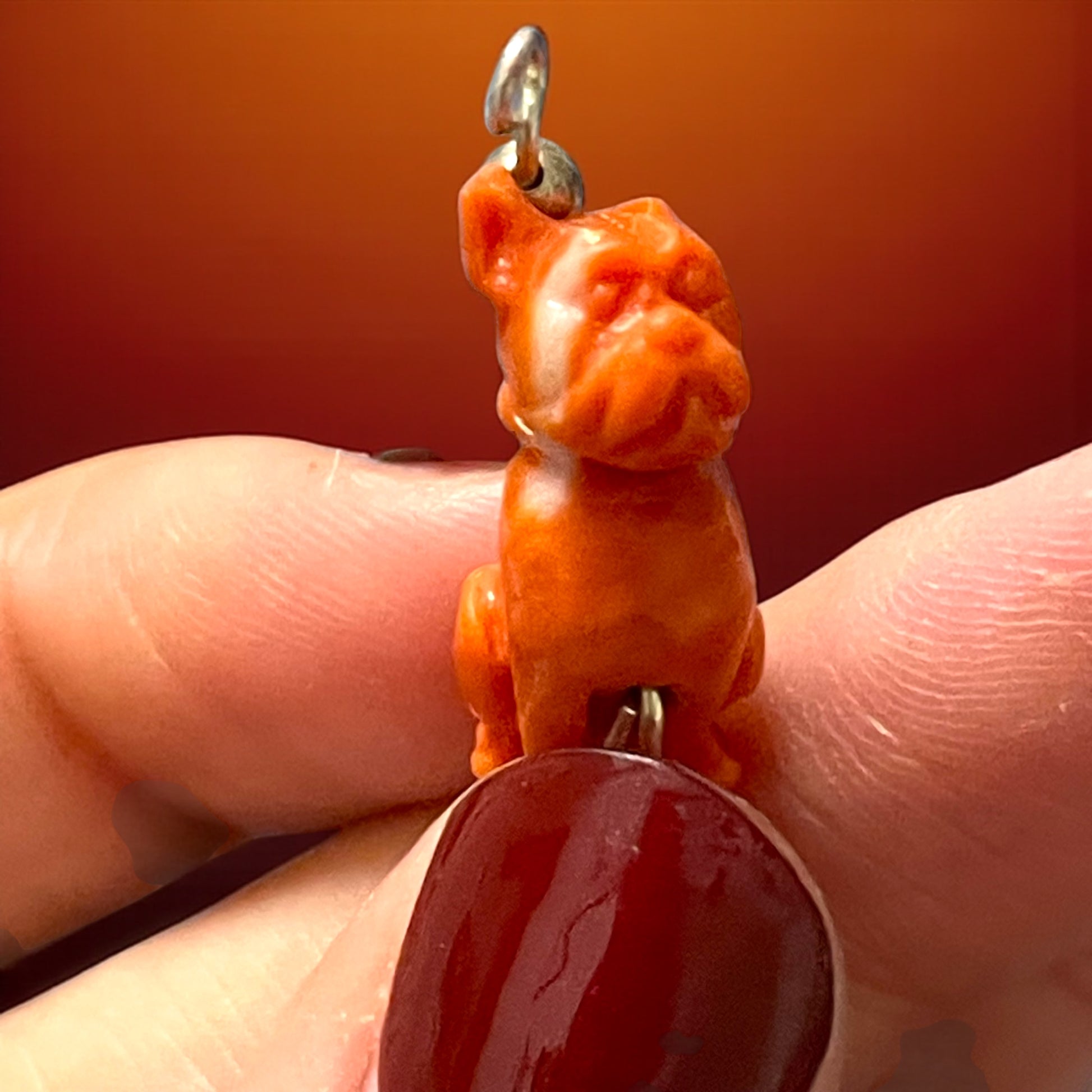 Sapete come mai il corallo è un materiale così prezioso? Il corallo mediterraneo naturale (Corallium rubrum) è una risorsa rara e limitata: cresce molto lentamente, appena pochi millimetri all’anno, e si trova solo in specifiche aree del Mediterraneo. La raccolta è regolamentata da normative severe per evitarne l’estinzione e per questo il suo valore economico è cresciuto negli anni. A differenza di imitazioni in resina o pasta di corallo, il corallo vero mostra venature naturali e una consistenza compatta, caratteristiche che lo rendono ambito sia in gioielleria sia in collezionismo. In questo piccolo ciondolo, il corallo prende la forma di un cane scolpito a mano. Seduto con il muso rugoso e lo sguardo fiero, sembra quasi vivo, pronto a vegliare con fedeltà su chi lo indosserà. Le orecchie – una dritta e una abbassata – lo rendono ancora più realistico, come colto in un gesto spontaneo e affettuoso. Il cane, simbolo universale di fedeltà e protezione, si fonde così con la rarità e il valore concreto del corallo, dando vita a un piccolo talismano che è insieme gioiello e investimento.