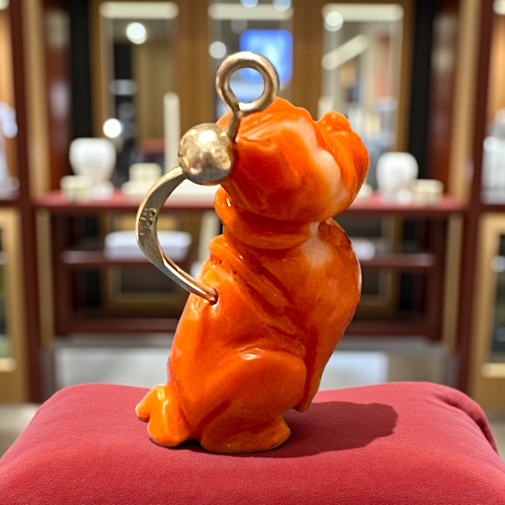 Pendente a guisa di cane (boxer). Materiale: corallo naturale mediterraneo scolpito. Montatura: argento. Epoca: metà/fine XX secolo. Condizioni: buone, con minime tracce d’uso compatibili con l’età.