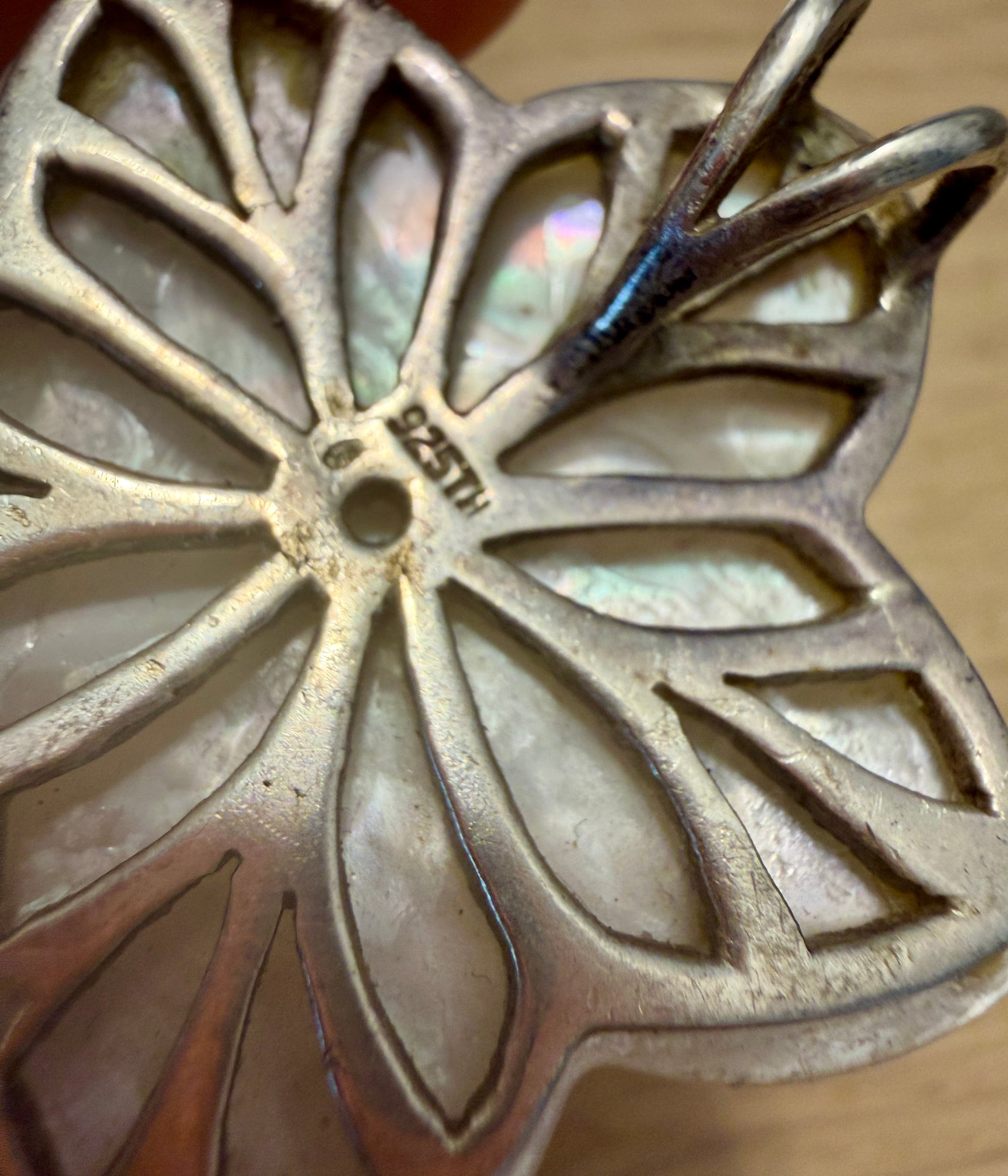 Pendente floreale in madreperla con pietra centrale rosa, montatura in argento 925. Madreperla naturale intagliata, pietra centrale probabilmente in vetro o cristallo sfaccettato. Dimensioni circa 3,5 × 3,5 cm (iscrivibile in un quadrato). Epoca stimata: seconda metà del Novecento. Buono stato di conservazione, con lievi segni del tempo coerenti con l’età.