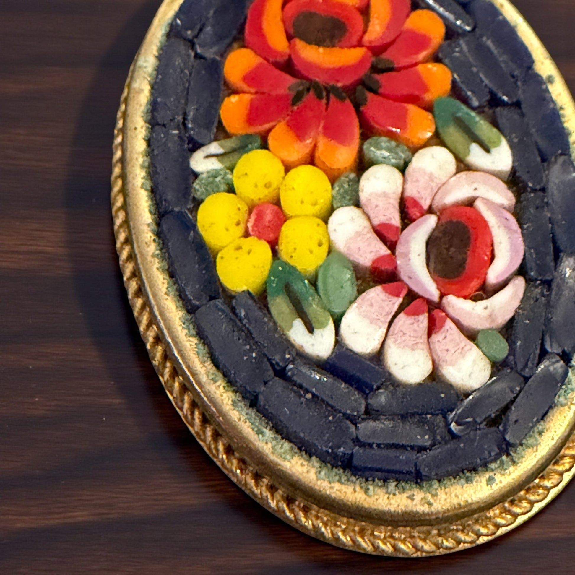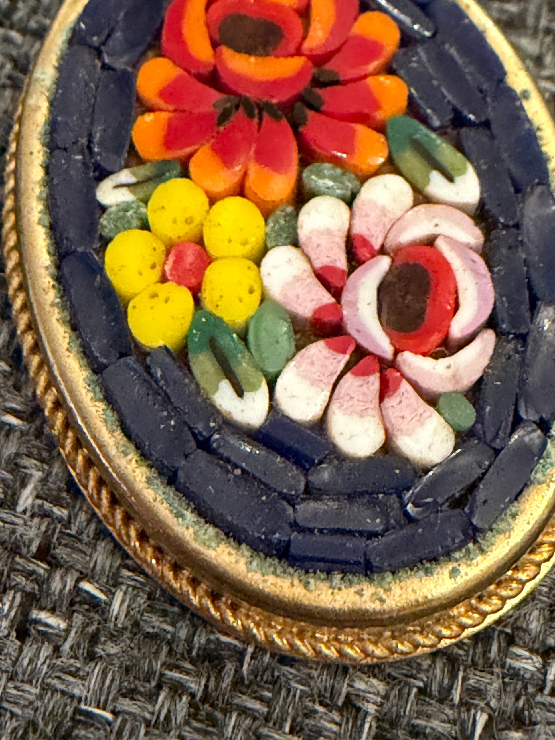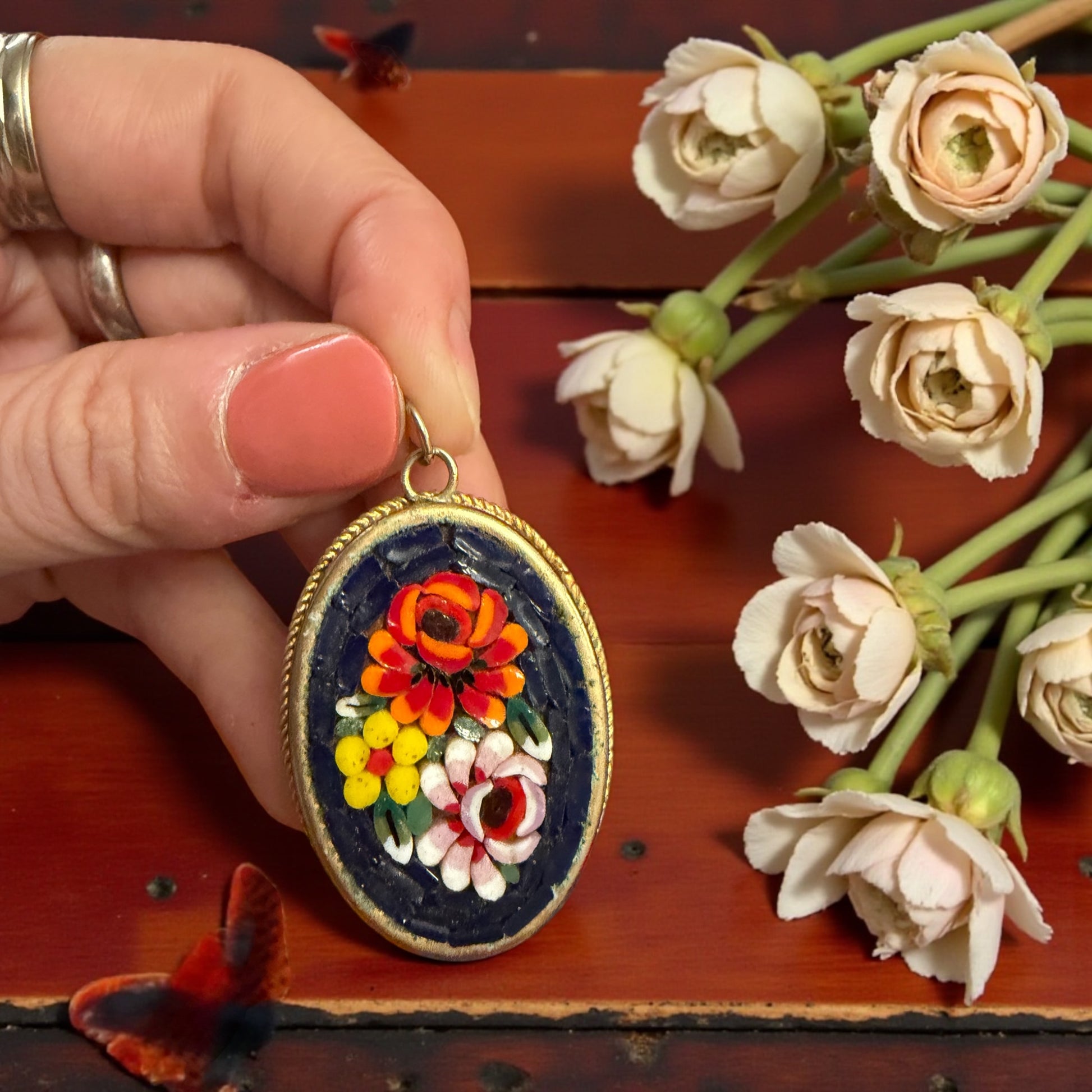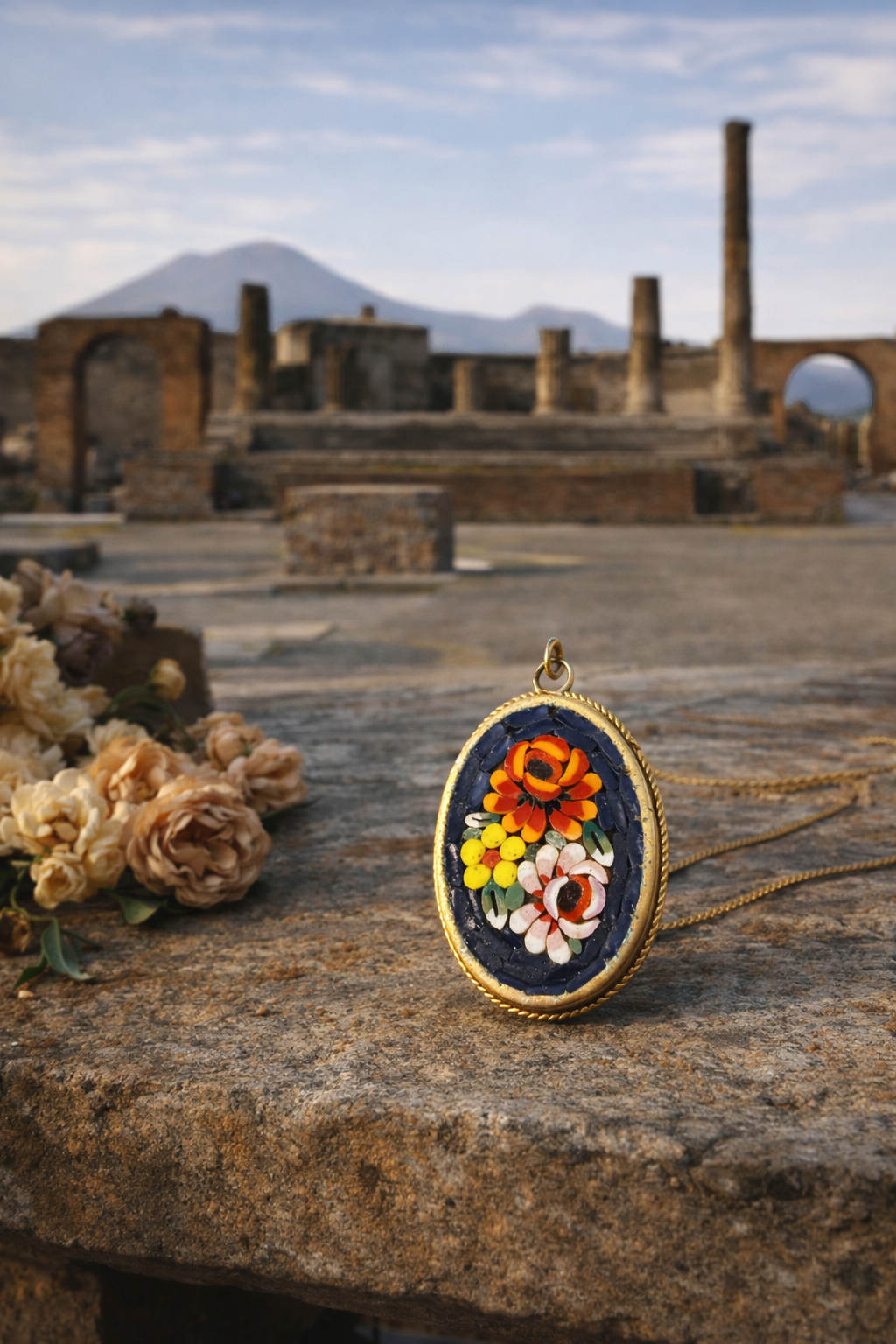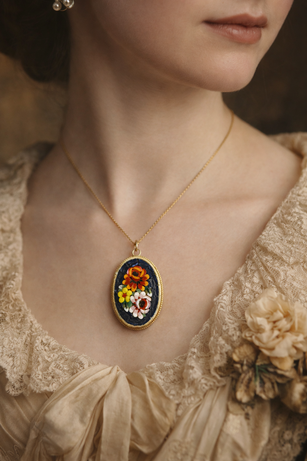 Un piccolo giardino romano, racchiuso in quattro centimetri. Questo pendente custodisce un micromosaico floreale realizzato con minuscole tessere vitree, posate una a una con pazienza quasi meditativa. Il fondo blu profondo fa emergere i fiori come se fossero appena colti: il rosso caldo, il bianco delicato, il giallo luminoso. Nessun elemento è casuale, tutto dialoga in equilibrio. È il tipo di oggetto che nasceva per accompagnare un viaggio importante, scelto come ricordo da chi aveva visto Roma e voleva portarne con sé un frammento silenzioso. Indossarlo oggi significa fare spazio a una bellezza lenta, fatta di gesto, di tempo e di mani esperte. Di viaggi come il Grand Tour, che non lasciavano centinaia di fotografie dietro sè ma un grande seme sbocciato: l’amore per la storia. Chi immagini dietro questo piccolo giardino portatile? Quale uomo l’avrà scelto, primo ‘900, per la sua amata… o quale donna si sarà concessa di amarsi da sola?