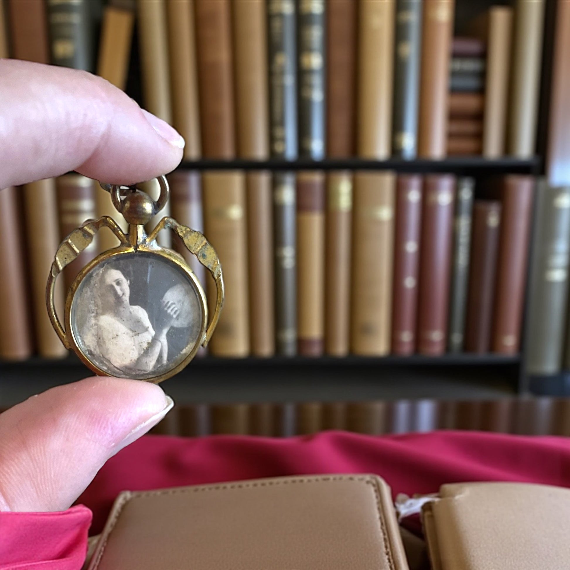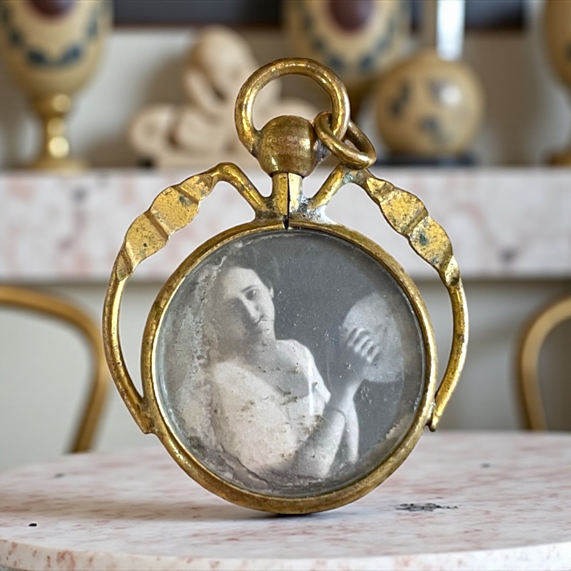 C’è un’eleganza silenziosa in questo medaglione d’epoca, realizzato nei primi decenni del Novecento. Al suo interno, dietro il vetro, una giovane donna posa con sguardo sereno, stringendo tra le mani una palla: un oggetto spesso usato nei ritratti fotografici dell’epoca come simbolo di giovinezza, grazia e spensieratezza, oppure come semplice elemento scenico per dare naturalezza alla posa. La luce delicata accarezza il suo volto, restituendo tutta la grazia formale dei ritratti d’atelier. Indossare oggi questo medaglione significa portare con sé non solo un gioiello, ma un frammento vivo di un’altra epoca, la memoria di una donna sconosciuta - e dall’altro lato, perché no, quella di una persona cara.