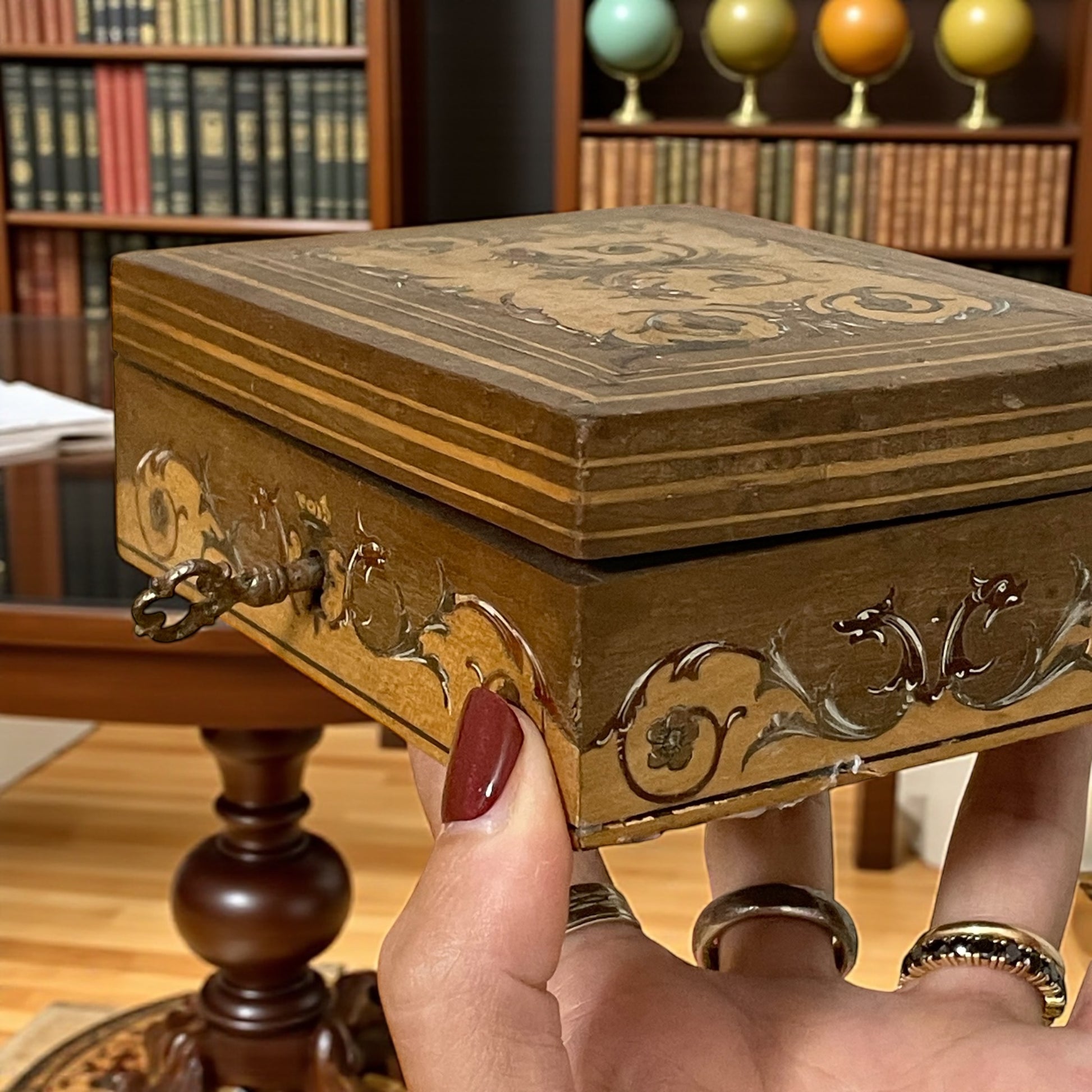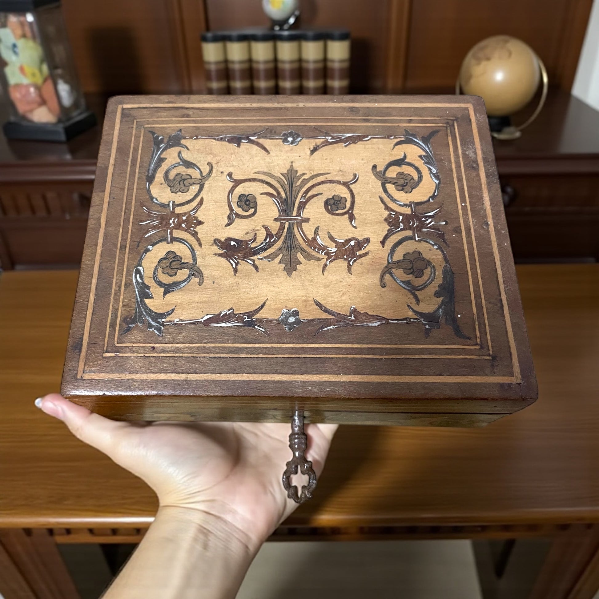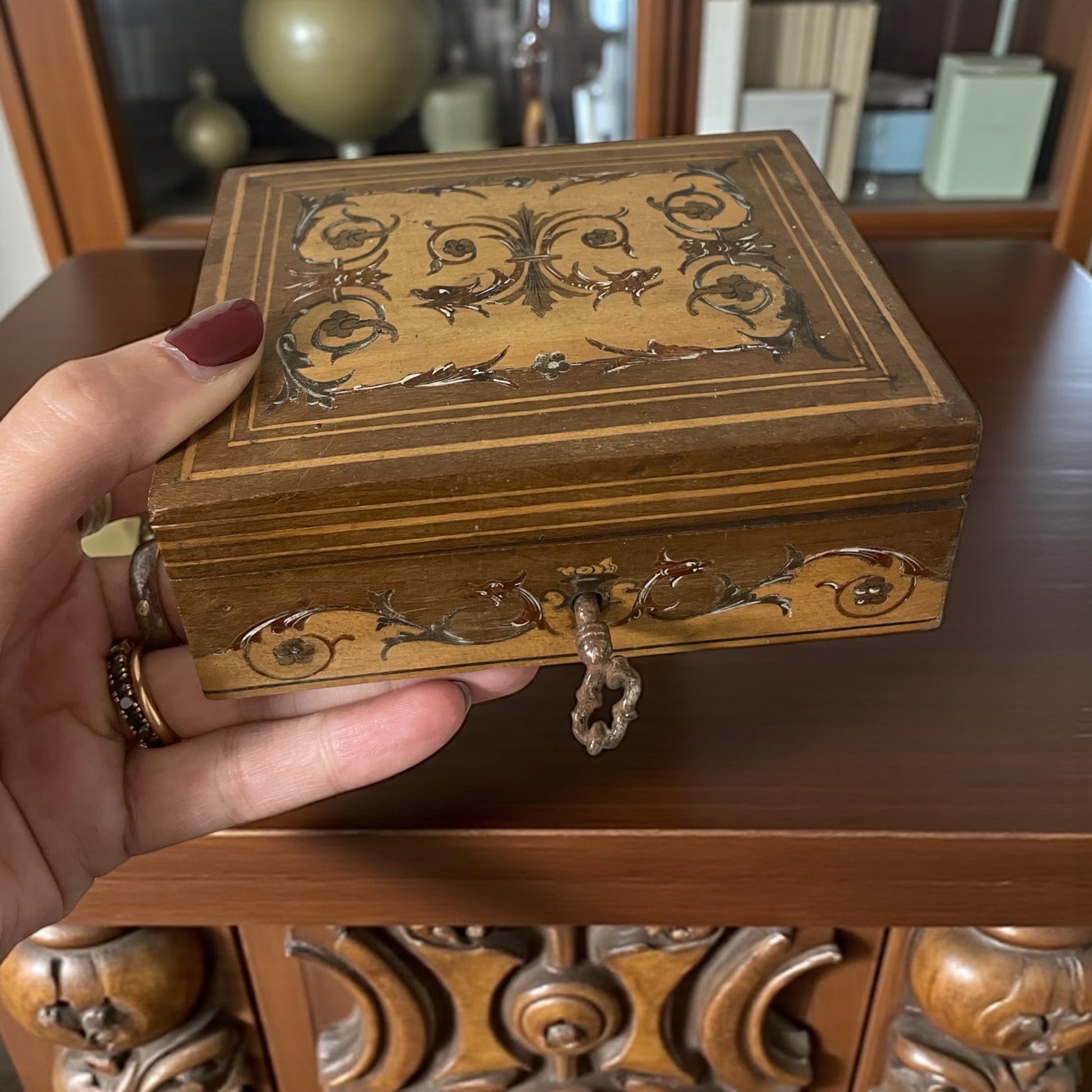 Un piccolo scrigno che racchiude l’eleganza dell’artigianato italiano di fine Ottocento. Realizzata in legno con intarsi floreali in altre fragranze e volute neorinascimentali, questa scatolina porta con sé la maestria delle botteghe di Firenze e Torino, come testimonia l’etichetta originale “P. Botto” ancora visibile sul fondo. Misura 12 x 10 cm, chiave originale presente ma serratura non funzionante (lieve disallineamento alla chiusura che lascia leggeremente sollevato il coperchio a dx). Un tempo fu pensata per custodire gioielli preziosi o ricordi, conserva qualche segno del tempo ma continua a raccontare storie di segreti accuratamente protetti.