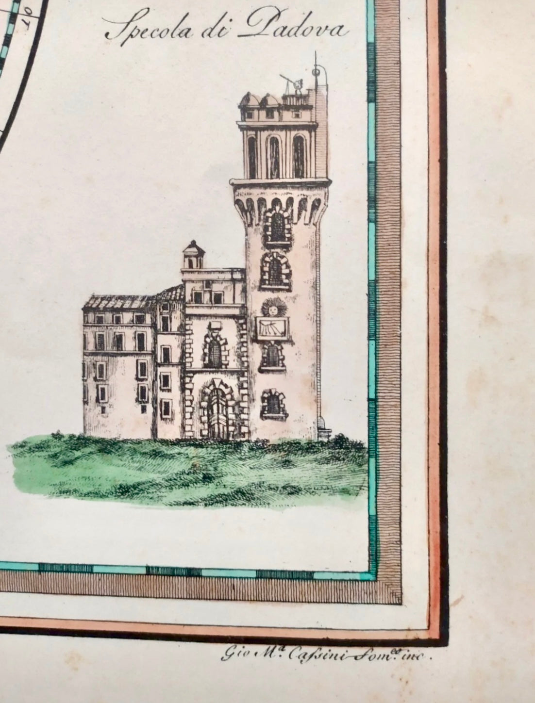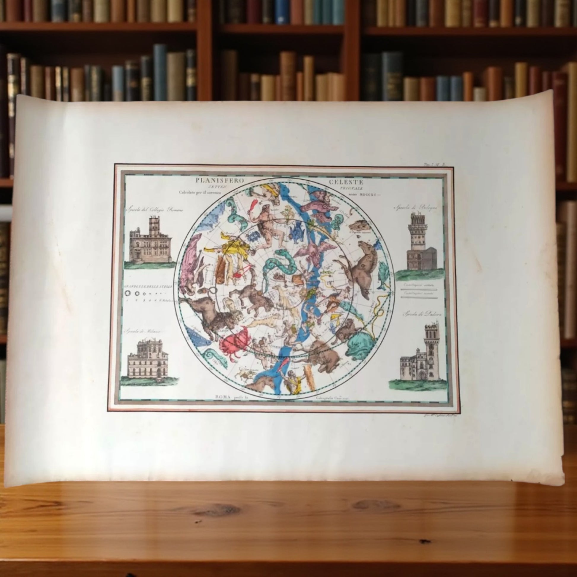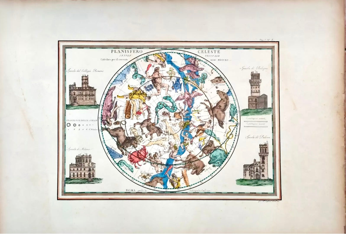 Planisfero Celeste Settentrionale – Giovanni Maria Cassini (Calcografia Camerale, Roma). Raffinata stampa calcografica acquerellata a mano, tratta dalle celebri lastre incise da Giovanni Maria Cassini (1745–1824), cartografo e incisore attivo a Roma tra XVIII e XIX secolo. L’opera, intitolata Planisfero Celeste Settentrionale, reca la data 1790 - anno di incisione delle matrici, e venne pubblicata dalla prestigiosa Calcografia Camerale di Roma. Le tavole furono ristampate per tutto l’Ottocento, sempre a partire dalle lastre originali, e colorate a mano secondo la tradizione dell’epoca. La mappa rappresenta il cielo boreale con le principali costellazioni zodiacali e figure mitologiche, arricchite da una resa artistica di grande impatto visivo. Ai lati compaiono le vedute di celebri osservatori astronomici italiani, tra cui la Specola del Collegio Romano, la Specola di Bologna e quella di Padova, testimonianza del fervore scientifico del tempo.