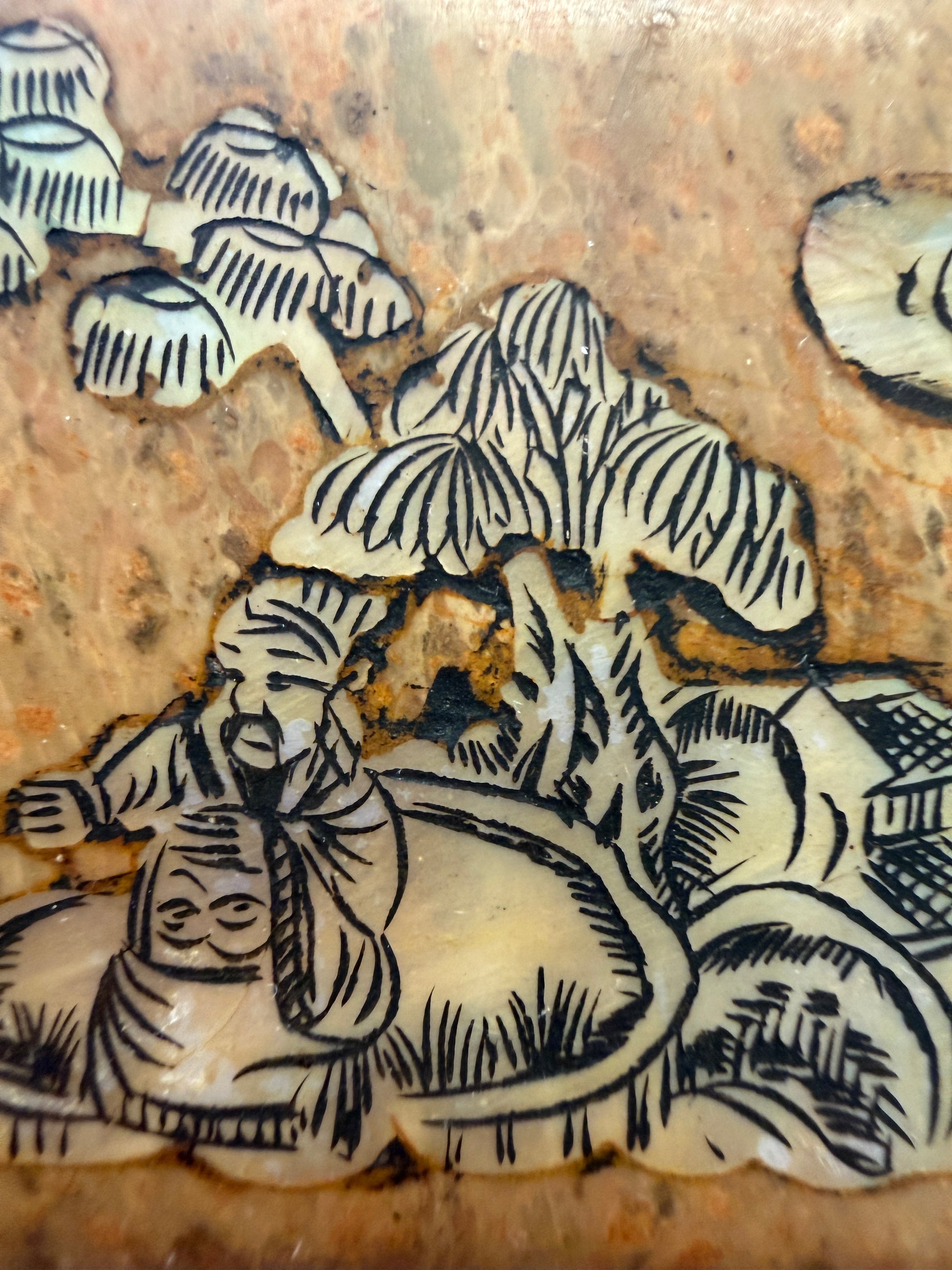 Plumier in pietra naturale (probabile steatite), con decorazioni a intarsio in madreperla incisa e pigmentata, lavorazione artigianale, produzione europea di ispirazione orientale, prima metà del Novecento (circa 1910–1940). Struttura rettangolare con coperchio incernierato ricavato nello stesso blocco di pietra. Buone condizioni generali, con patina del tempo coerente. Peso elevato.
