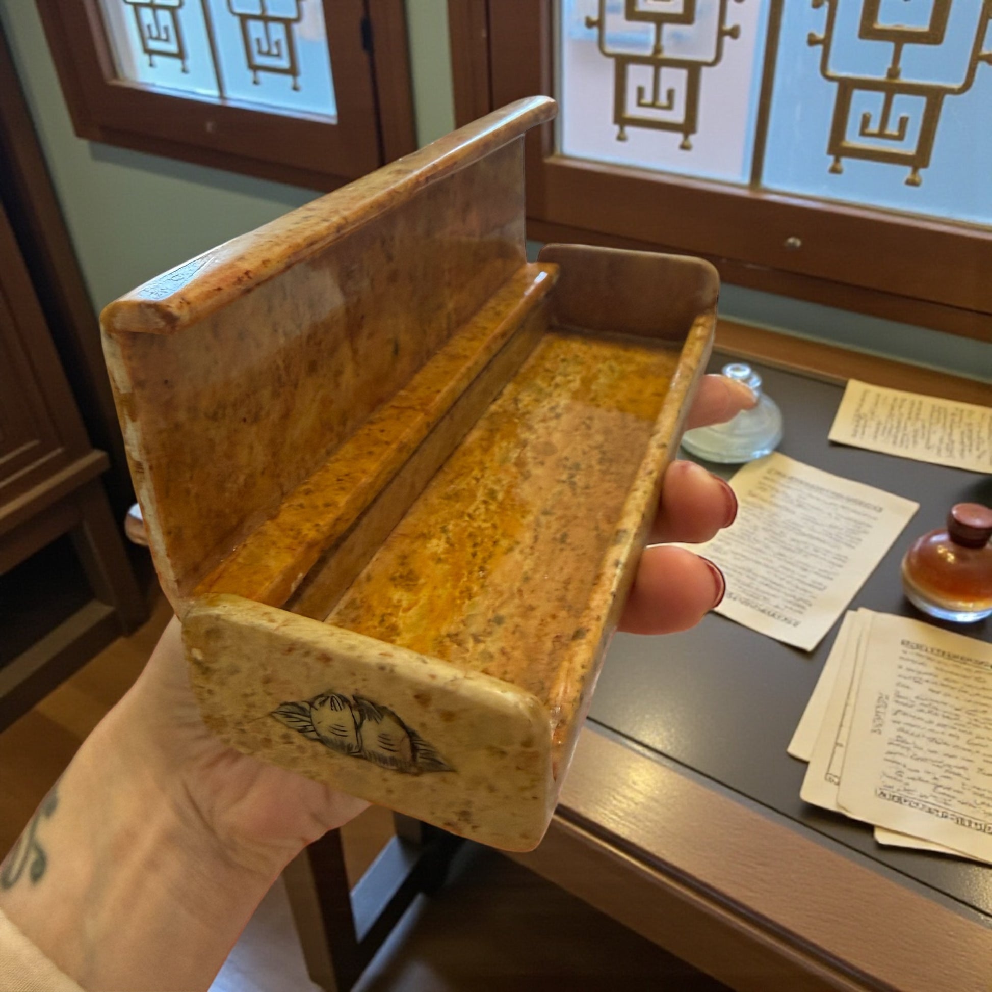 Non è un oggetto leggero, e non lo è mai stato. Appena lo prendi in mano senti la pietra piena, fredda, stabile, come se fosse stata pensata per proteggere qualcosa che non deve muoversi in fretta. Questo plumier nasce per accogliere strumenti sottili: penne, matite, uno stilo; quando scrivere significava fermarsi e scegliere le parole. La superficie in steatite è arricchita da intarsi in madreperla incisa, che raccontano una scena orientale silenziosa, sospesa, dove la luce si posa senza riflettersi mai del tutto. La madreperla non brilla: trattiene. È un oggetto che non chiede di essere aperto spesso, ma solo quando serve davvero.