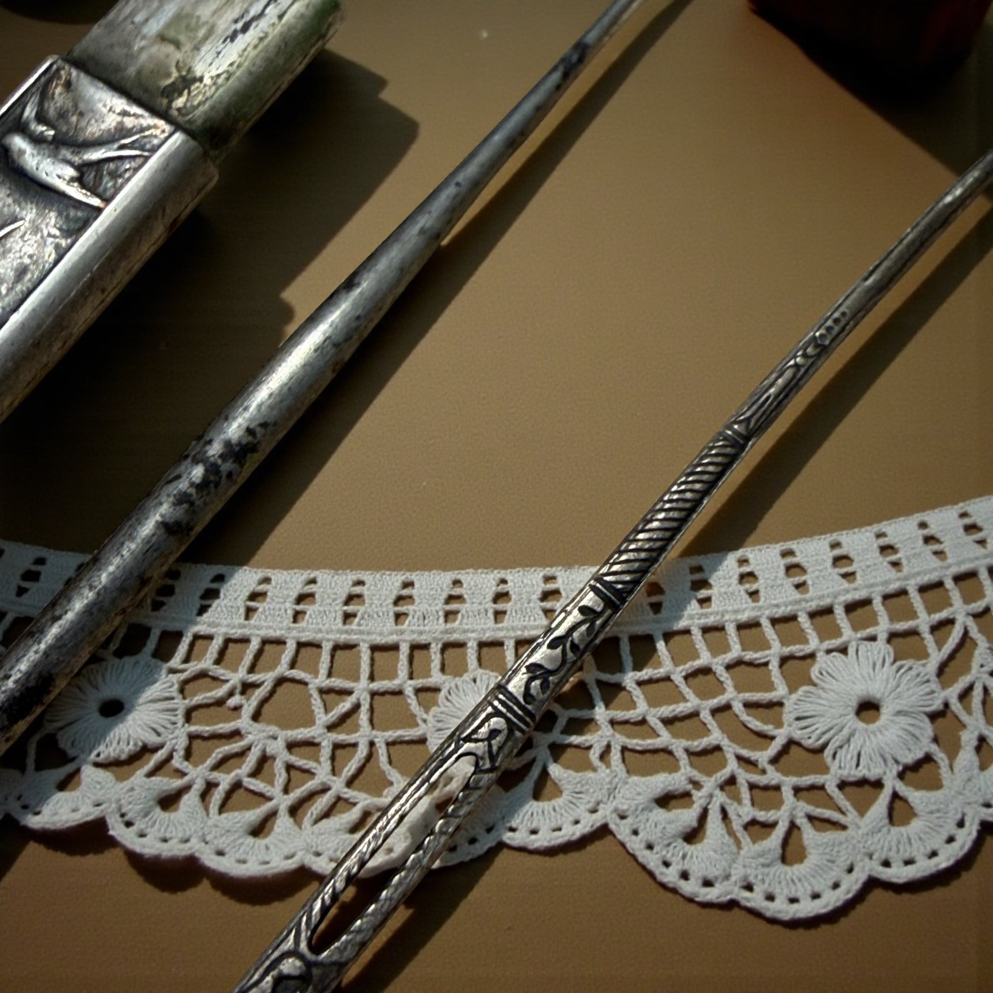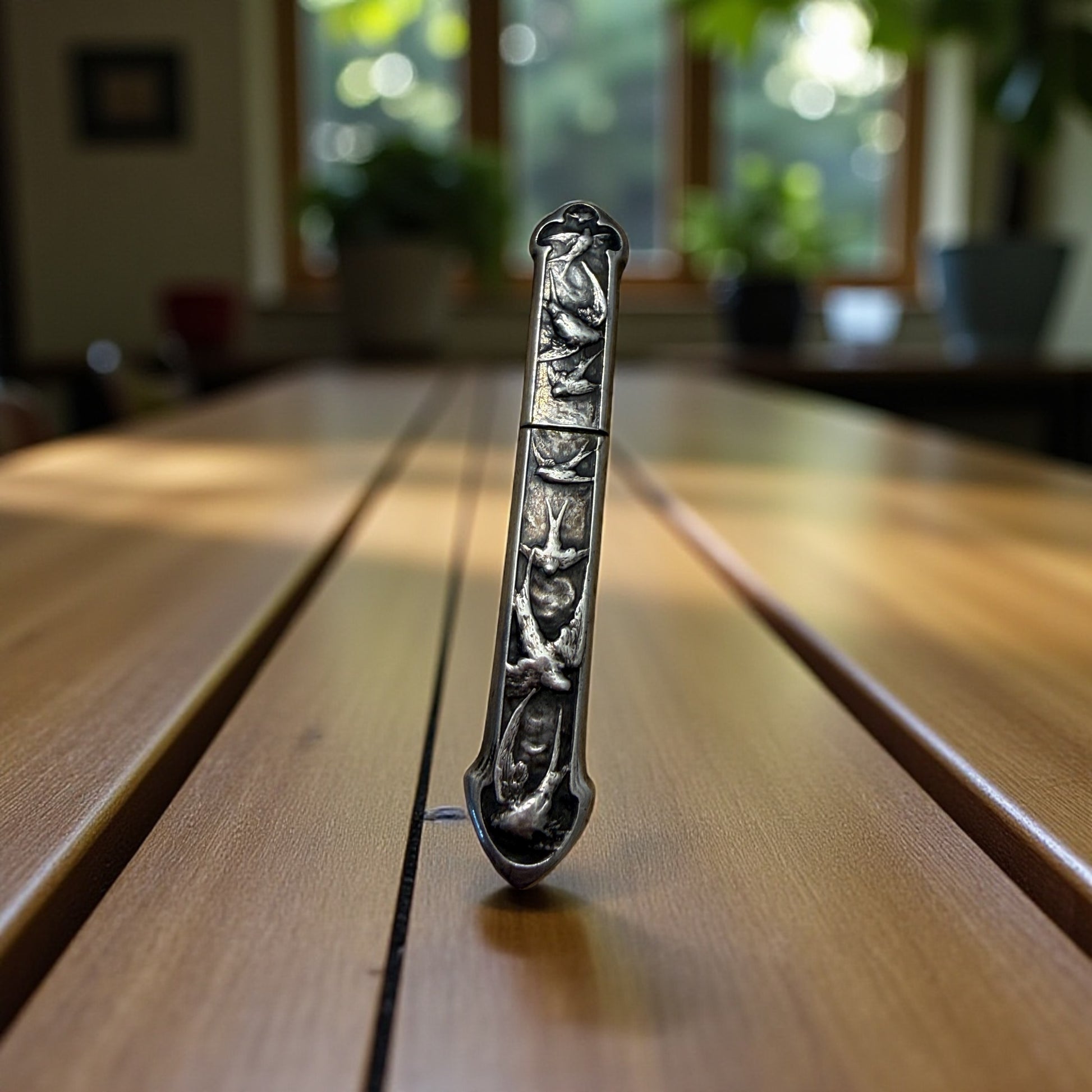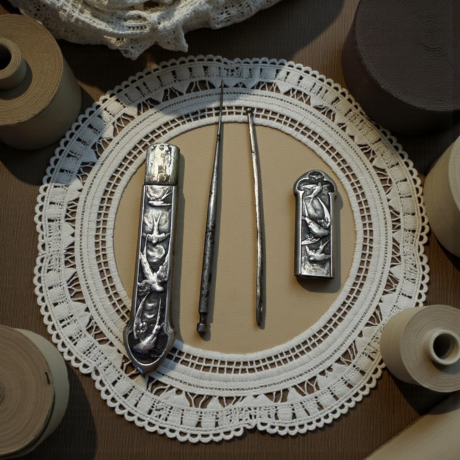 Rondini incise nell’argento, leggere come un pensiero che attraversa il tempo. Quando ho aperto questo piccolo porta-aghi francese, ho immaginato una donna di fine Ottocento che, vicino alla luce morbida di una finestra, sistemava i nastri della sua biancheria con gesti calmi e precisi. Dentro ci sono i suoi due strumenti originali: un bodkin in argento pieno, finemente cesellato e punzonato, nato per accompagnare i nastri dentro corsetti e corpetti e un poinçon, il piccolo punteruolo da ricamo usato per aprire trame e guidare fili delicati. Sono oggetti minuscoli ma pieni di poesia: strumenti silenziosi di un’epoca in cui la cura richiedeva lentezza, e la bellezza si nascondeva nei dettagli più piccoli. Il cesello e la sua finezza parlano da soli. La rondine, simbolo di eterno ritorno, corona questo sogno d’argento.