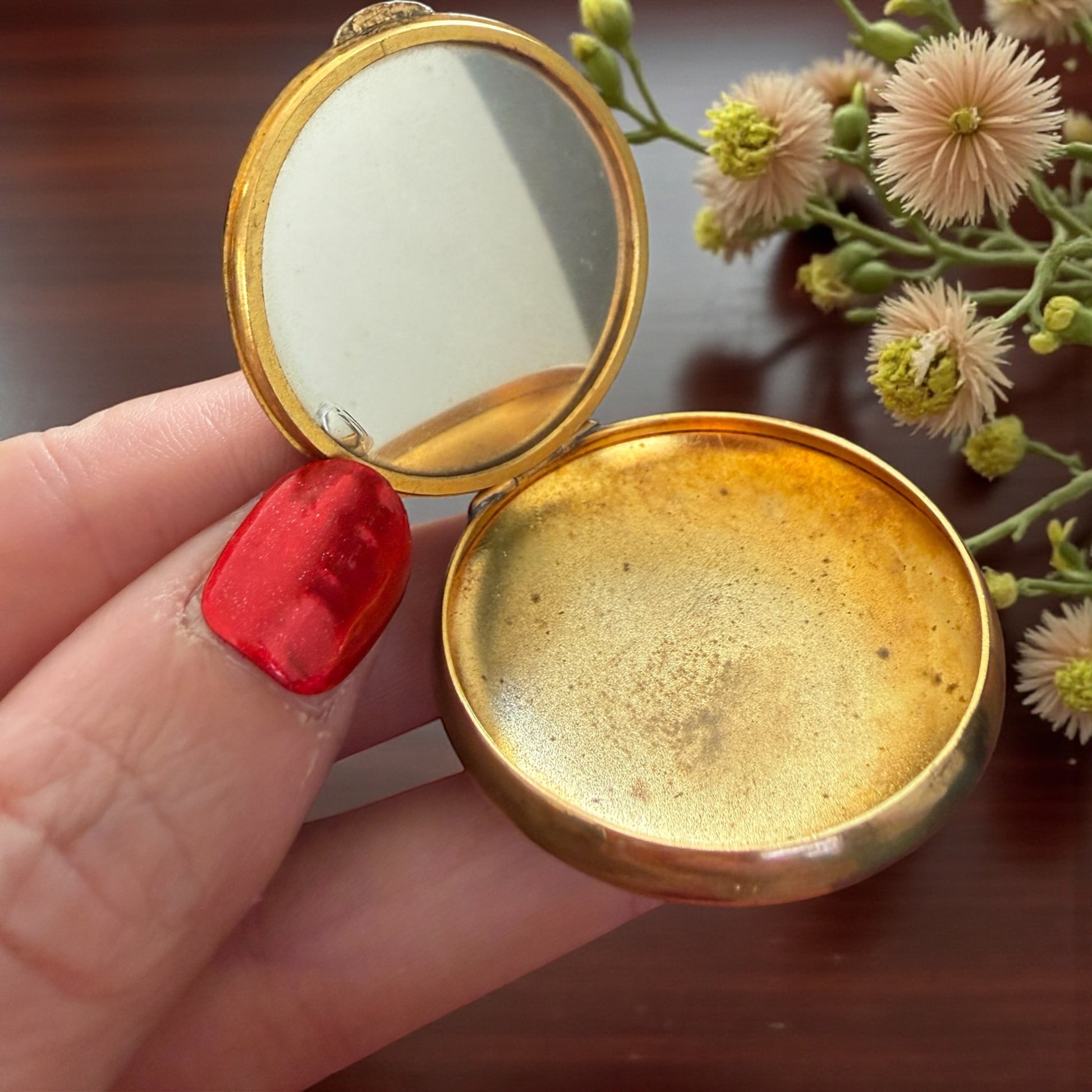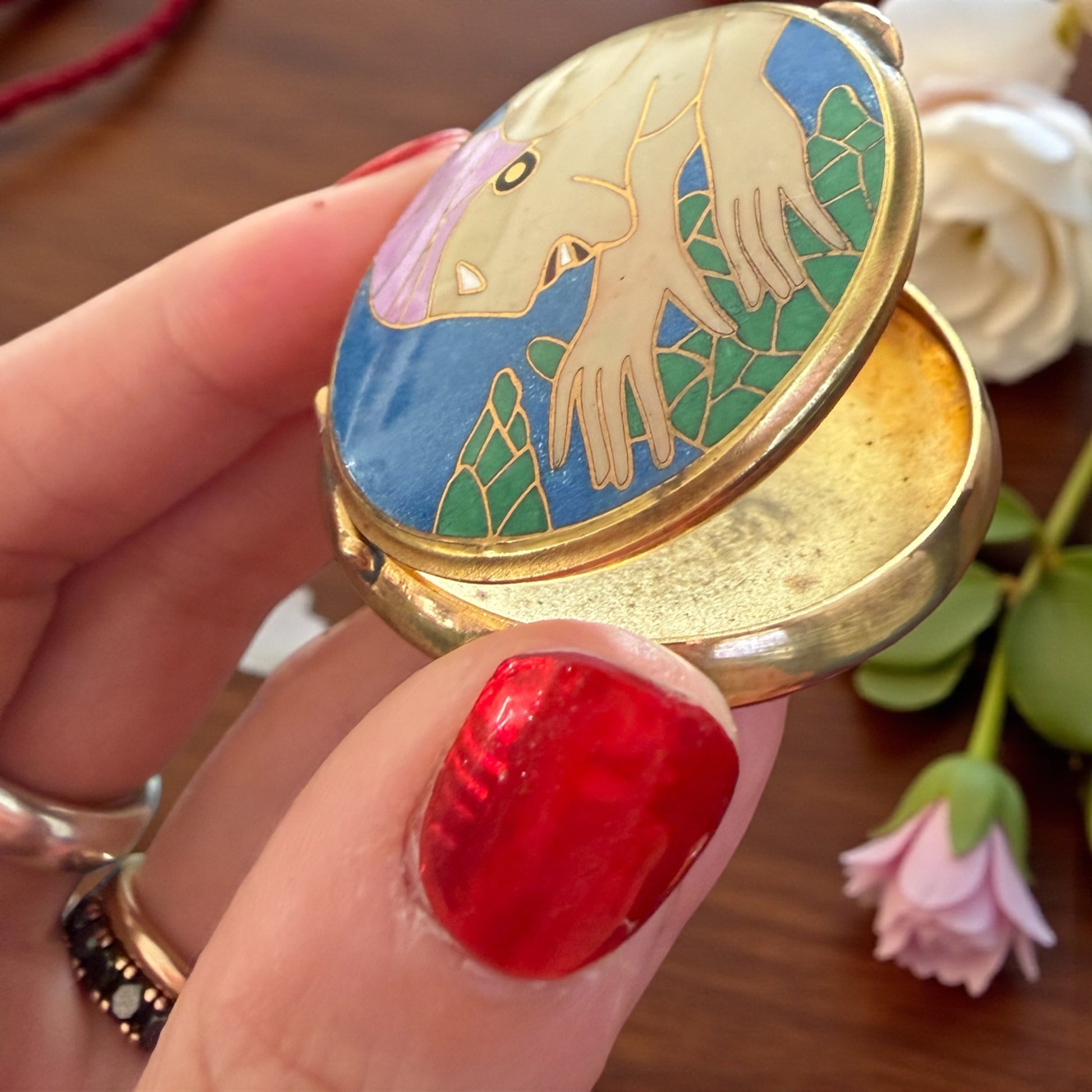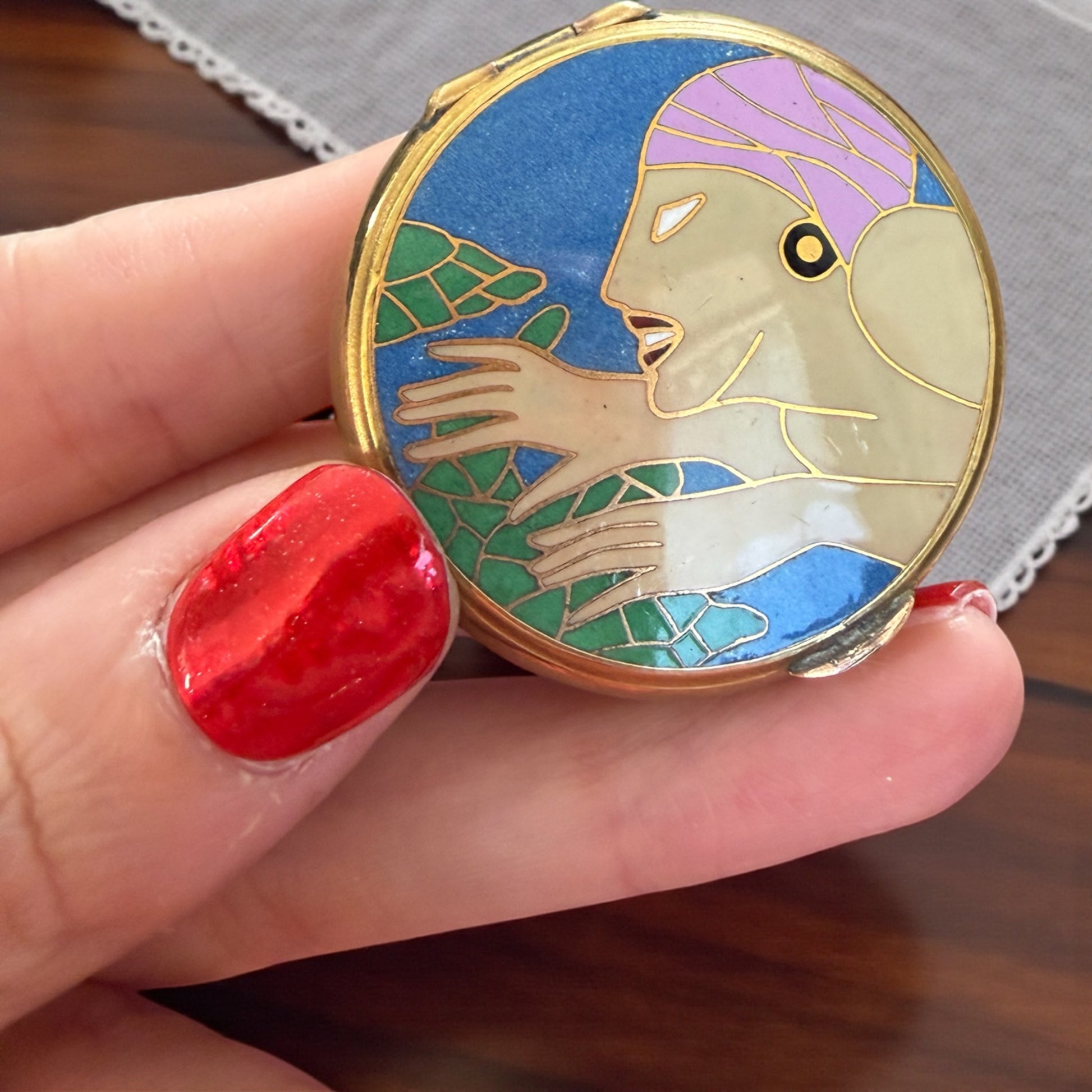 Portacipria compatto da borsetta in ottone dorato con decorazione a smalto.