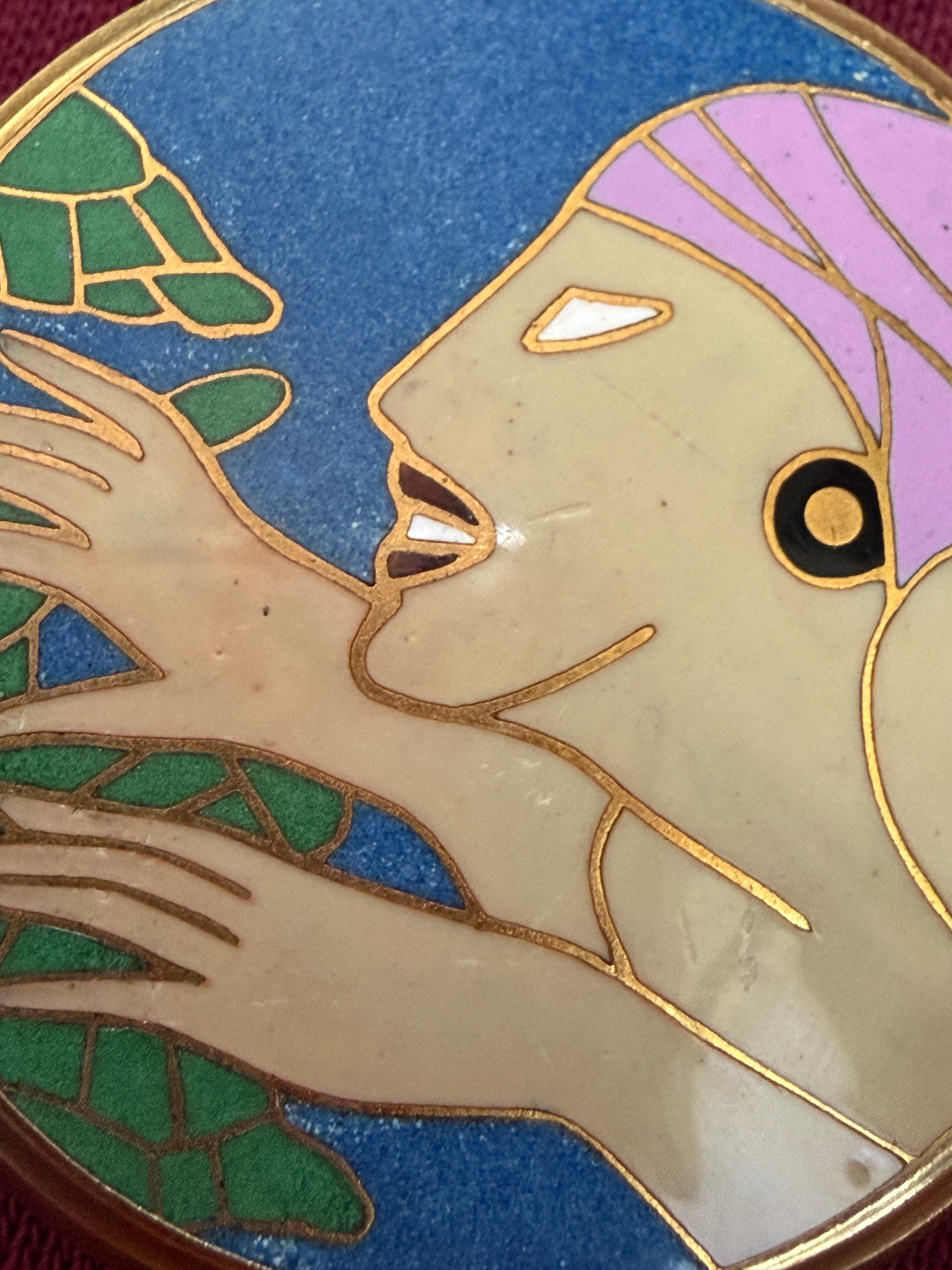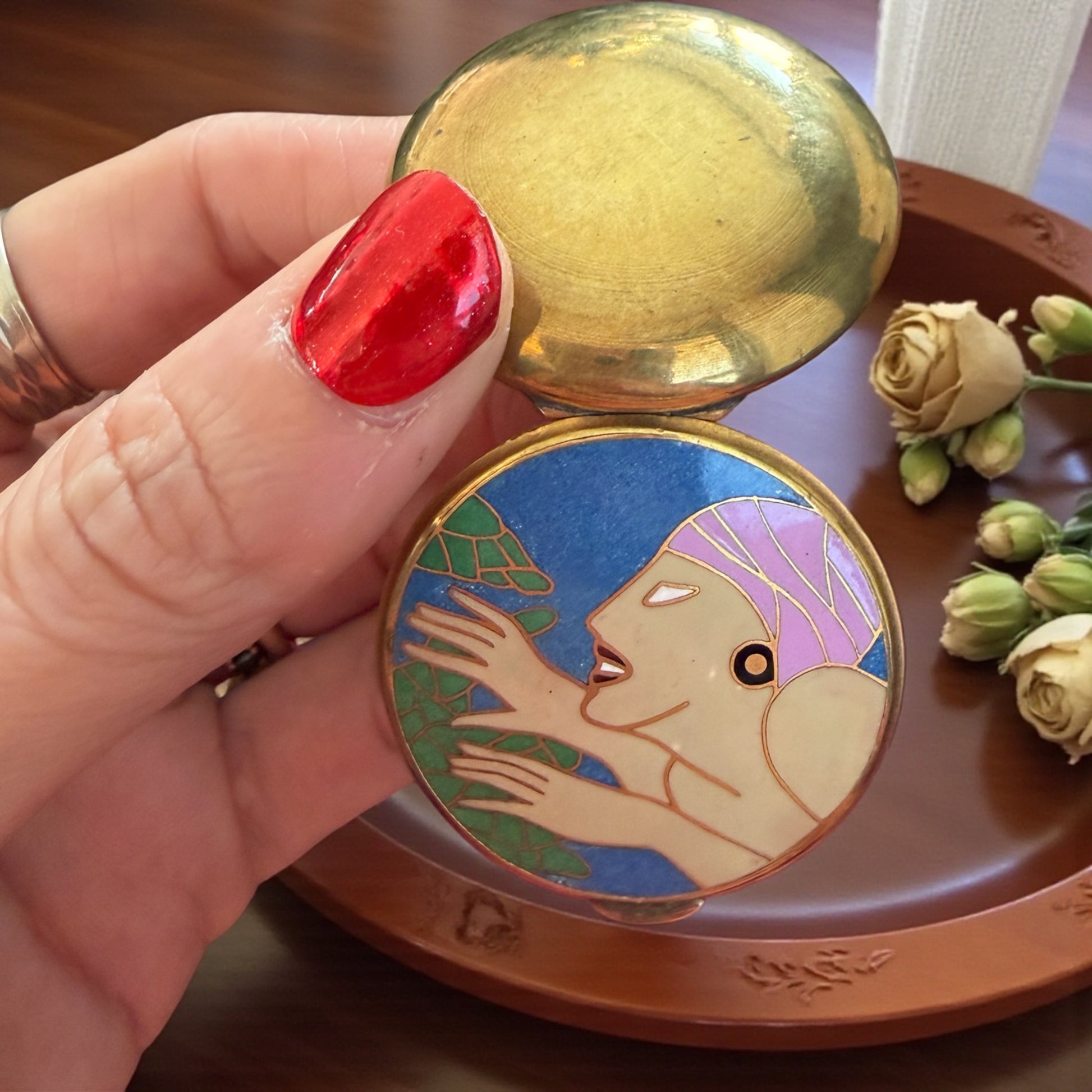 Una donna si sporge verso una testuggine, le mani aperte, come se stesse per accogliere o per danzare. Questo piccolo portacipria racconta un tempo in cui anche il gesto più quotidiano — ritoccare il viso — diventava un rituale elegante. La figura femminile, sospesa su un blu profondo, sembra muoversi ancora oggi leggera e consapevole; con quella grazia tipica degli anni Trenta. Pensato per stare in una borsetta, accompagnava le donne nella vita di ogni giorno: un oggetto intimo, personale, silenzioso. All’interno conserva lo specchio originale, con una lieve traccia del tempo che non disturba, ma ricorda che è stato vissuto. Un piccolo compagno di viaggio, discreto e poetico, capace di attraversare decenni senza perdere fascino e soprattutto carattere.