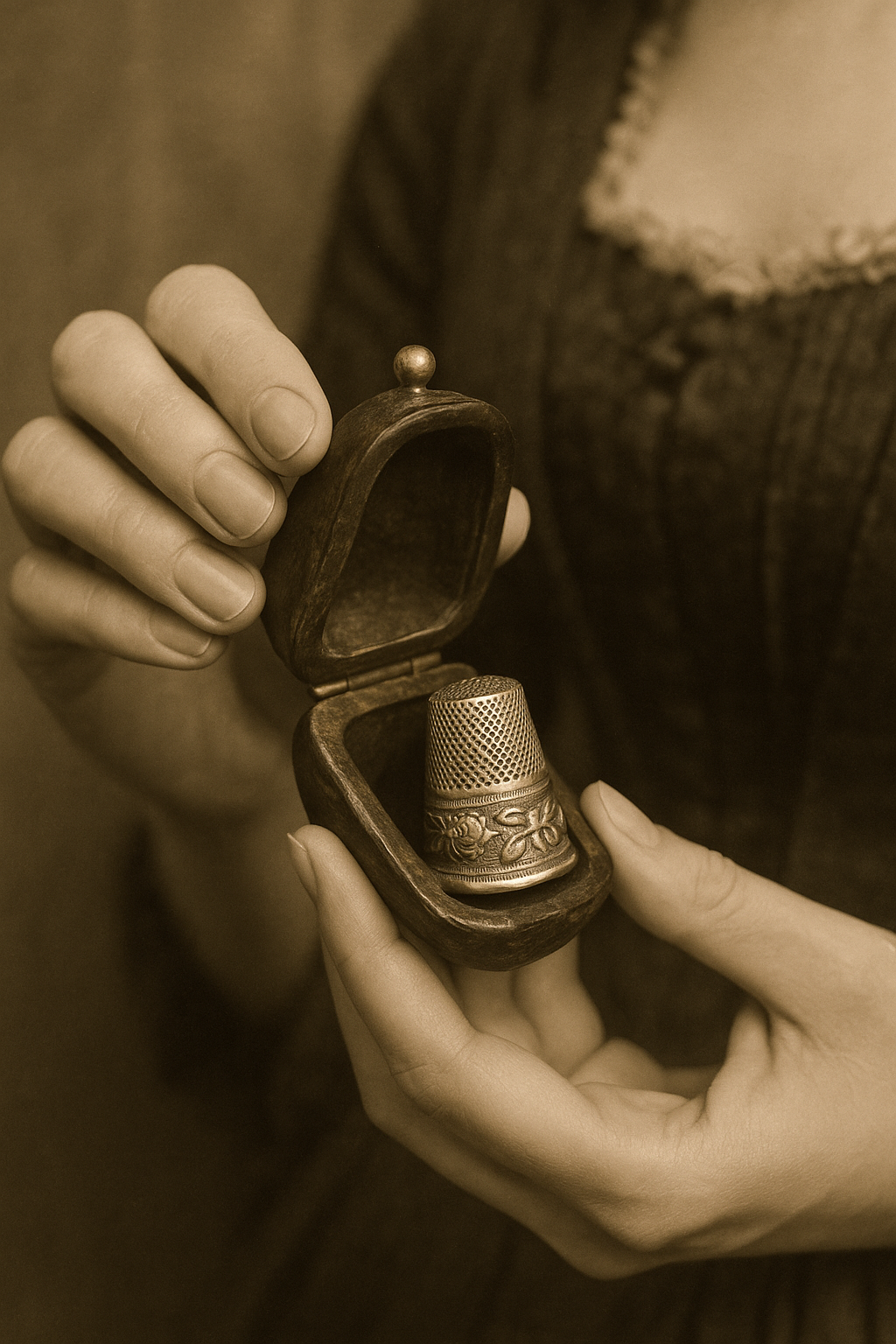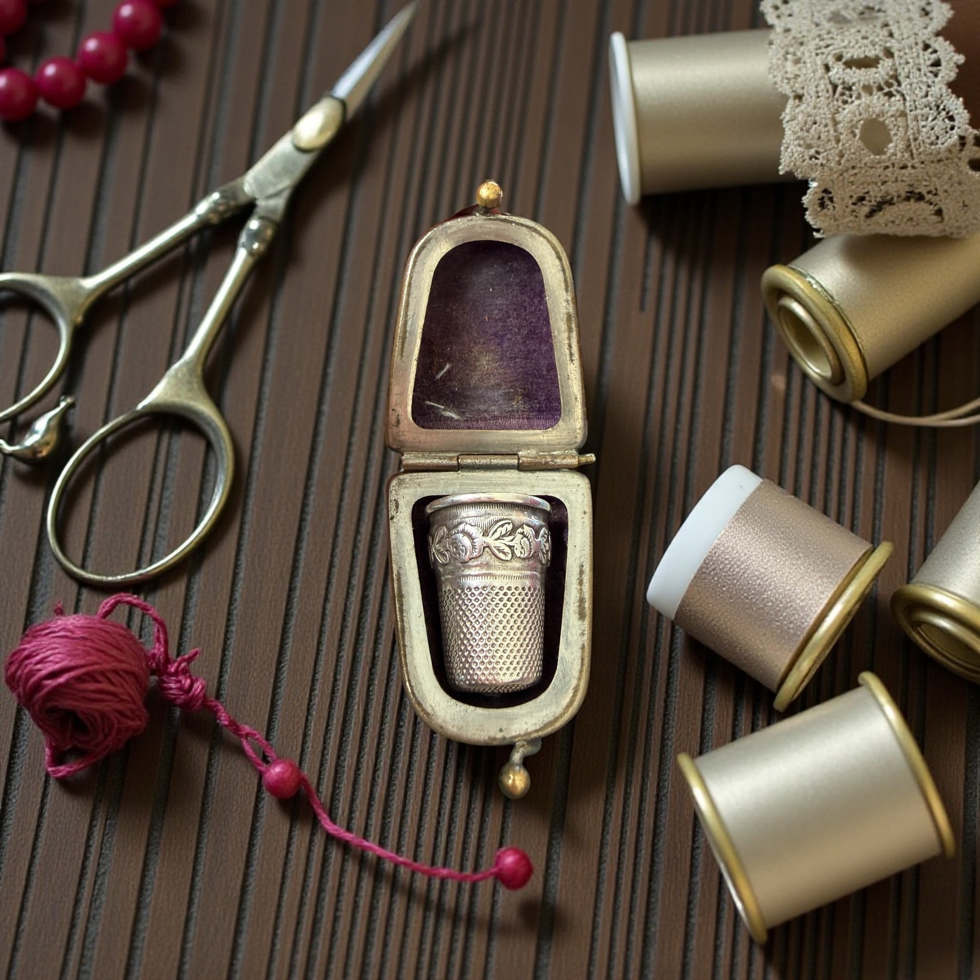 Un piccolo scrigno che protegge le mani e le storie di chi crea. Aprendolo si compie un gesto antico: quello di una donna di fine Ottocento che, prima di sedersi alla luce di una lampada a olio, prendeva l’astuccio dalla sua borsa da lavoro. Il cuoio, oggi scurito e consumato dal tempo, era allora liscio, compatto, quasi lucido. L’apertura scattava con lo stesso suono che senti anche adesso: un clic dolce, preciso, che annuncia qualcosa di prezioso. Dentro, adagiato sul velluto viola c’è il ditale in argento. Le rose incise a bulino, le piccole foglie che corrono lungo il bordo… dettagli che parlano di mani pazienti, di fili tesi, di lavori silenziosi che tenevano in piedi una casa, una famiglia, un tempo. E più lo guardi, più capisci che questo non è solo un porta-ditale: è un piccolo talismano del fare, un simbolo della creatività, della protezione e della precisione. Un dono perfetto per chi cuce, crea, ripara; per chi ama trasformare le cose; per chi vuole ricordarsi che anche le mani possono custodire storie. L’astuccio, in cuoio pressato laccato, ha viaggiato per oltre un secolo. Il ditale, in argento autentico, ha protetto dita e idee. Uniti, formano un piccolo universo: il gesto di aprirlo e chiuderlo è quasi meditativo, una porta tra passato e presente. Un oggetto così non si limita a essere usato: accompagna. Protegge. Ricorda. E chi lo riceve non porta con sé solo un pezzo d’epoca, ma un invito a continuare la trama lasciata da chi è venuto prima.