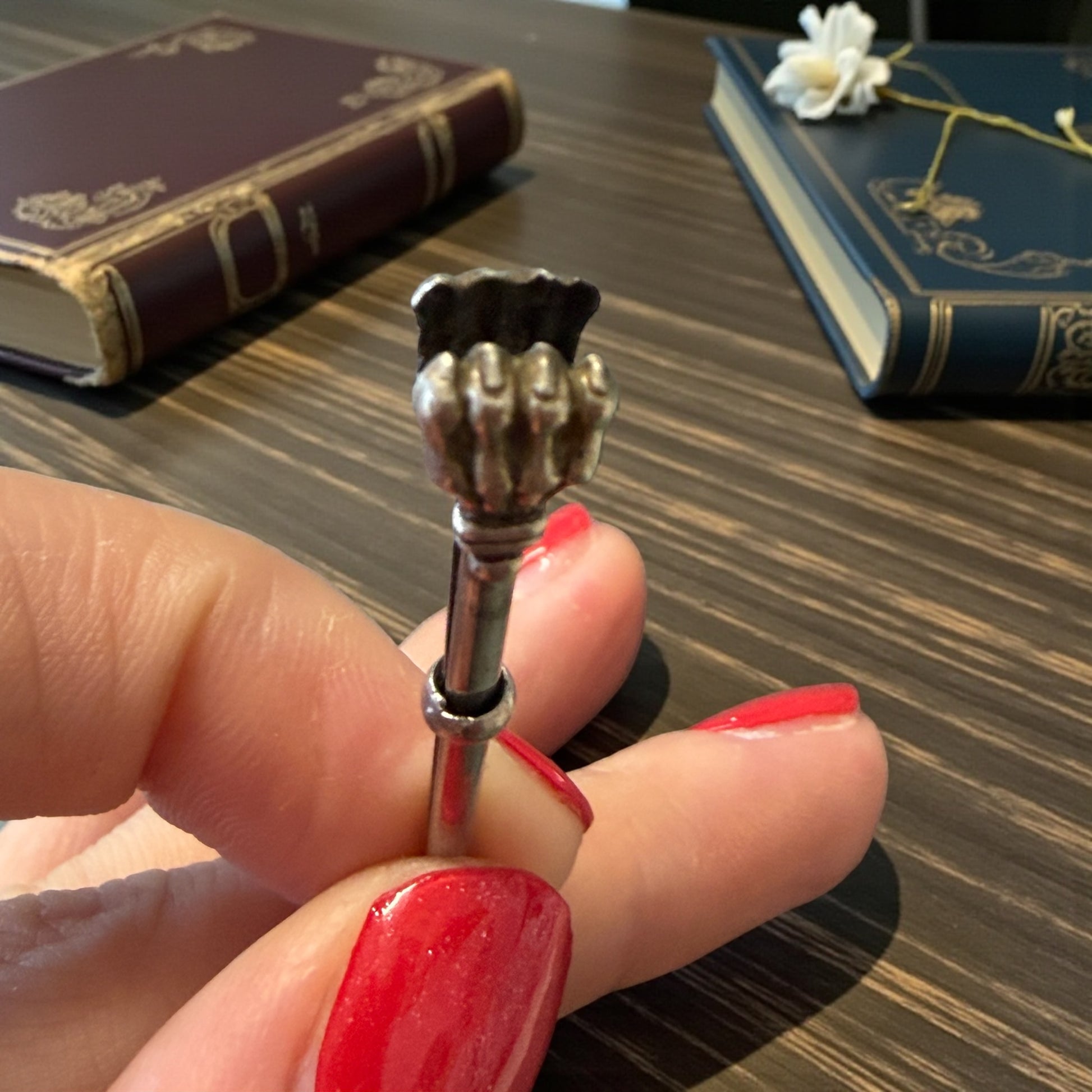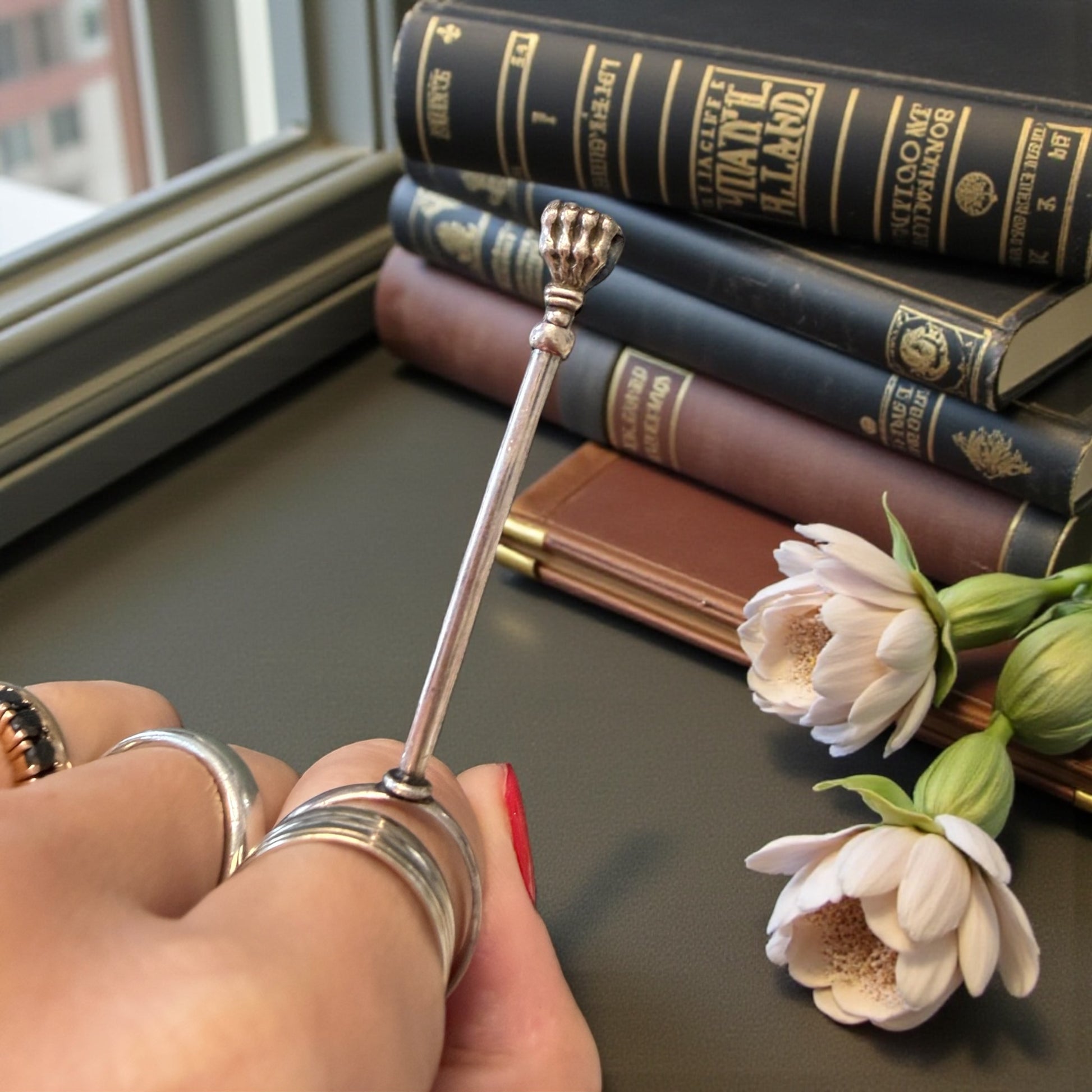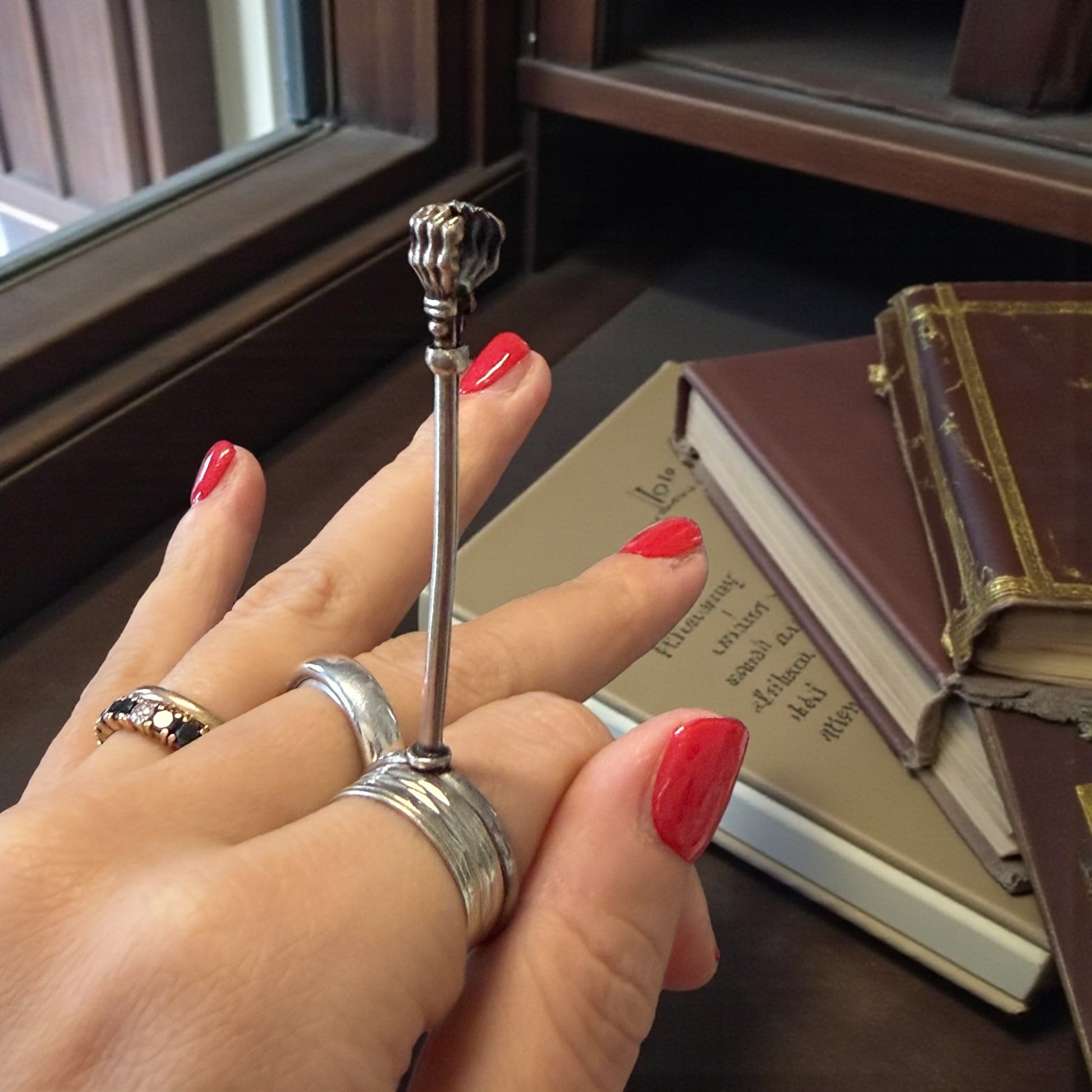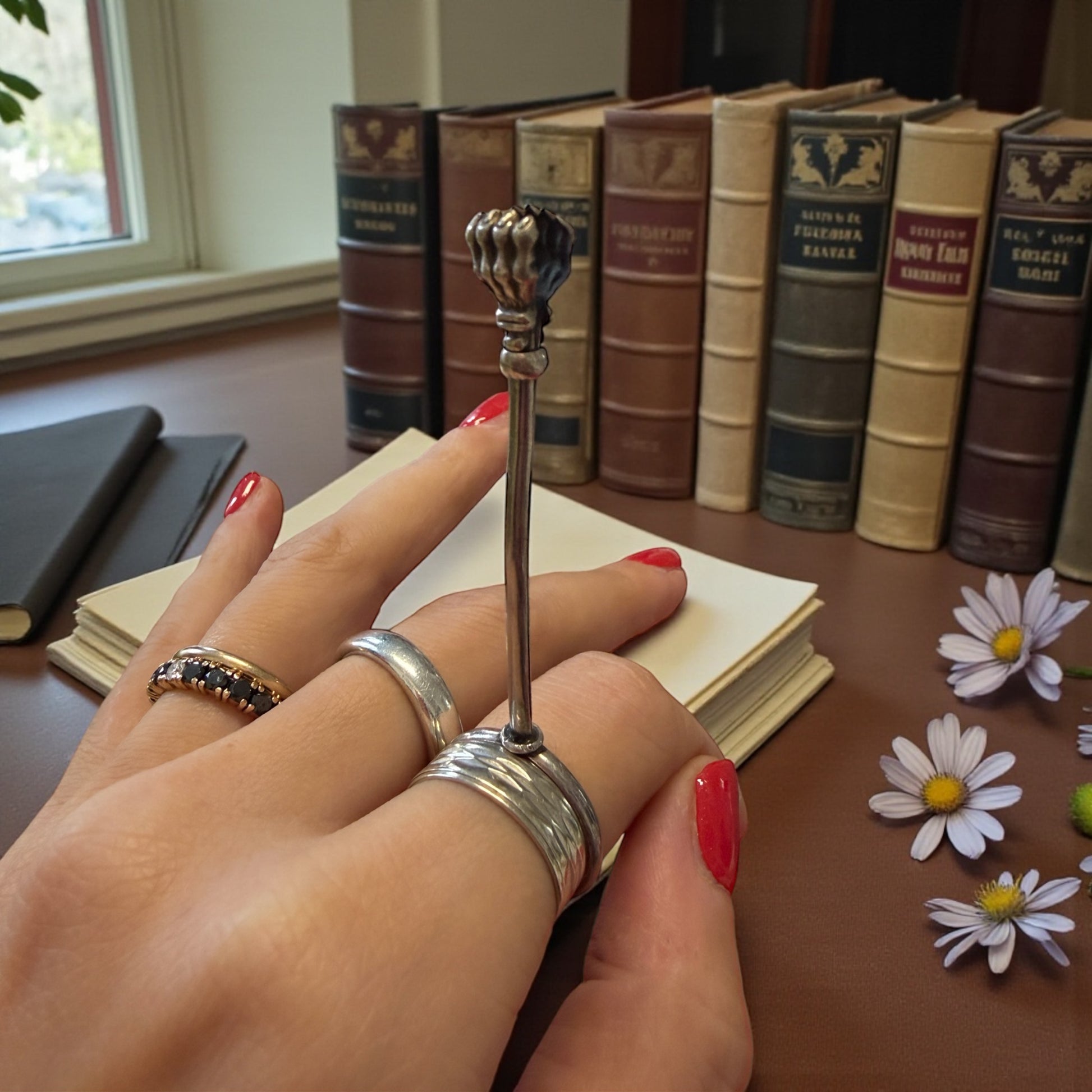 Un gesto piccolo, quasi teatrale, che racconta un’epoca intera. Bastava infilare l’anello al dito, regolare l’asta con un lieve scorrere, e la sigaretta trovava posto tra le zampe leonine: eleganti, decise, simboliche. Questo raffinatissimo porta-sigaretta da dito francese in argento nasce per accompagnare i gesti lenti e misurati della Belle Époque. Non un semplice accessorio, ma un’estensione del corpo: pensato per chi fumava conversando, leggendo, osservando il mondo senza fretta. La testa terminale a zampe leonine, potente e decorativa, richiama il gusto francese per l’allegoria e il dettaglio simbolico. L’asta regolabile, ingegnosamente calibrata tramite anellino scorrevole, testimonia una manifattura attenta all’uso reale, non solo all’estetica. Tenendolo tra le dita, si avverte il peso giusto dell’argento e quella sensazione inconfondibile degli oggetti nati per durare, per accompagnare una quotidianità elegante e consapevole. Non chiede di essere esibito: funziona ancora oggi come allora, con la stessa discreta autorevolezza. E soprattutto è un oggetto estremamente raro, un gioiello prezioso da concedersi.