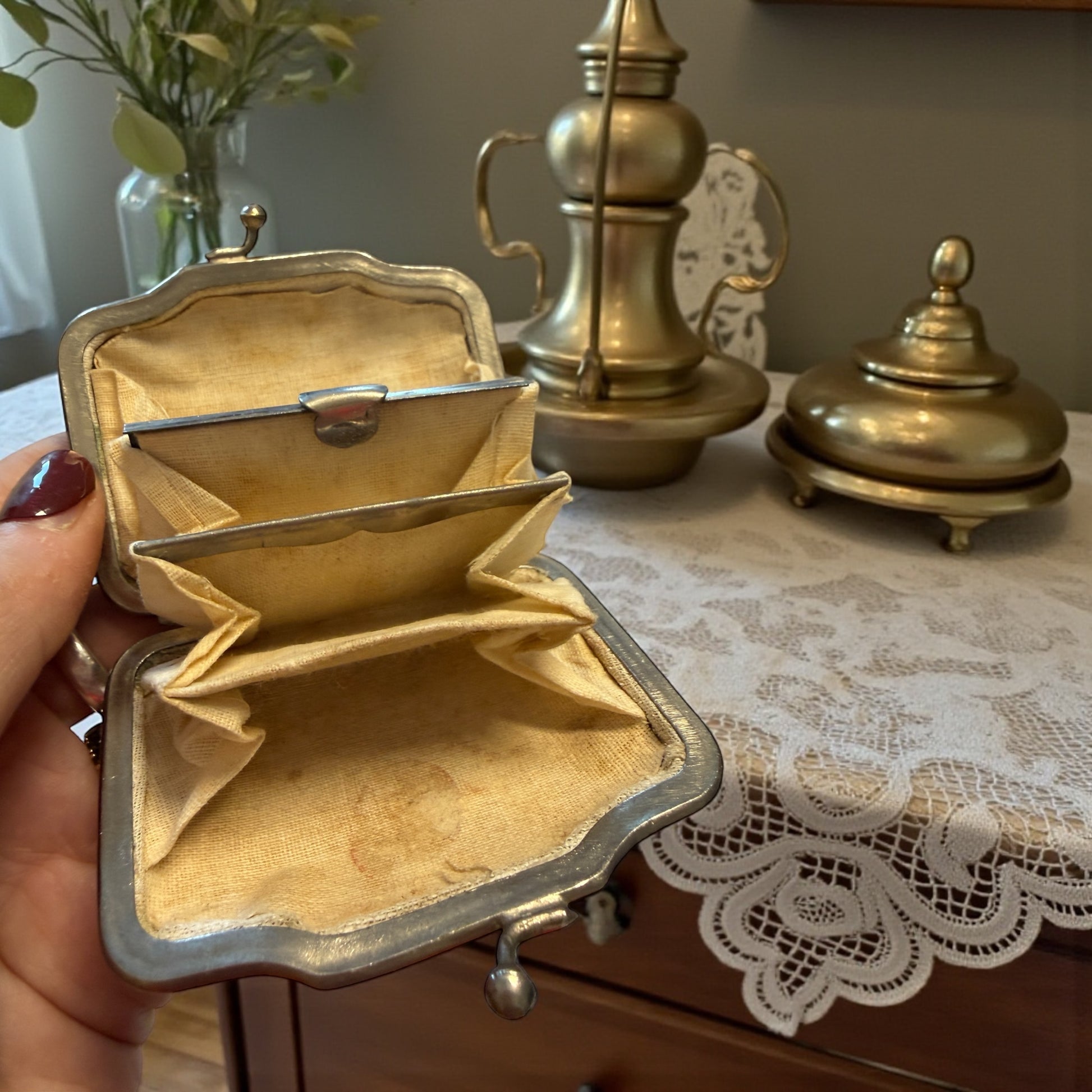 Portamonete vintage da borsetta, Francia, anni ’20–’40 (stile tardo Liberty / inizi Déco). Materiale: bachelite color avorio e metallo argentato. Interno: tre scomparti con foderina in tessuto originale. Condizioni: segni del tempo coerenti con l’età; meccanismo a scatto funzionante.