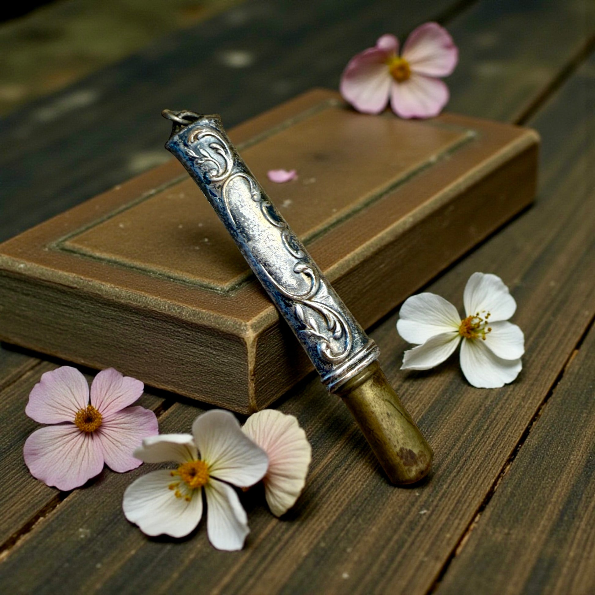 C’è qualcosa di profondamente intimo negli oggetti che uniscono la scrittura alla protezione. Questo piccolo portamatita da chatelaine sembra nato per accompagnare una donna nella sua quotidianità: una nota scritta in fretta, un pensiero annotato, una lista, mentre al centro, discreta ma presente, la Madonna col Bambino veglia sul gesto. Il metallo placcato argento racconta il tempo con naturalezza, lasciando emergere qua e là l’usura di una vita vissuta davvero. Le decorazioni floreali scorrono morbide lungo il corpo, mentre sul retro resta volutamente uno spazio silenzioso, pensato per accogliere un monogramma che forse non è mai stato inciso. Un oggetto nato per essere utile, oggi capace di diventare pendente, talismano, memoria da portare vicino al cuore. Oggi diventa un pendente da collana curioso e meraviglioso. Che tipo di storia immagini per chi lo ha indossato per primo?