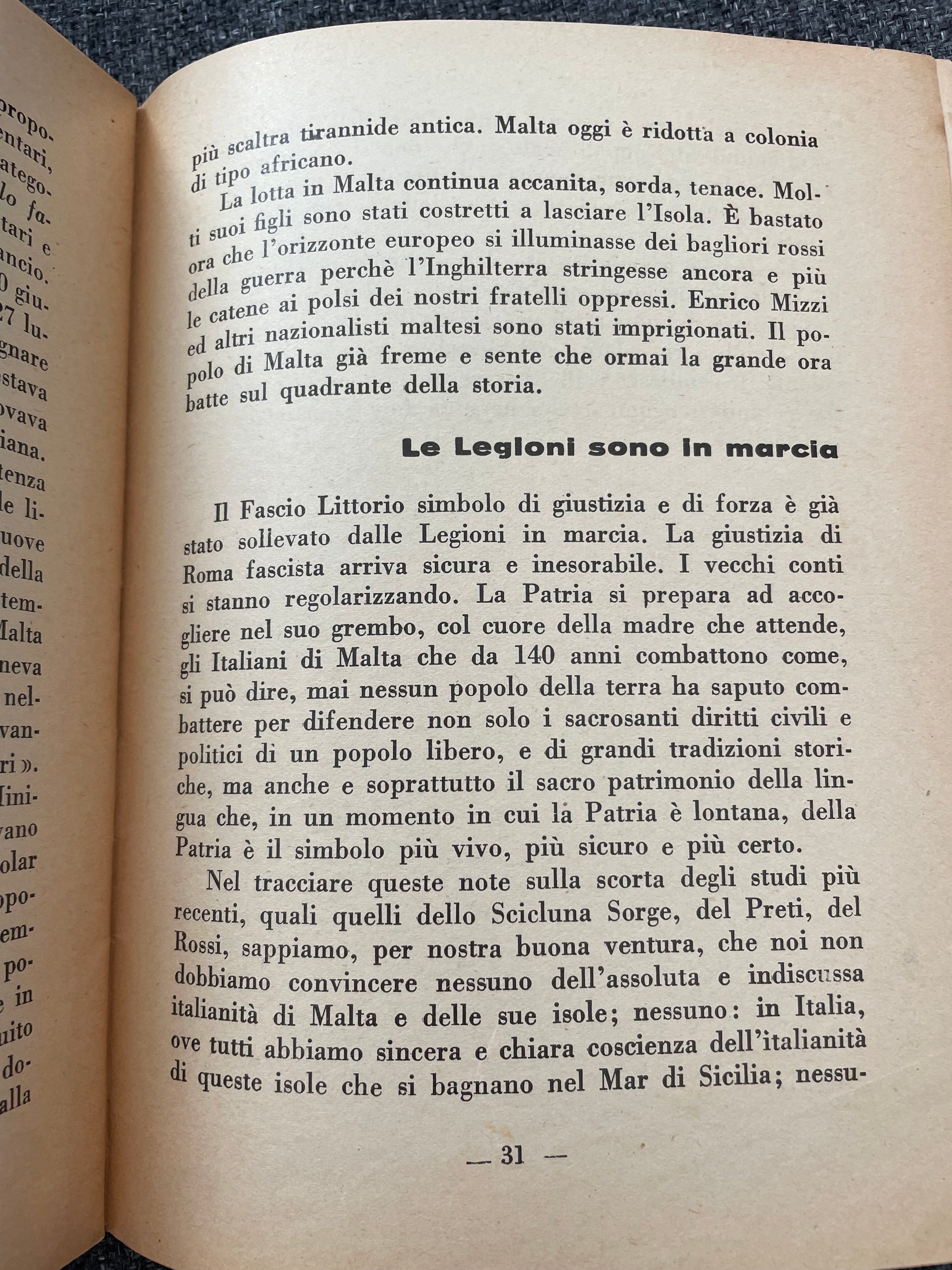 Ci sono pagine che raccontano il Novecento meglio di qualsiasi lezione. Questa pubblicazione del 1941, intitolata semplicemente “Malta”, è un documento storico originale stampato a Roma durante la Seconda Guerra Mondiale. Testimonia non solo il valore strategico dell’isola nel Mediterraneo, ma anche l’interpretazione geopolitica italiana dell’epoca. All’interno si trovano mappe d’epoca, riferimenti storici e interpretazioni politiche del tempo, che oggi permettono di comprendere il clima culturale e comunicativo del periodo. È un esempio autentico di pubblicazione storico-propagandistica, utile per ricerca, studio, archivio o collezione. La carta è quella tipica delle edizioni di guerra: leggera, economica, pensata per la diffusione rapida di contenuti divulgativi. Come ogni documento sopravvissuto a oltre 80 anni di storia, porta con sé un valore archivistico concreto: è testimonianza, non opinione.