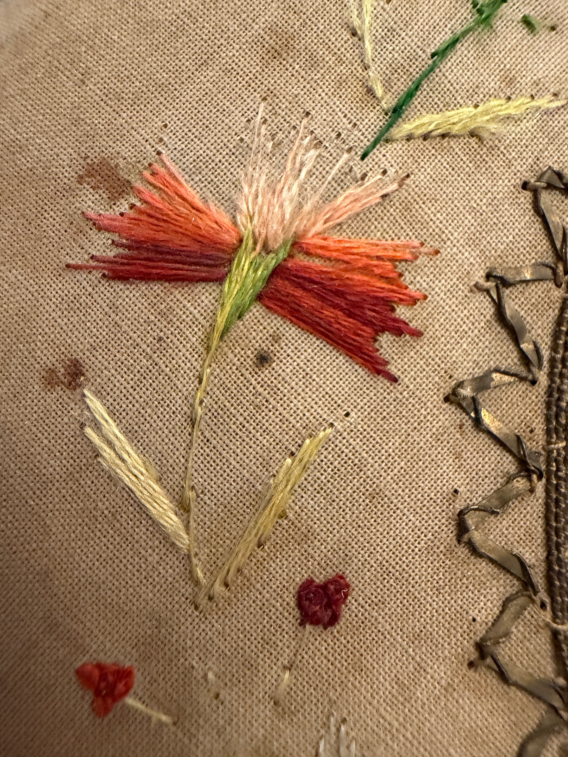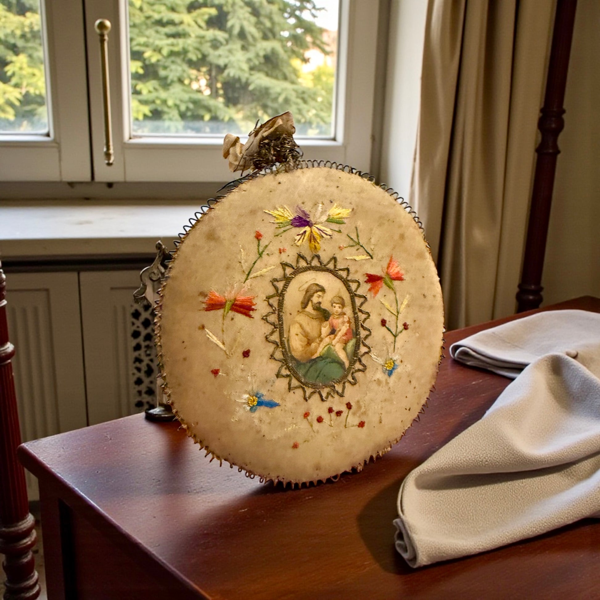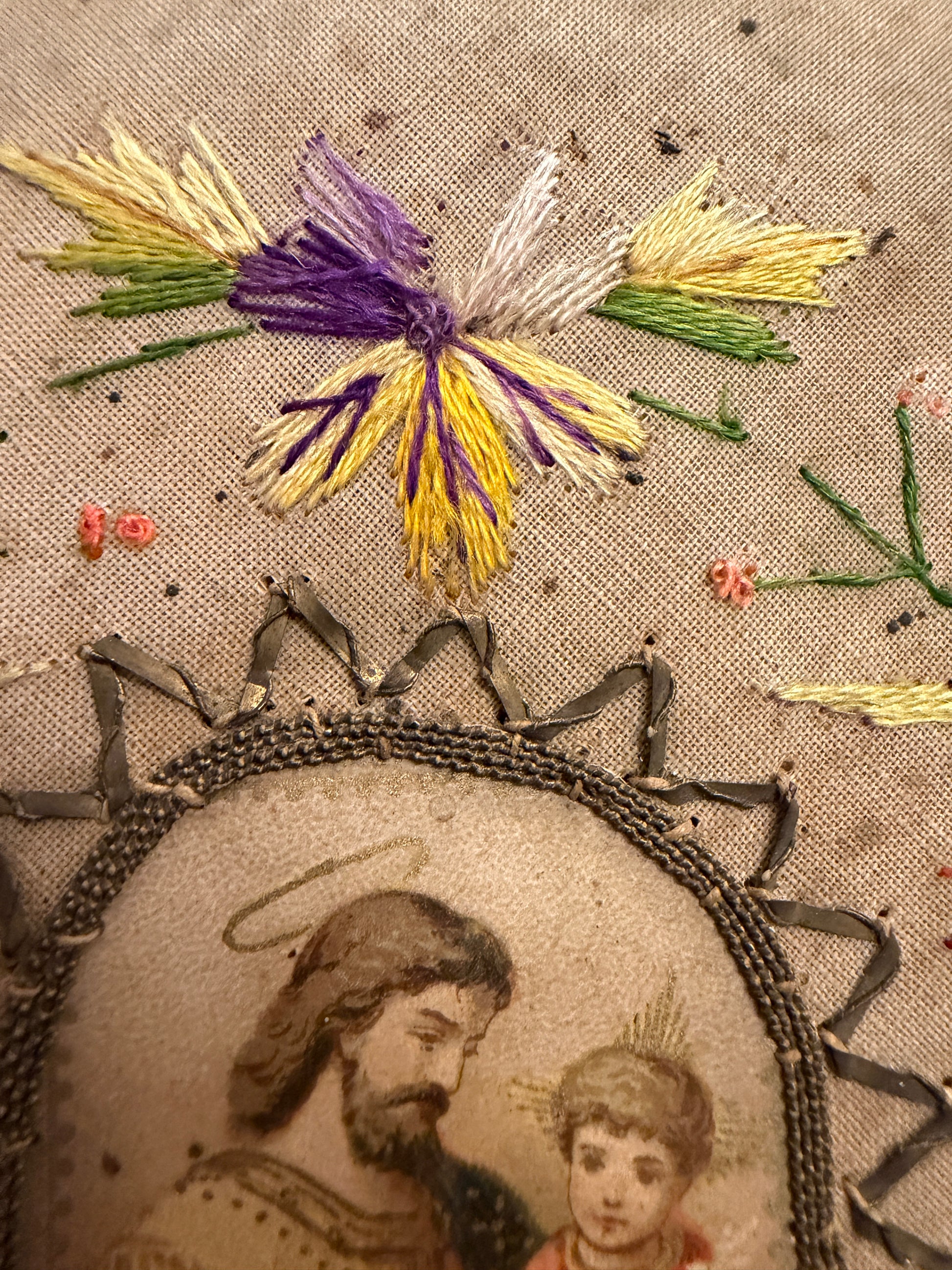 Non nasce per essere visto. Nasce per essere ricordato. Questo ricamo non è un oggetto decorativo: è un gesto. Un gesto lento, paziente, fatto punto dopo punto per tenere vicino qualcuno che non c’era più. Al centro, San Giuseppe e il Bambino: una scena intima, quasi domestica, scelta non per la solennità ma per la protezione. Intorno, fiori ricamati a mano con filati di seta, come se ogni colore fosse un pensiero cucito per non andare perduto. Sul retro, una dedica semplice e definitiva: “In ricordo della sua amata sorella Camilla.” Null’altro. Perché a volte basta un nome per dire tutto. È un oggetto nato dal lutto, ma non dal buio. Nasce dal bisogno umano più antico: continuare a parlare con chi si ama, anche dopo.