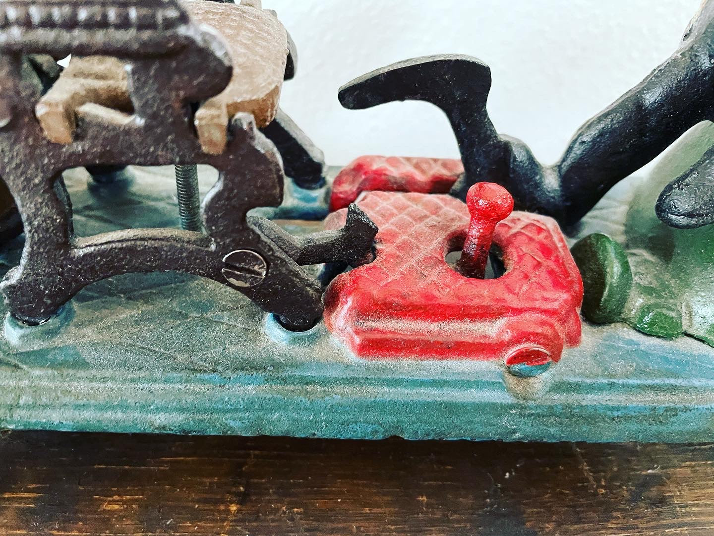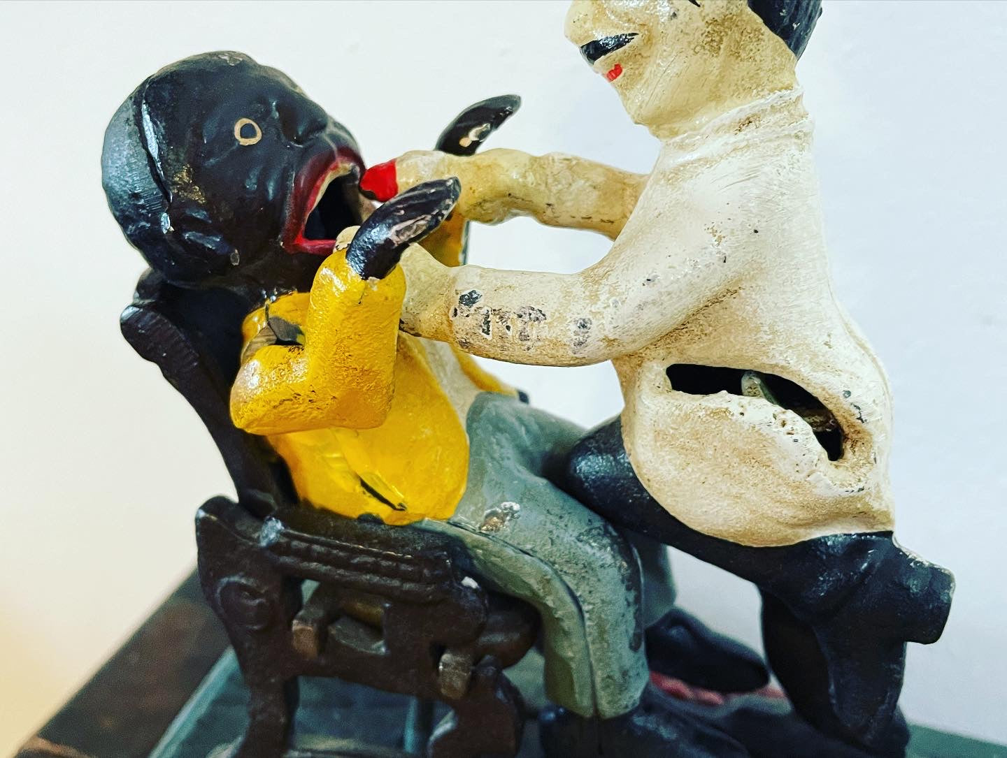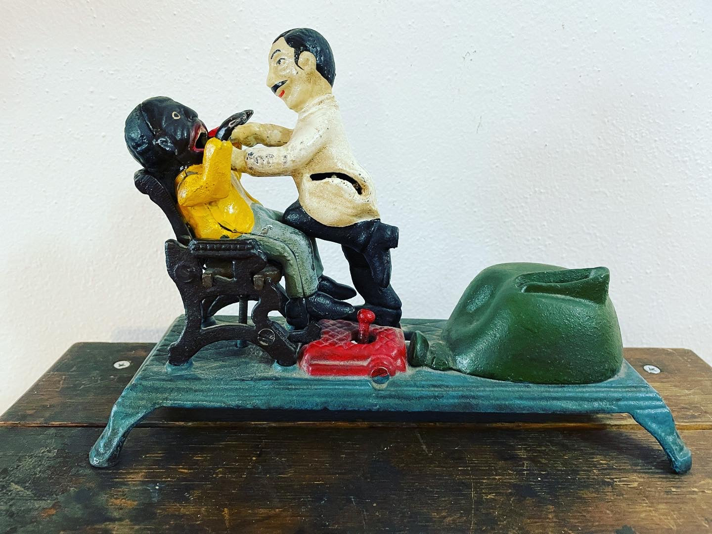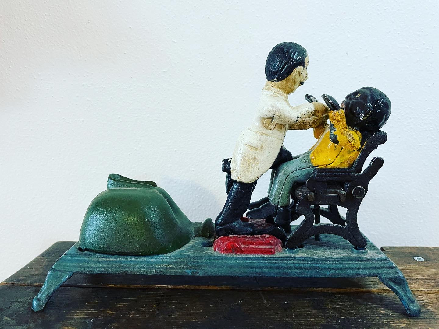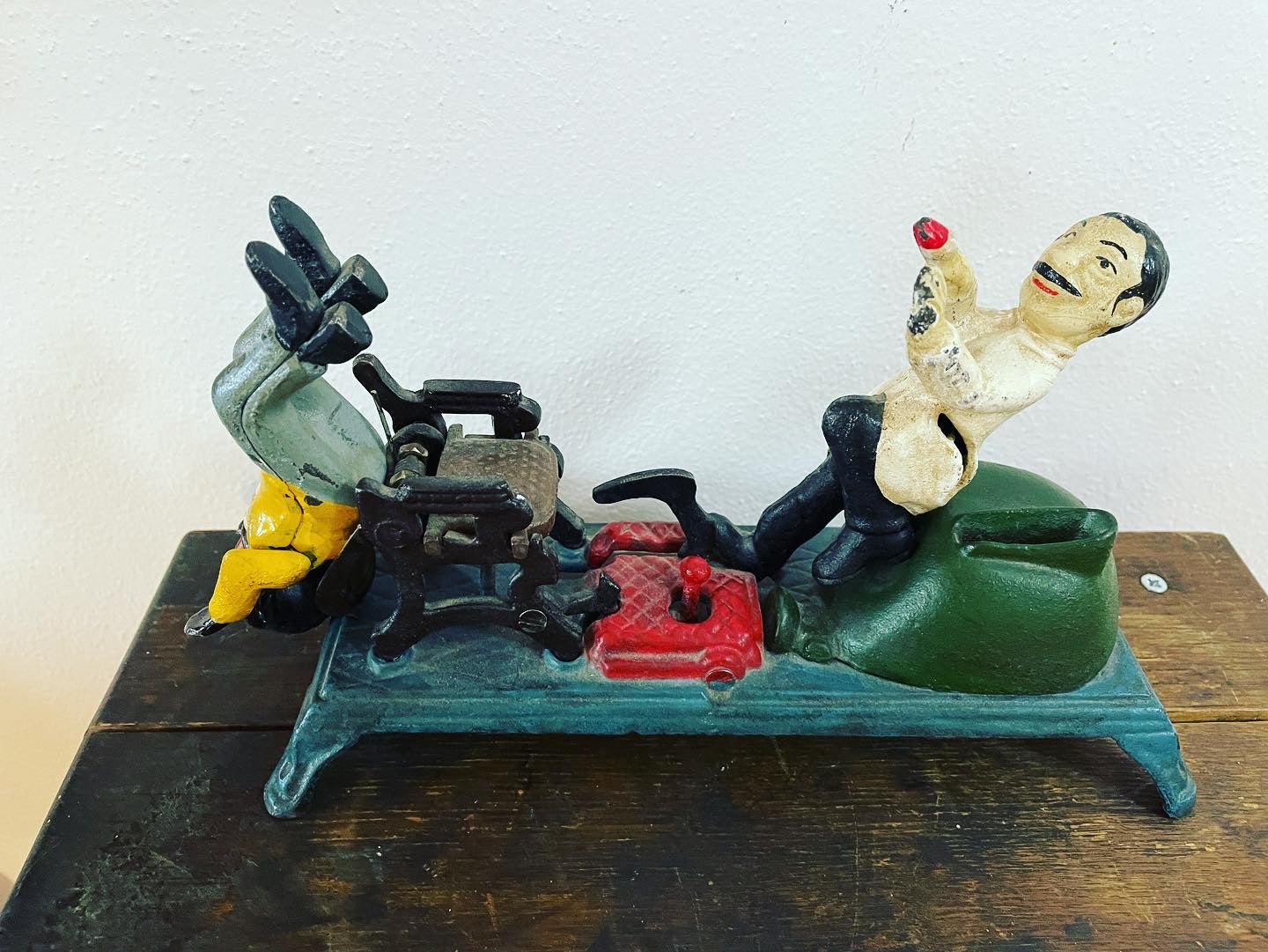 Ragazziiiiiii #capolavoro stamattina! Super orgogliosa di questo #pezzounico difficilerrrrimo da trovare: #antico #salvadanaio meccanico in #ghisa dove il dentista deve cavare un dente al paziente; si inserisce la moneta nella tasca della giacca del dottore e….. zac! Il paziente si capovolge urlante e il soldo finisce nella borsa del Dott. IMPERDIBILE per chi ama gli #oggetticuriosi e le #straneantichità