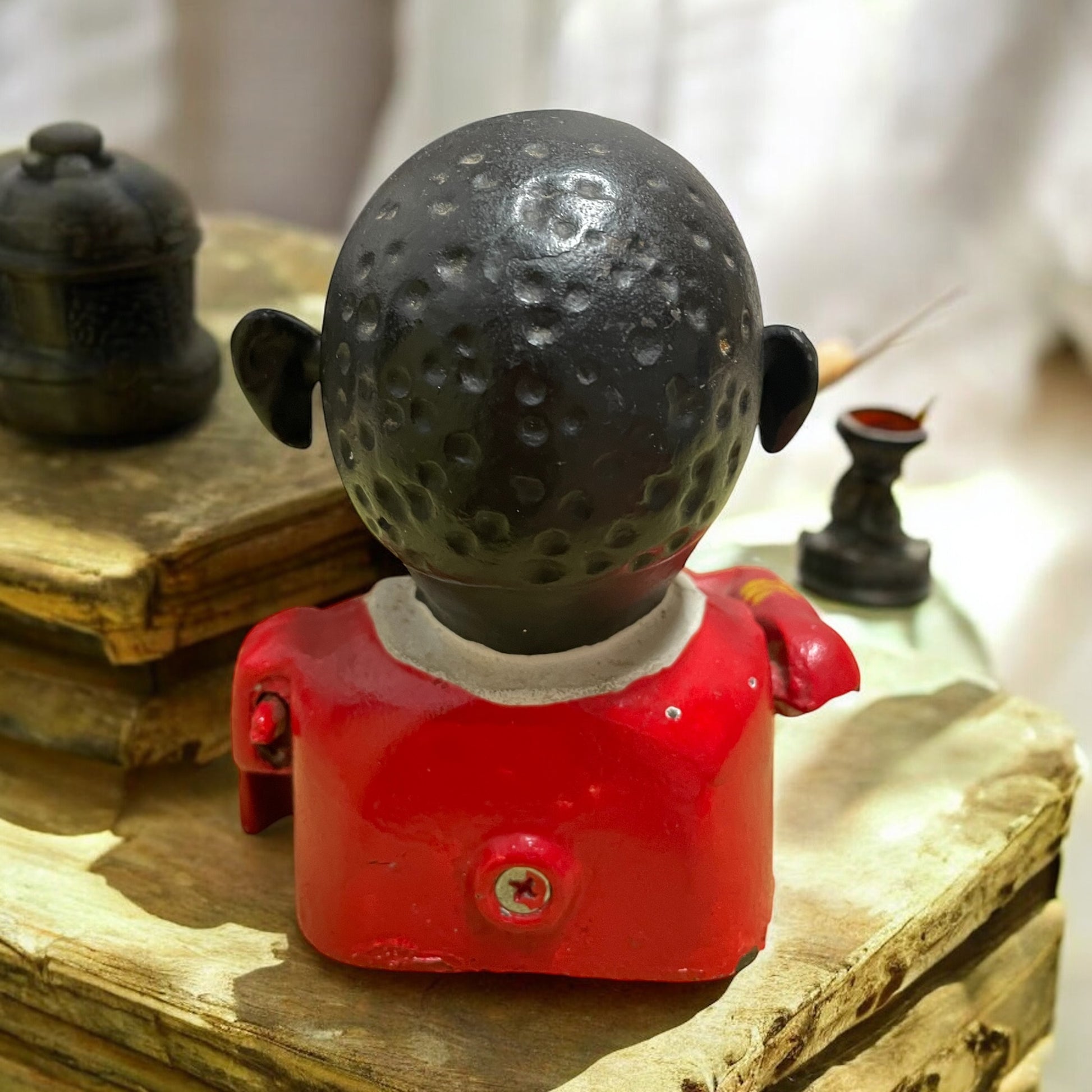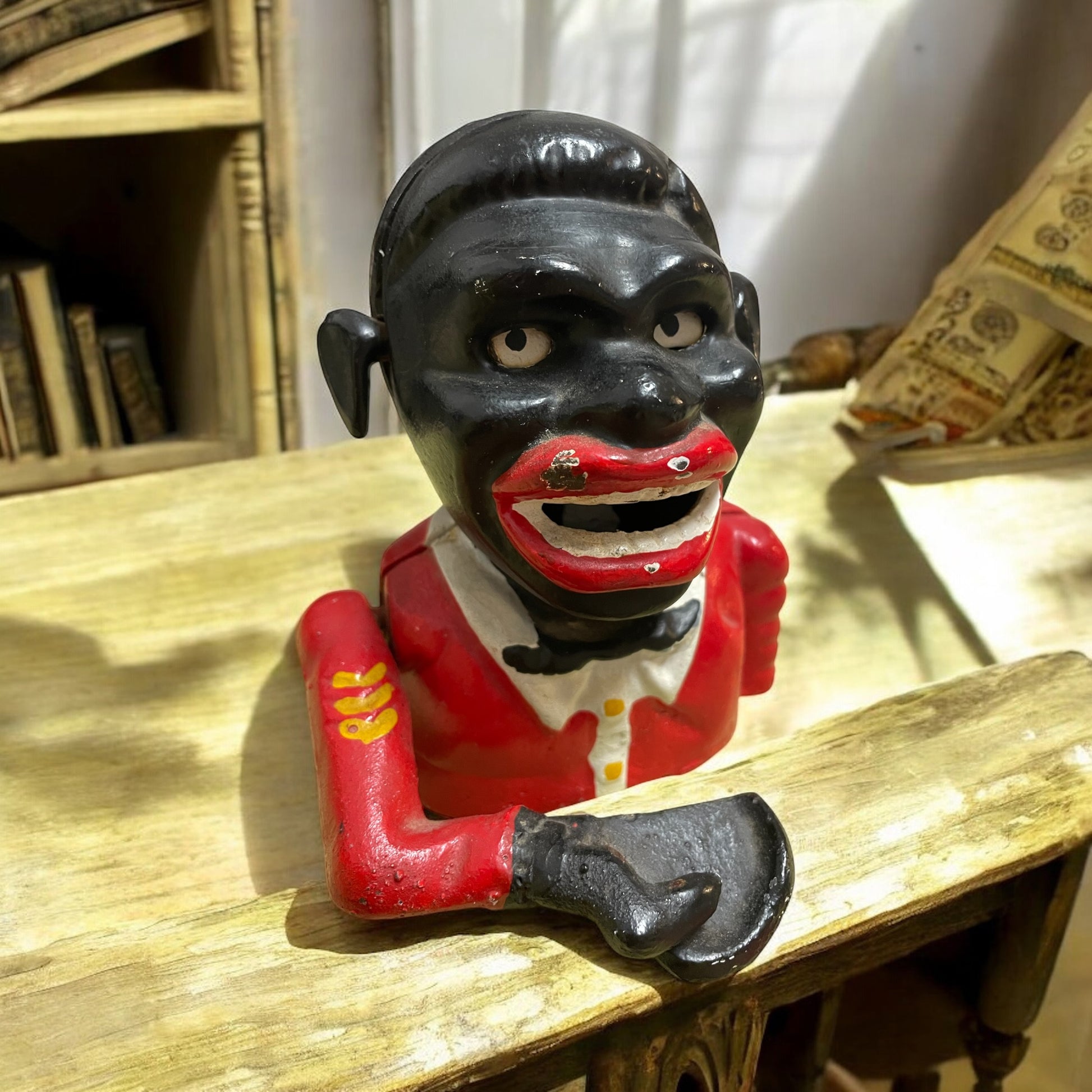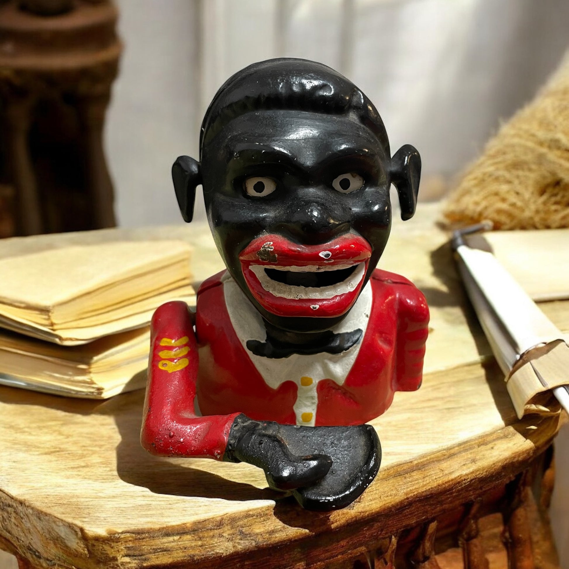 Questo salvadanaio meccanico in ghisa è una riproduzione del celebre modello originariamente prodotto alla fine del XIX secolo, noto come “Jolly Nigger Bank”, realizzato dalla Shepard Hardware Company negli Stati Uniti intorno al 1880. Questi salvadanai meccanici erano pensati per educare i bambini all’abitudine al risparmio in modo divertente, utilizzando un meccanismo ingegnoso e interattivo.