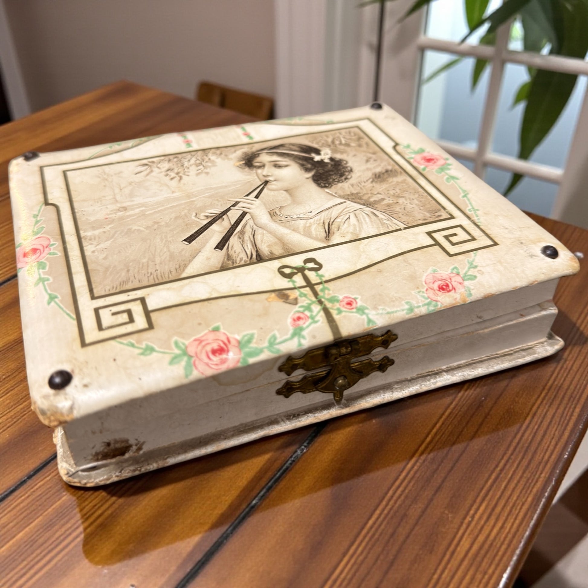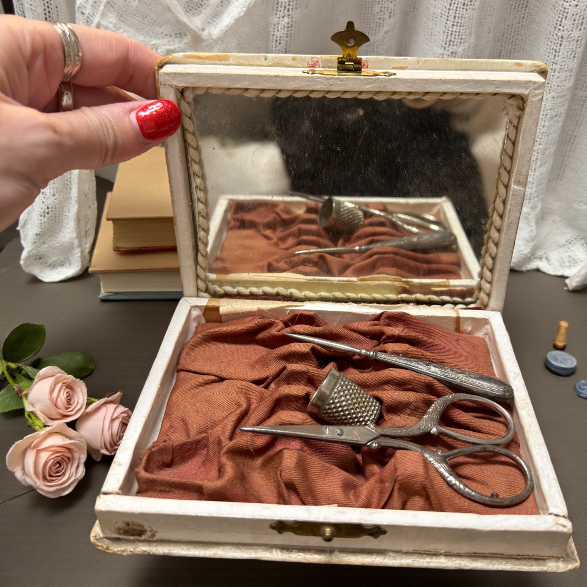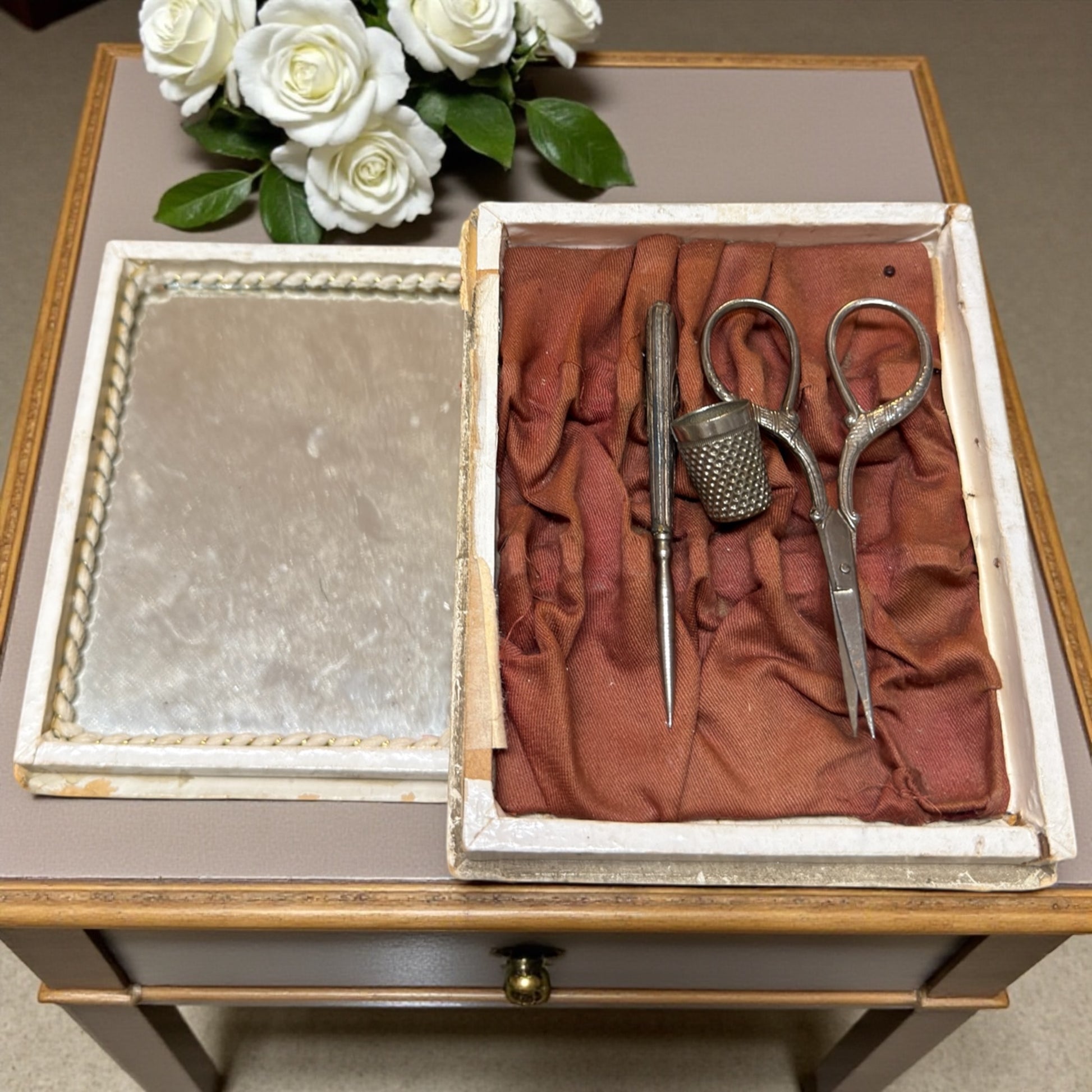 Una giovane donna è colta nell’atto di suonare, come se il tempo si fosse fermato per ascoltarla. Questo set da cucito d’epoca racconta una femminilità silenziosa e concentrata, fatta di gesti lenti e di attenzioni quotidiane. La scatola è di fine ‘800 ed è lei che incanta: in legno rivestito e decorata con una raffinata litografia di gusto tardo Liberty, custodisce all’interno uno specchio antico e una morbida imbottitura in seta rossa, ancora presente. Il coperchio è completamente removibile (non incernierato): un difetto del tempo da conoscere, invisibile a scatola chiusa, che non compromette l’estetica ma fa parte della sua storia. All’interno si trovano tre strumenti originali e coerenti tra loro: un punteruolo con manico in argento finemente decorato, un ditale lavorato e un paio di forbicine eleganti. Oggetti pensati per stare in vista, su una toeletta, non nascosti in un cassetto. Un piccolo mondo domestico dove cucire era un gesto vicino alla musica: ripetitivo, intimo, quasi meditativo.