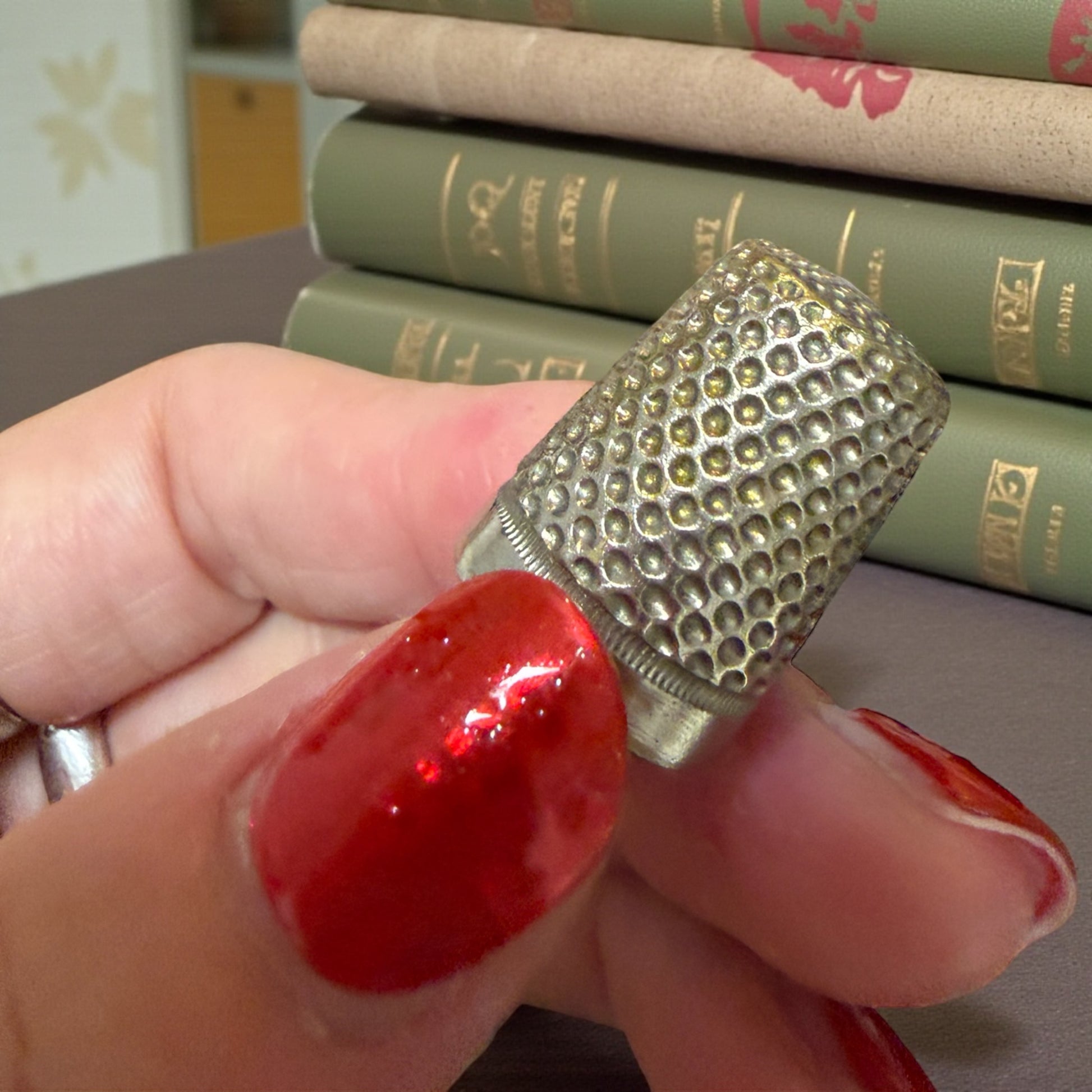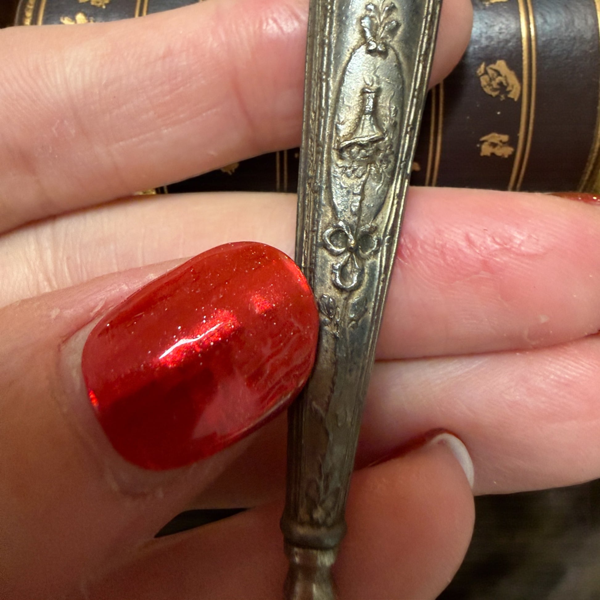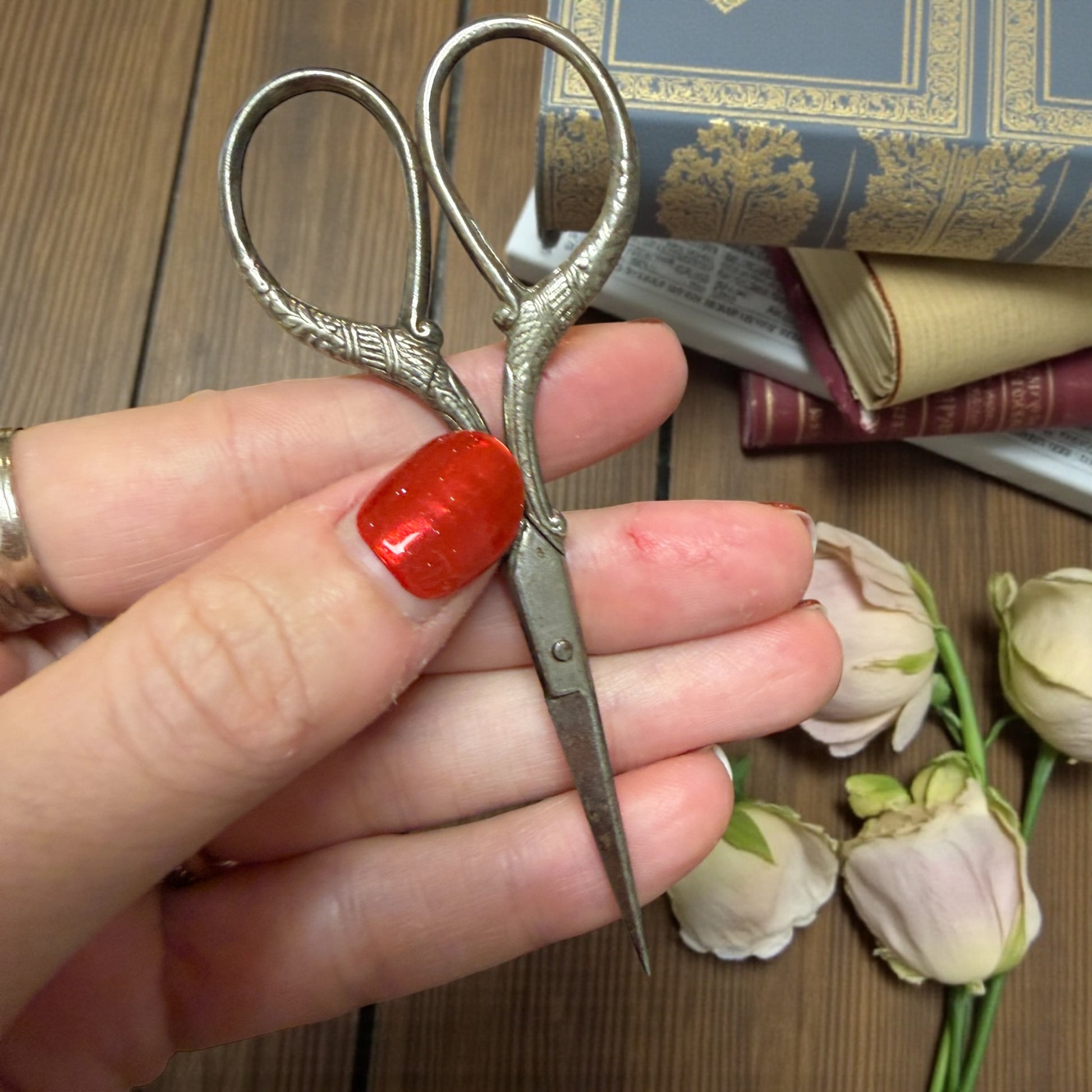 Una giovane donna è colta nell’atto di suonare, come se il tempo si fosse fermato per ascoltarla. Questo set da cucito d’epoca racconta una femminilità silenziosa e concentrata, fatta di gesti lenti e di attenzioni quotidiane. La scatola è di fine ‘800 ed è lei che incanta: in legno rivestito e decorata con una raffinata litografia di gusto tardo Liberty, custodisce all’interno uno specchio antico e una morbida imbottitura in seta rossa, ancora presente. Il coperchio è completamente removibile (non incernierato): un difetto del tempo da conoscere, invisibile a scatola chiusa, che non compromette l’estetica ma fa parte della sua storia. All’interno si trovano tre strumenti originali e coerenti tra loro: un punteruolo con manico in argento finemente decorato, un ditale lavorato e un paio di forbicine eleganti. Oggetti pensati per stare in vista, su una toeletta, non nascosti in un cassetto. Un piccolo mondo domestico dove cucire era un gesto vicino alla musica: ripetitivo, intimo, quasi meditativo.