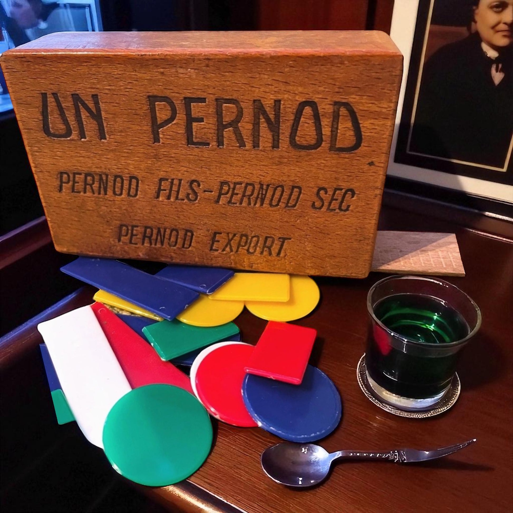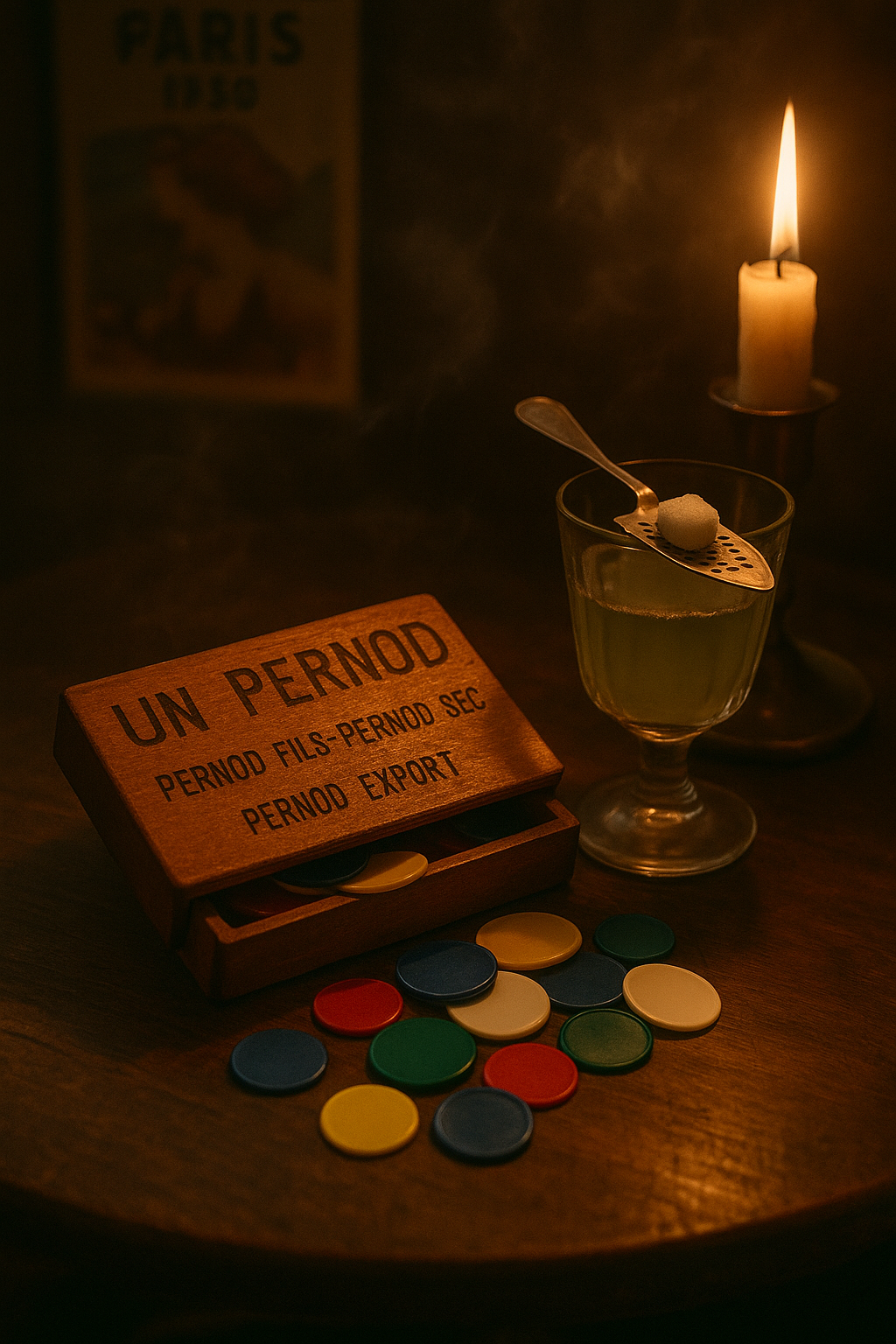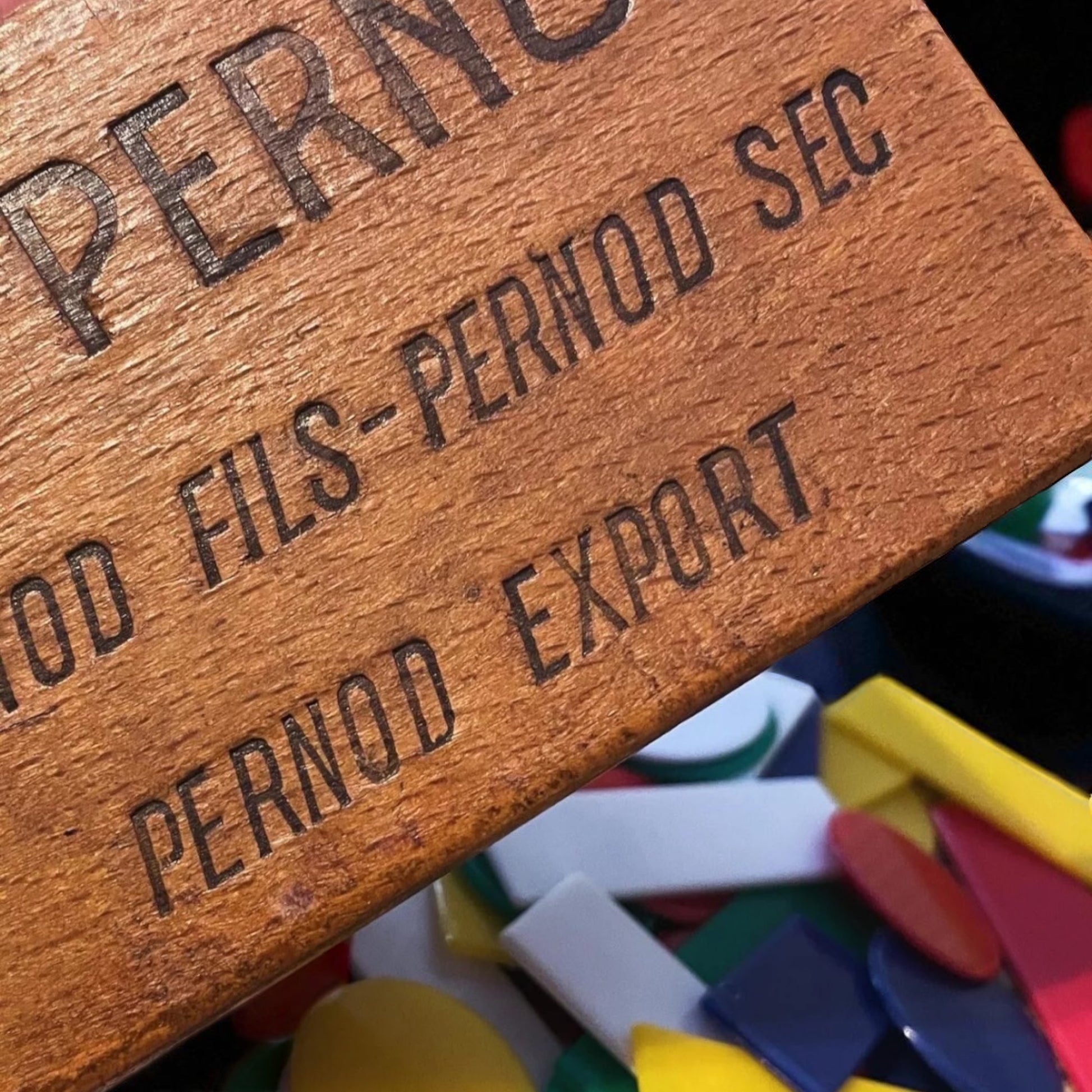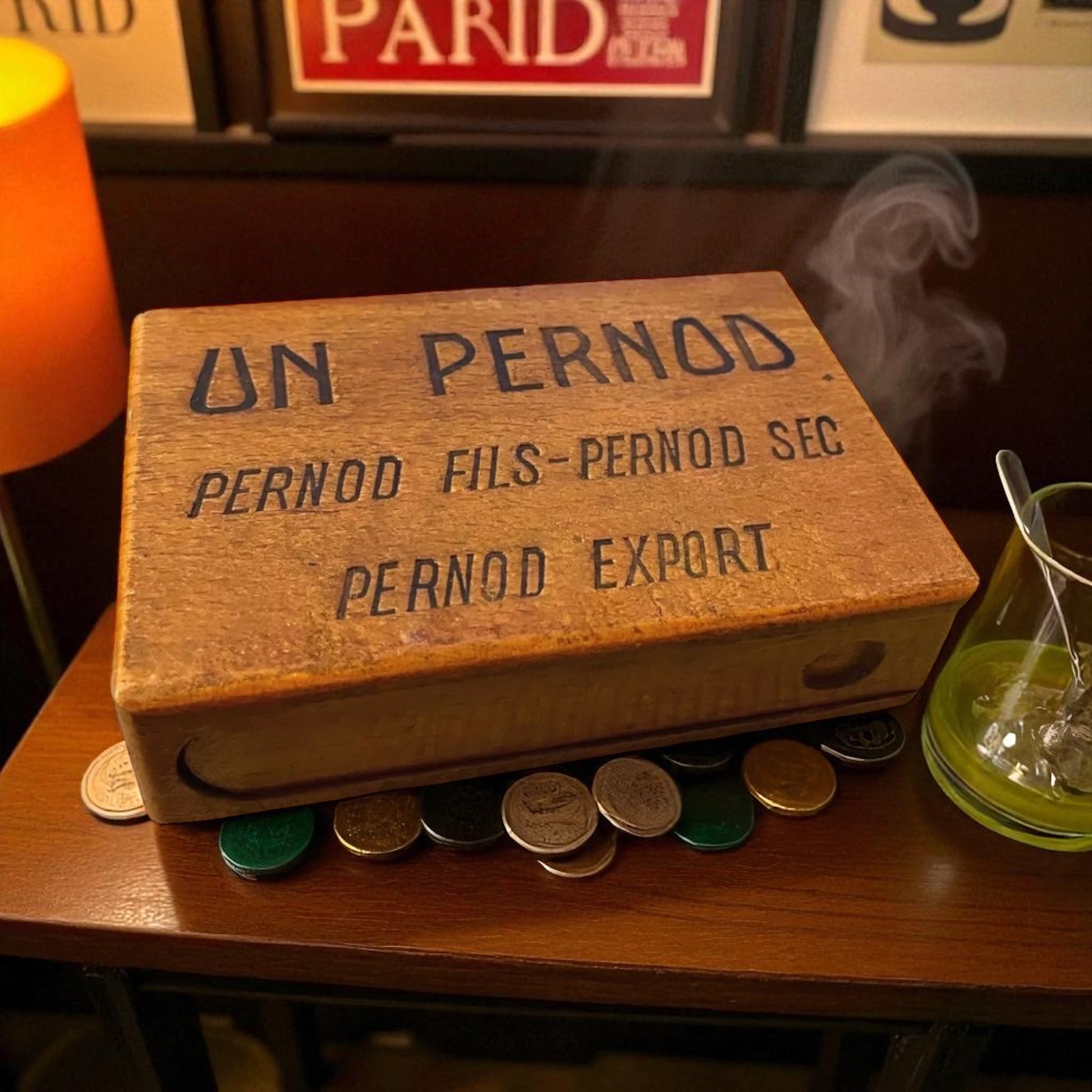 Immagina un bistrot francese d’altri tempi: il vociare allegro, il bicchiere di Pernod sul tavolo e, accanto, una scatolina di legno che nasconde un passatempo semplice e irresistibile. All’interno, gettoni colorati pronti per una partita improvvisata, tra sorrisi e piccole sfide tra amici. Questa scatola marchiata “Un Pernod – Pernod Fils, Pernod Sec, Pernod Export” non è soltanto pubblicità: è il ricordo di un gioco, di serate passate a chiacchierare e a ridere, di mani che pescavano i gettoni e di complicità che si rinnovavano mossa dopo mossa. Un oggetto che porta con sé la leggerezza del gioco e la convivialità del bere insieme.