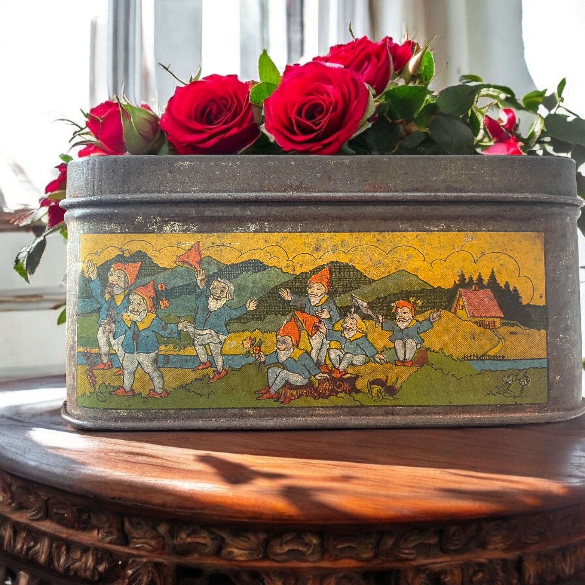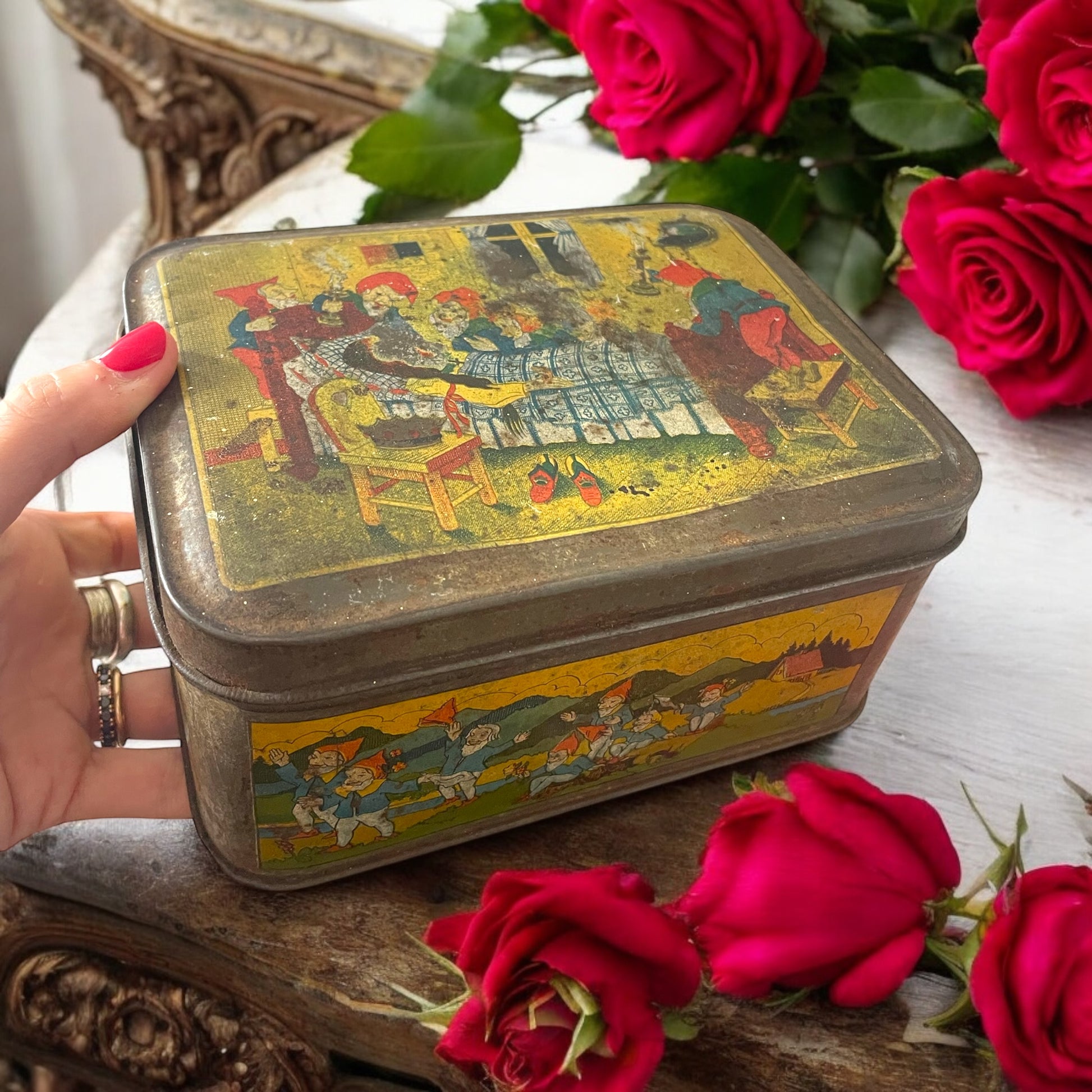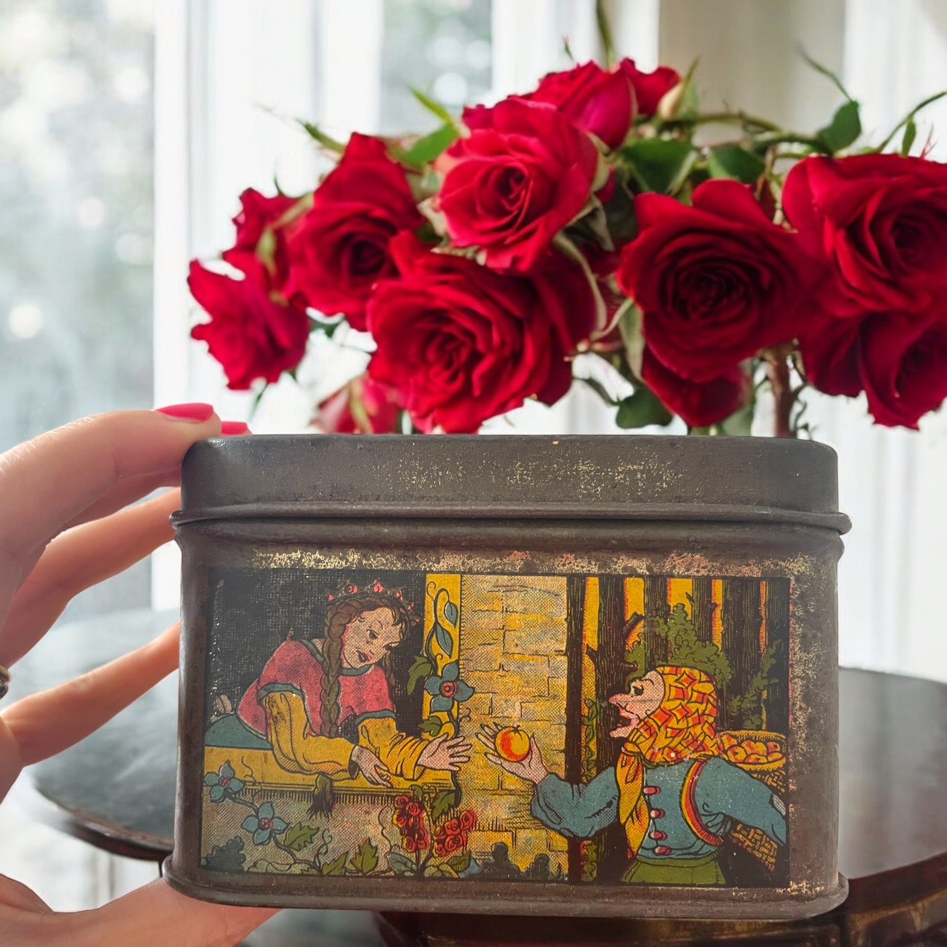 Era il 1938 e per la prima volta la storia di Biancaneve scivolava dalle pagine dei libri alle chiacchiere nelle case, accendendo la fantasia dei bambini. Clara, con i capelli intrecciati e il vestito della festa, ricevette questa scatola come regalo dalla nonna per il giorno del suo compleanno. Dentro c’erano biscotti fragranti, ma per lei il vero tesoro era fuori: le immagini di Biancaneve, i nani, la strega e quel principe soprattutto… sognato mille volte. Ogni sera, prima di dormire, Clara sfiorava la latta e immaginava di vivere dentro quella fiaba: un mondo dove il bosco era pieno di misteri e la bontà vinceva sulla paura. Contava i giorni che mancavano alla fine dei dolci: solo allora la scatola sarebbe stata tutta sua, rifugio di segreti e piccoli sogni. E così, anche adesso, chi la guarda può sentire ancora il battito accelerato di una bambina, innamorata di una favola appena sbocciata. La scatola presenta segni del tempo ma tutti i disegni sono ancora ben visibili e fotografati. Le dimensioni: cm 18 x 13,5. Altezza cm 9.