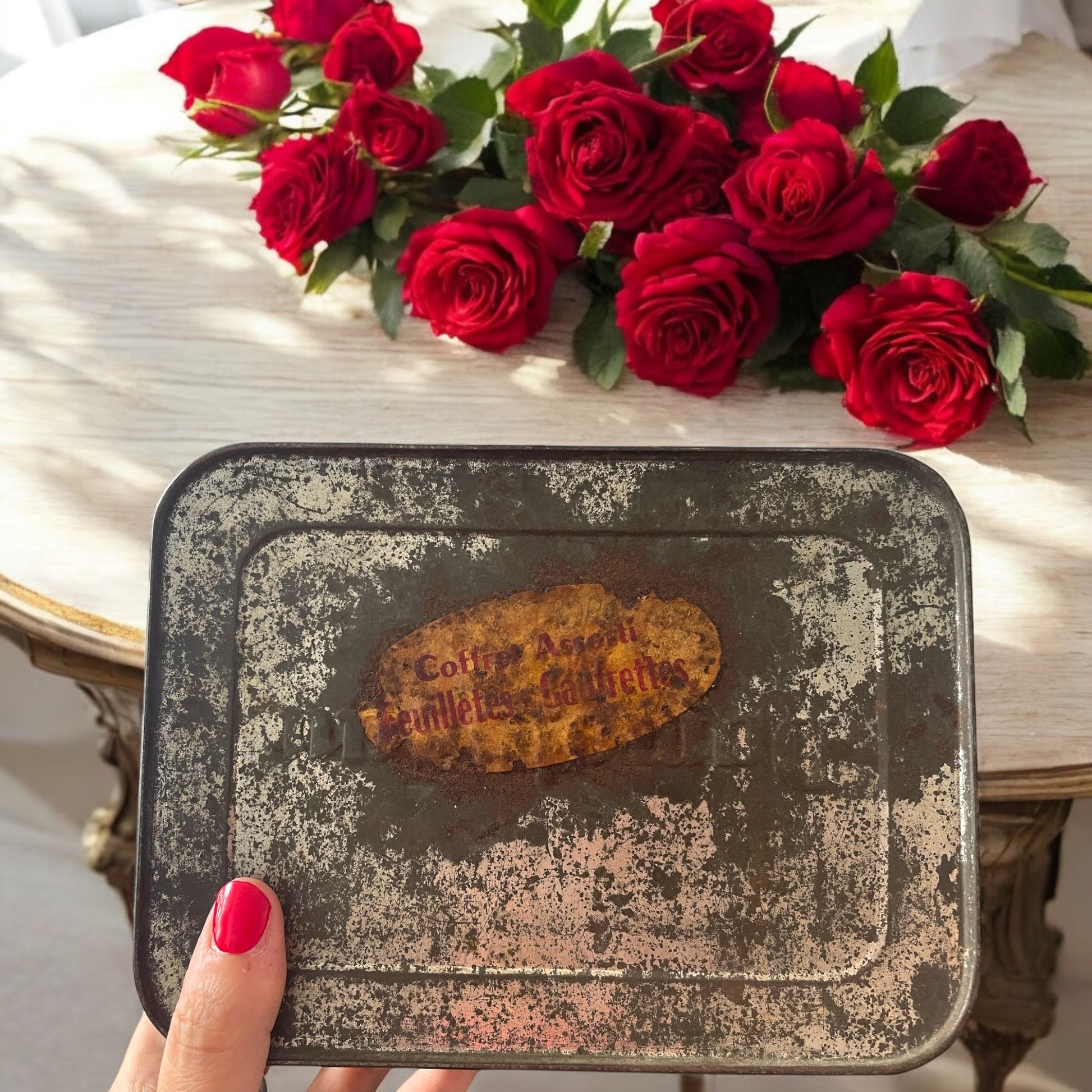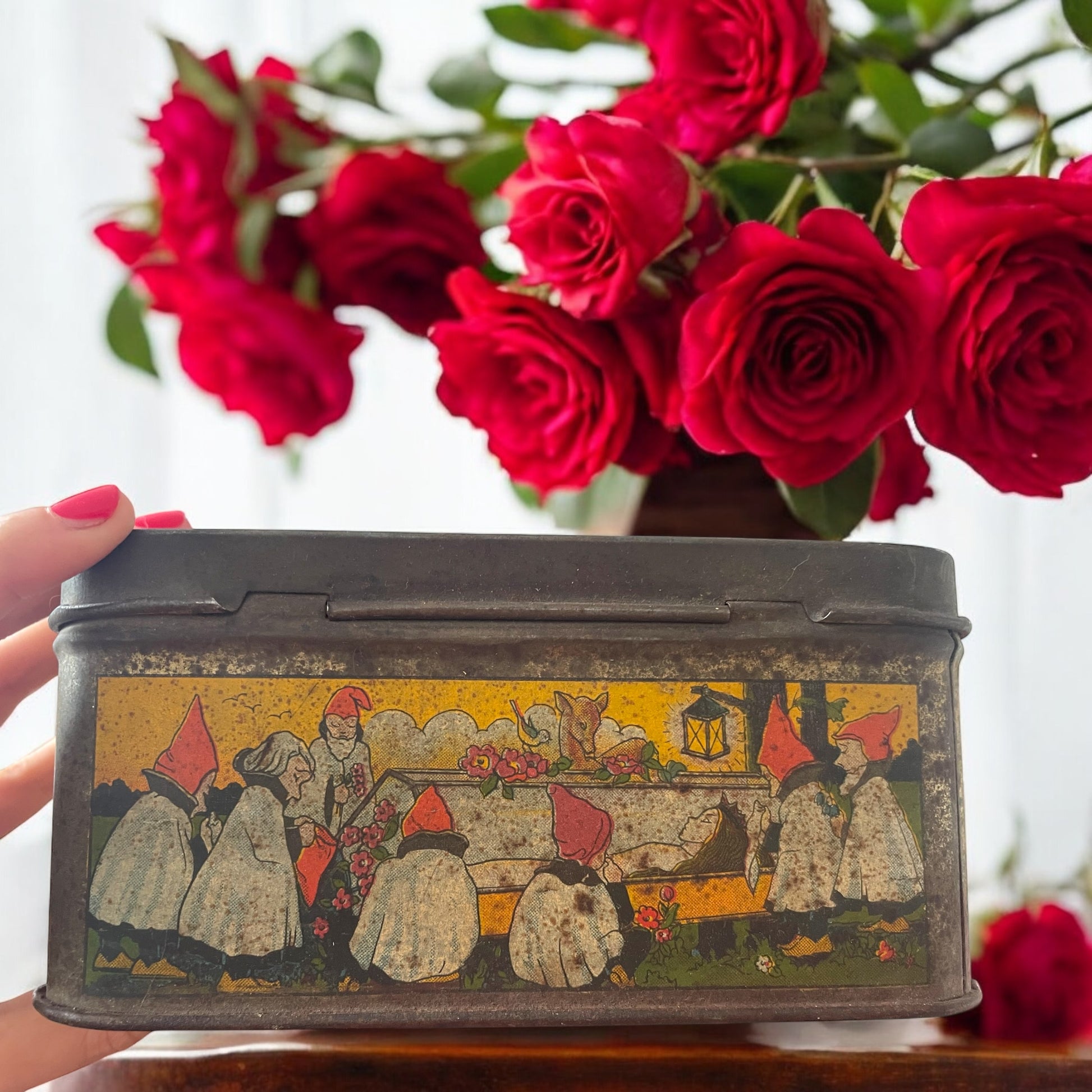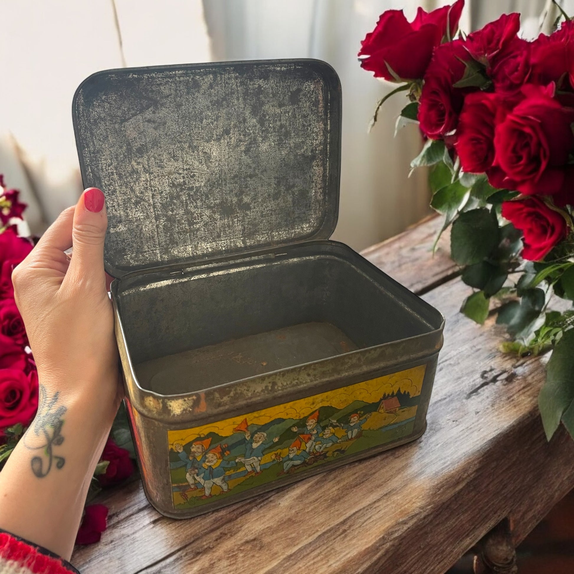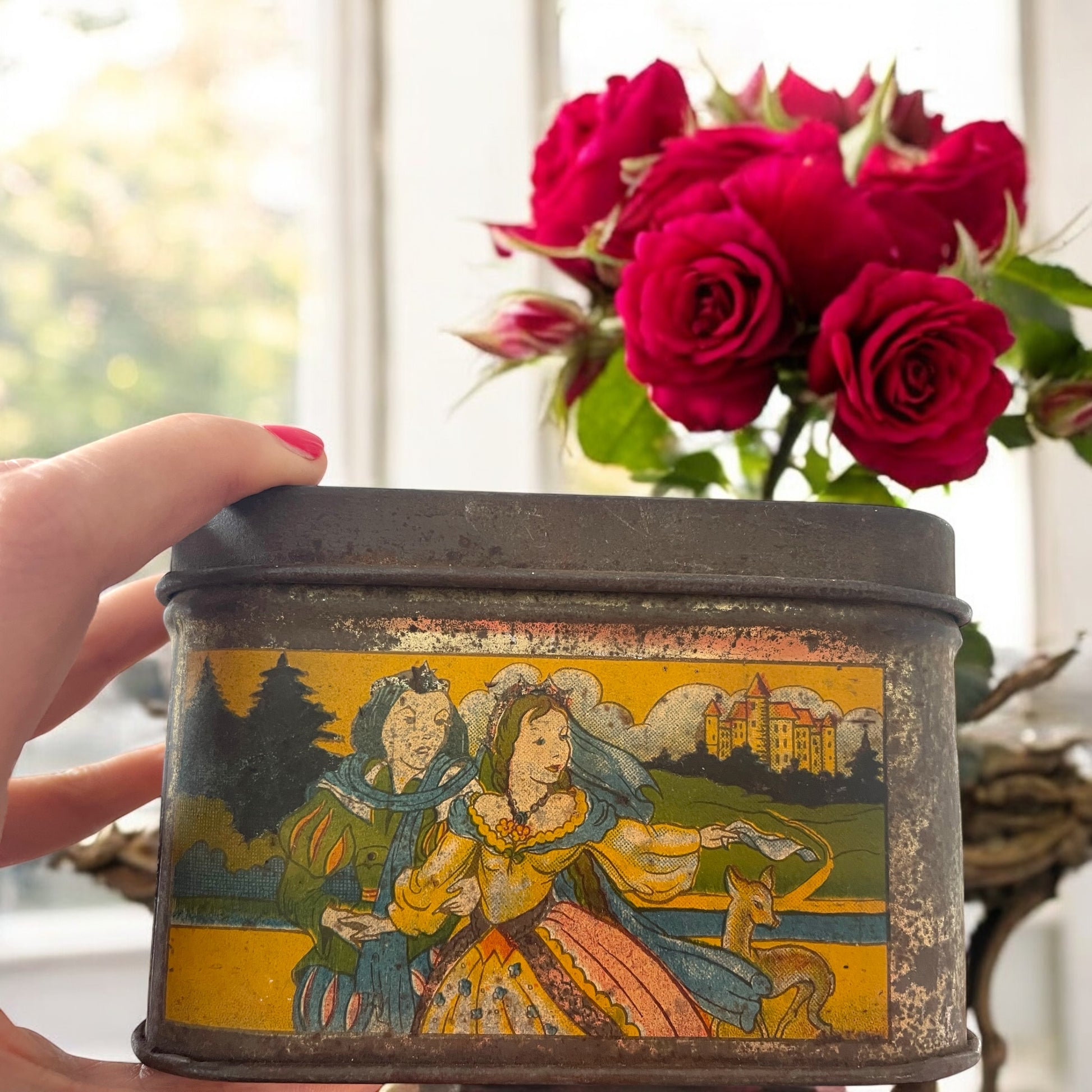 Era il 1938 e per la prima volta la storia di Biancaneve scivolava dalle pagine dei libri alle chiacchiere nelle case, accendendo la fantasia dei bambini. Clara, con i capelli intrecciati e il vestito della festa, ricevette questa scatola come regalo dalla nonna per il giorno del suo compleanno. Dentro c’erano biscotti fragranti, ma per lei il vero tesoro era fuori: le immagini di Biancaneve, i nani, la strega e quel principe soprattutto… sognato mille volte. Ogni sera, prima di dormire, Clara sfiorava la latta e immaginava di vivere dentro quella fiaba: un mondo dove il bosco era pieno di misteri e la bontà vinceva sulla paura. Contava i giorni che mancavano alla fine dei dolci: solo allora la scatola sarebbe stata tutta sua, rifugio di segreti e piccoli sogni. E così, anche adesso, chi la guarda può sentire ancora il battito accelerato di una bambina, innamorata di una favola appena sbocciata. La scatola presenta segni del tempo ma tutti i disegni sono ancora ben visibili e fotografati. Le dimensioni: cm 18 x 13,5. Altezza cm 9.