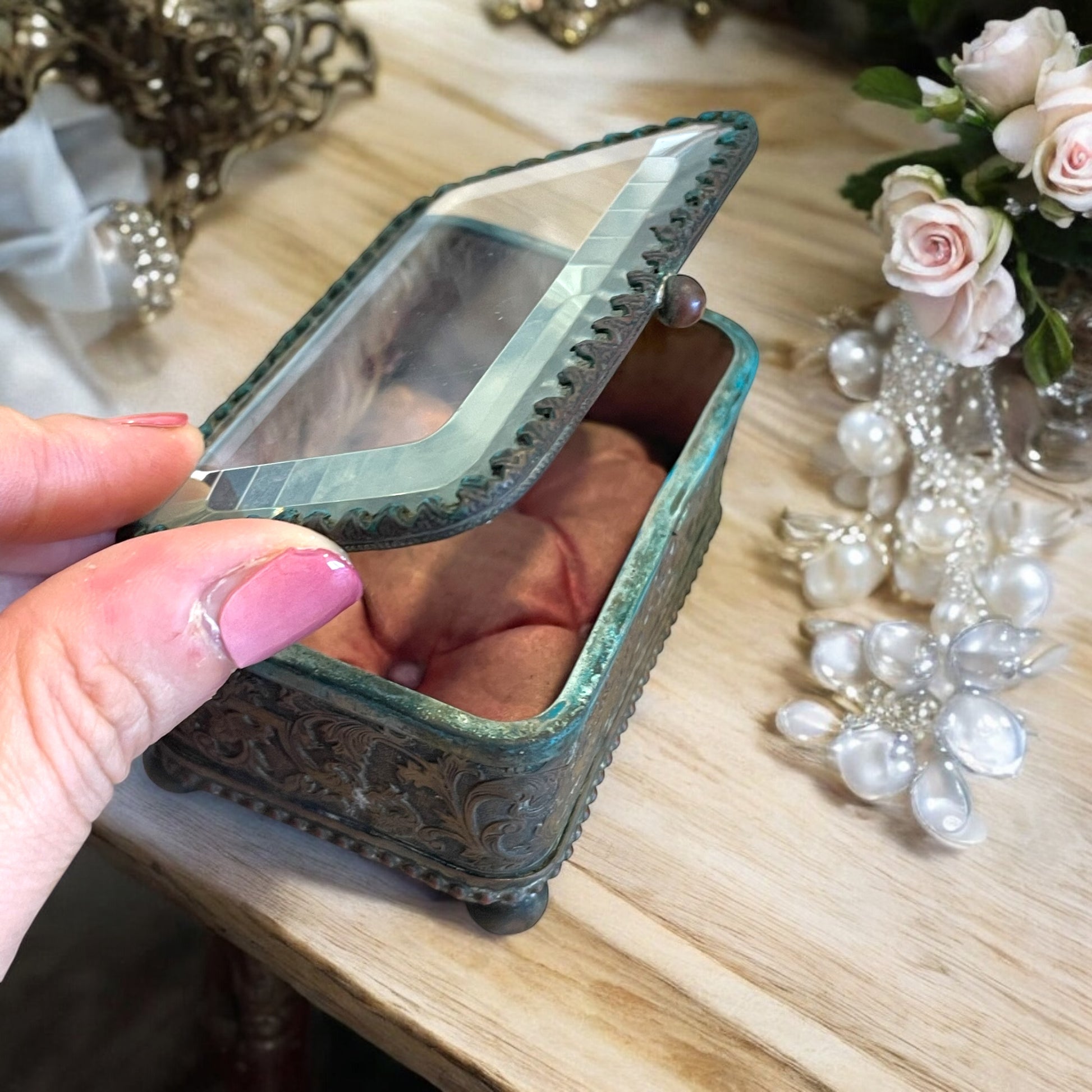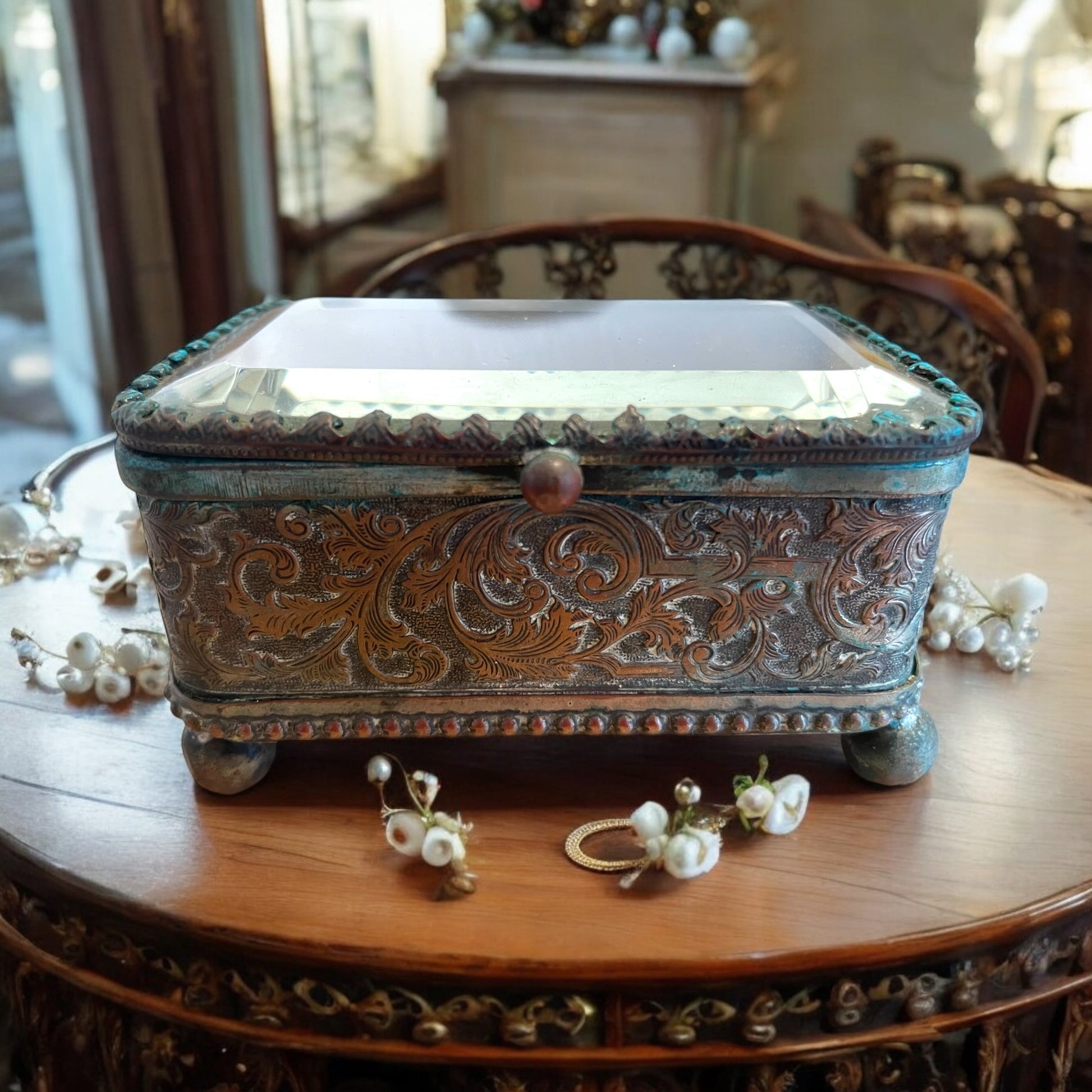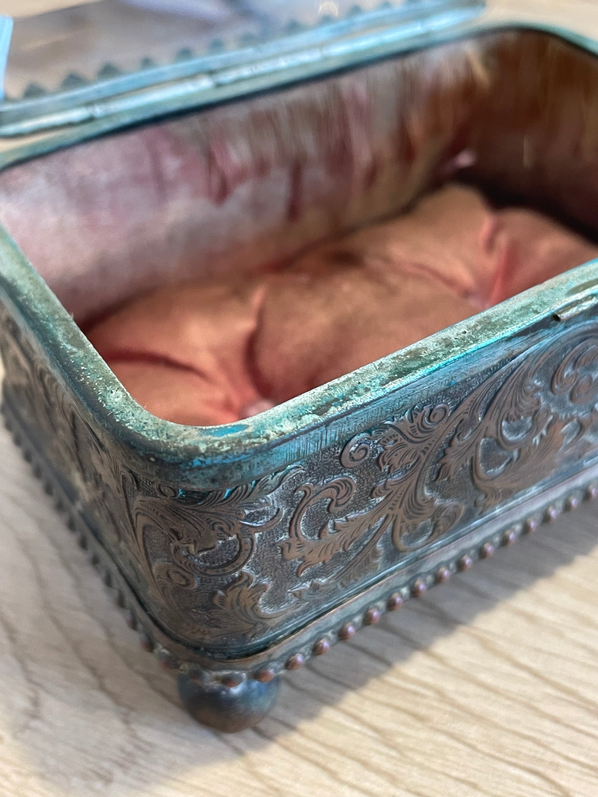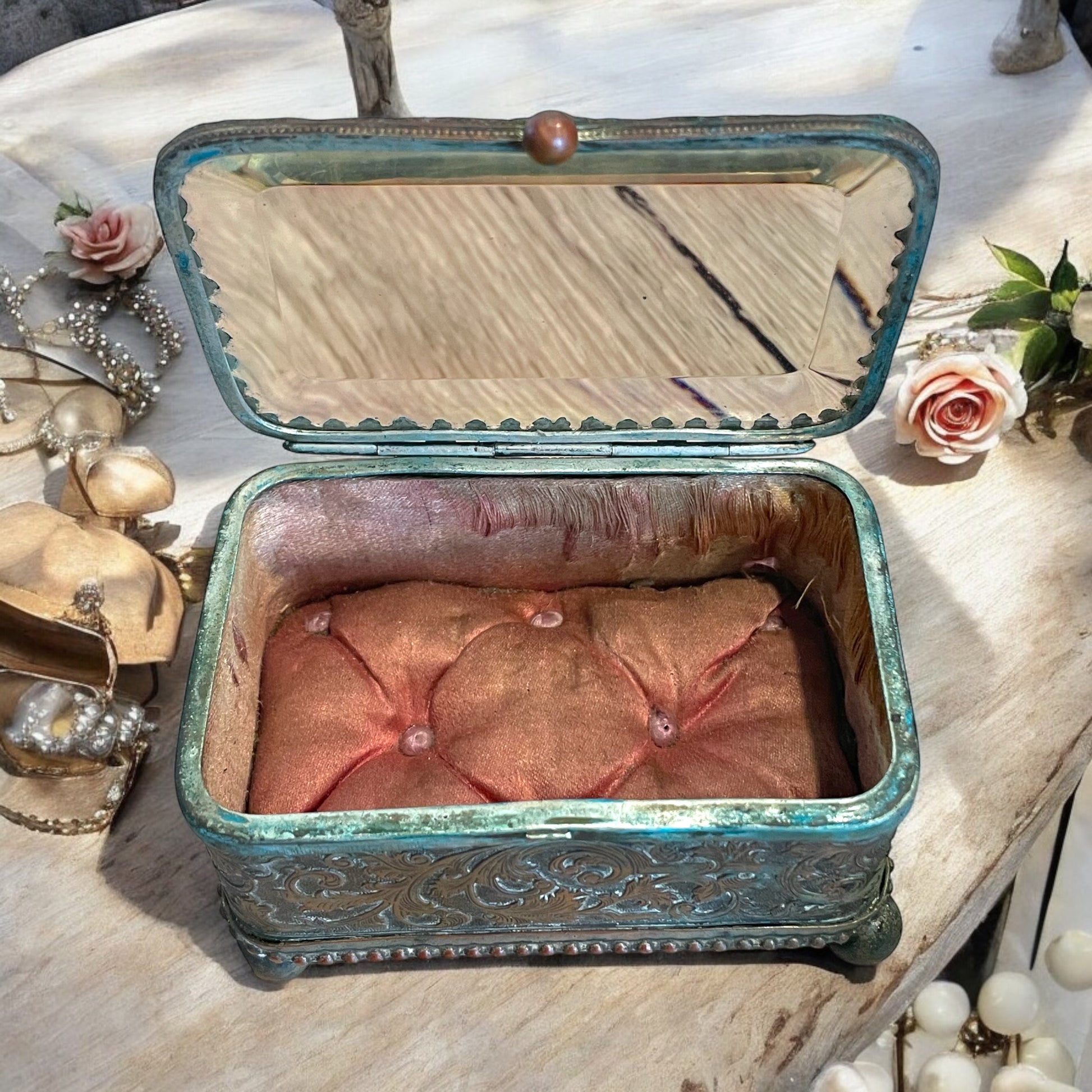 Scrigno porta gioielli Art Nouveau, con lamina argentata e interno in seta rosa antico