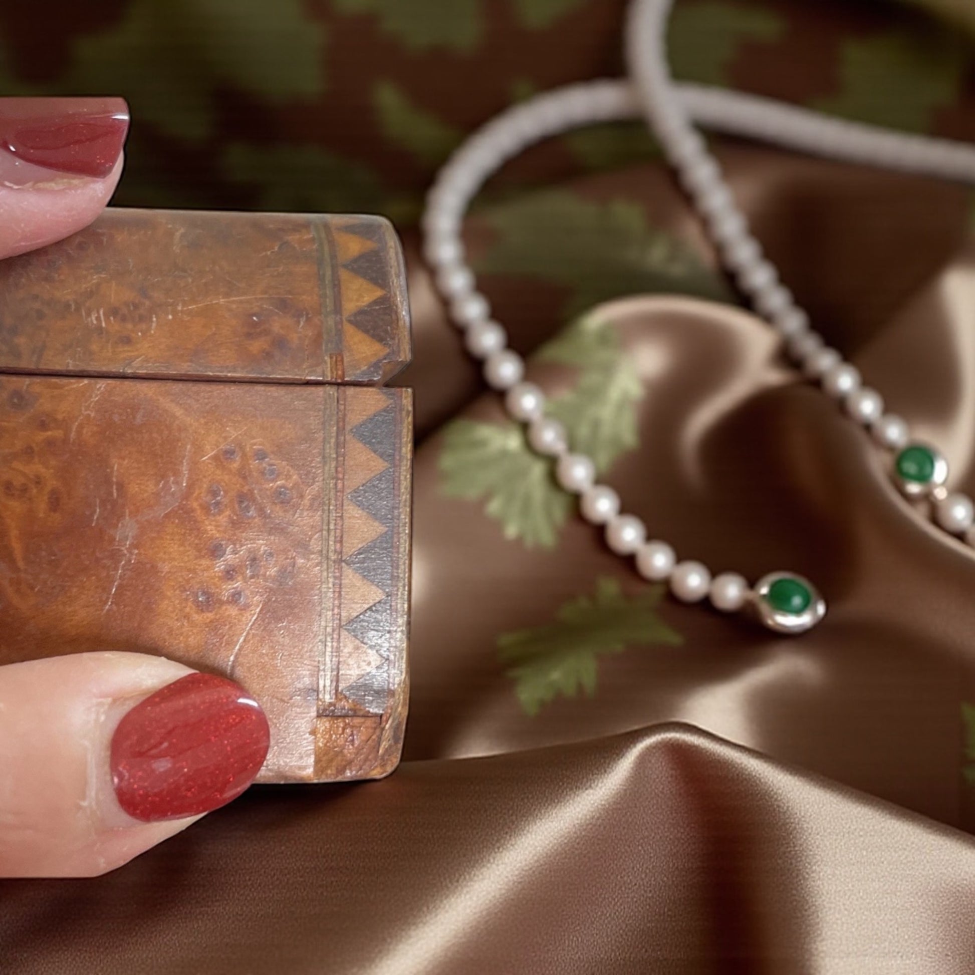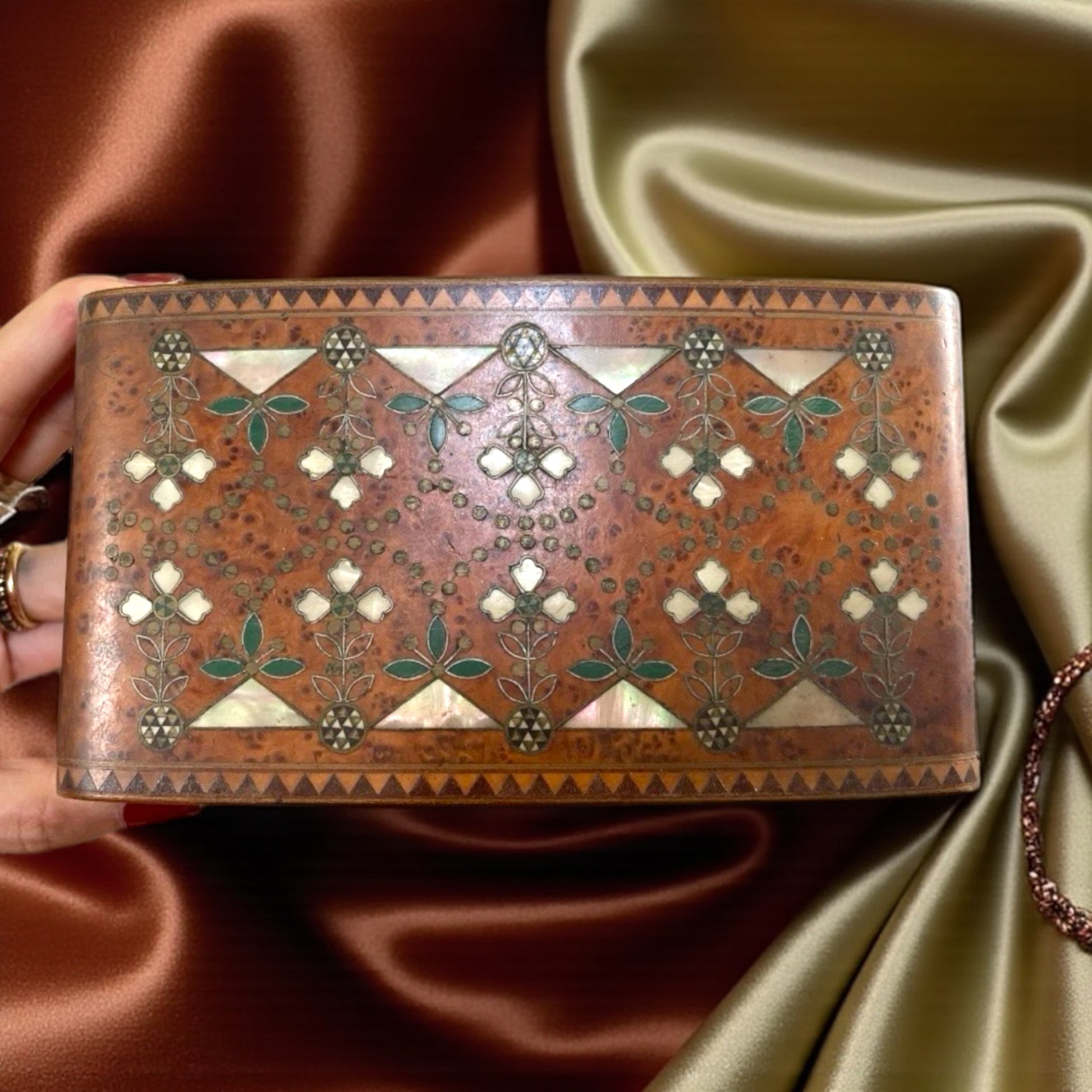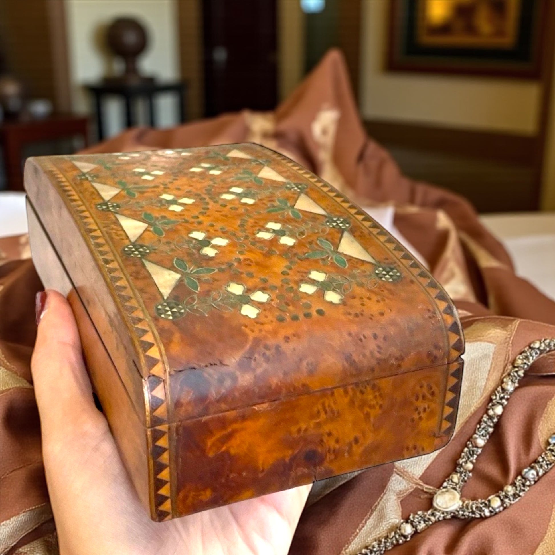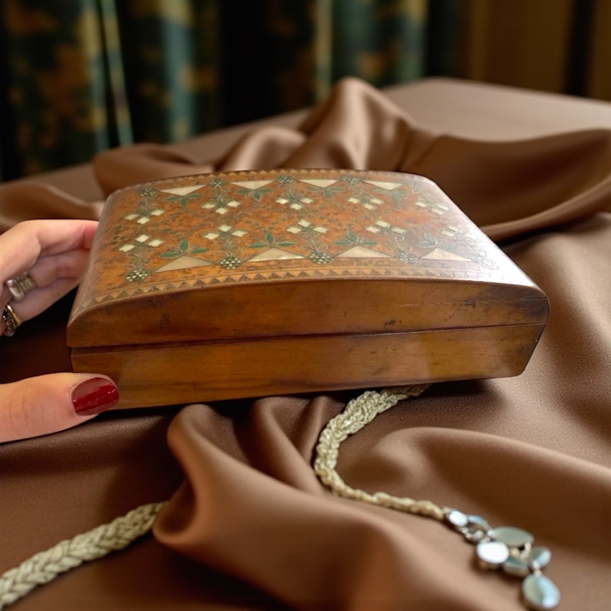 Immagina di aprire un piccolo scrigno e ritrovare riflessi di madreperla che danzano alla luce, tra motivi floreali e geometrici che raccontano l’incontro tra Oriente e Occidente. Questo cofanetto in legno, con intarsi in madreperla e inserti verdi, custodisce ancora oggi il fascino della prima metà del Novecento. L’interno, rivestito in lacca rossa, è perfetto per proteggere gioielli e segreti; evocando atmosfere di viaggi lontani e memorie preziose. Non solo un contenitore, ma un frammento di poesia che porta con sé il tempo e la sua patina. Le dimensioni: 17 x 10 cm, una lieve mancanza che nulla toglie alla bellezza visibile in penultima foto.