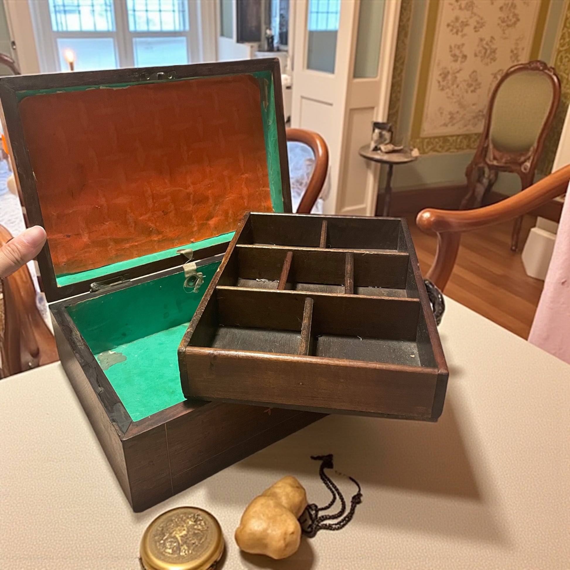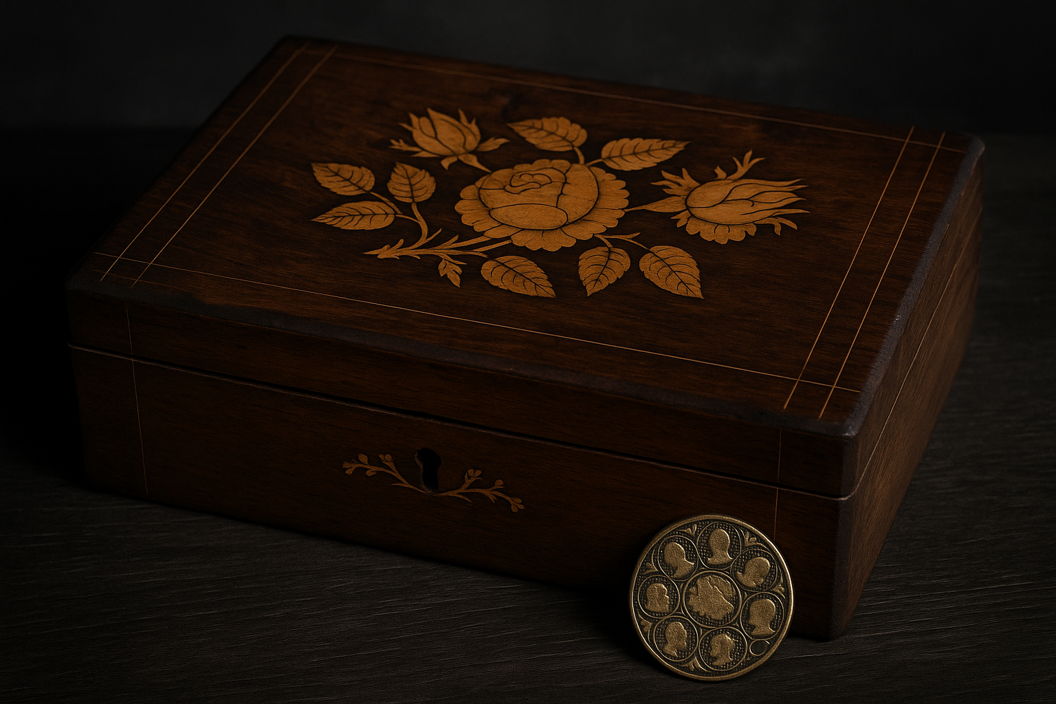 ✨ Non è solo una scatola. È un segreto vittoriano dimenticato. Il legno scuro racconta di mani che, nell’Ottocento, hanno inciso con pazienza una rosa che ancora oggi fiorisce sul coperchio. Una scatola intarsiata, nata per custodire gioielli e piccoli tesori, con un vassoio segreto che ha protetto ricordi per oltre un secolo. E dentro, come un soffio del tempo, qualcosa vi è rimasto dimenticato: una medaglia commemorativa del Giubileo d’Oro della Regina Vittoria (1887) - un frammento d’impero, inciso con i profili dei principi e dei duchi britannici, forata per essere portata al collo come amuleto. Scatola e medaglia: due storie intrecciate, che arrivano a noi insieme. Non oggetti separati, ma un unico racconto di memoria, eleganza e mistero. Perfetti per chi ama i dettagli che parlano di passato e sanno trasformare LA casa in un luogo carico di suggestione.