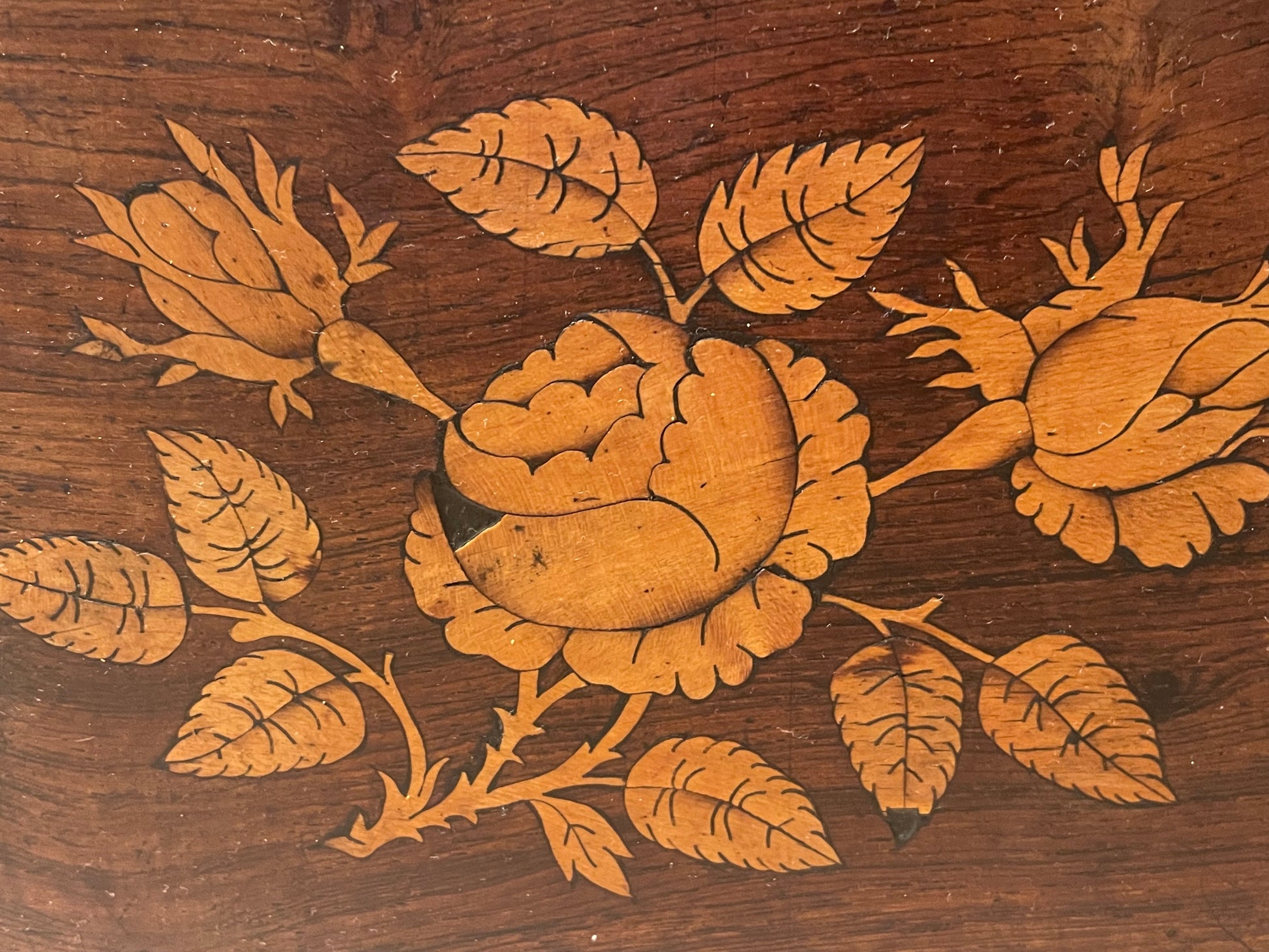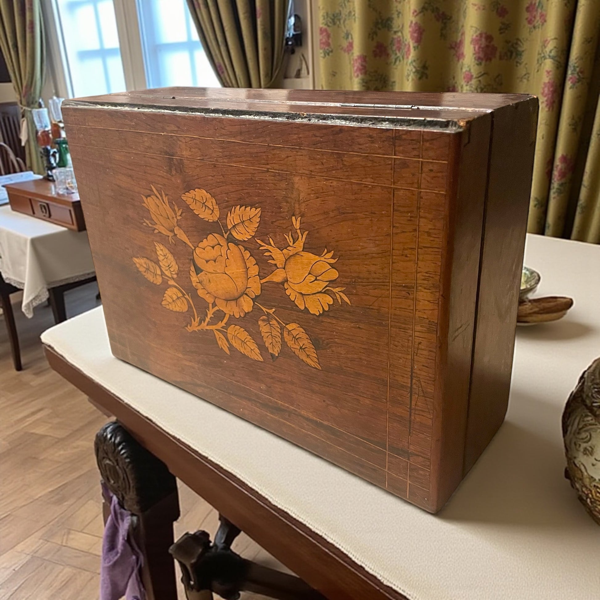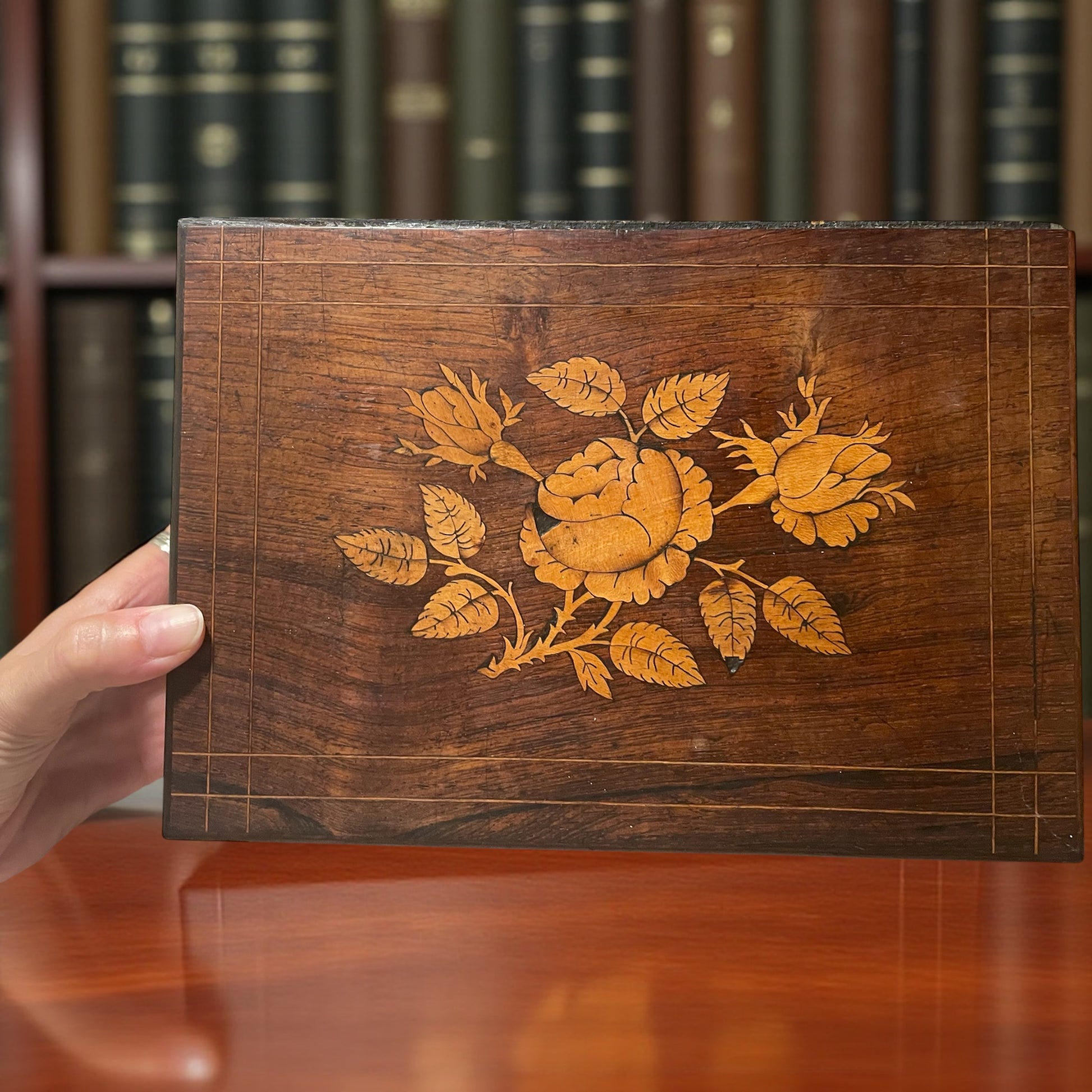 Scrigno scatola vittoriana con tarsia floreale, doppio scomparto e medaglia Giubileo Regina Vittoria