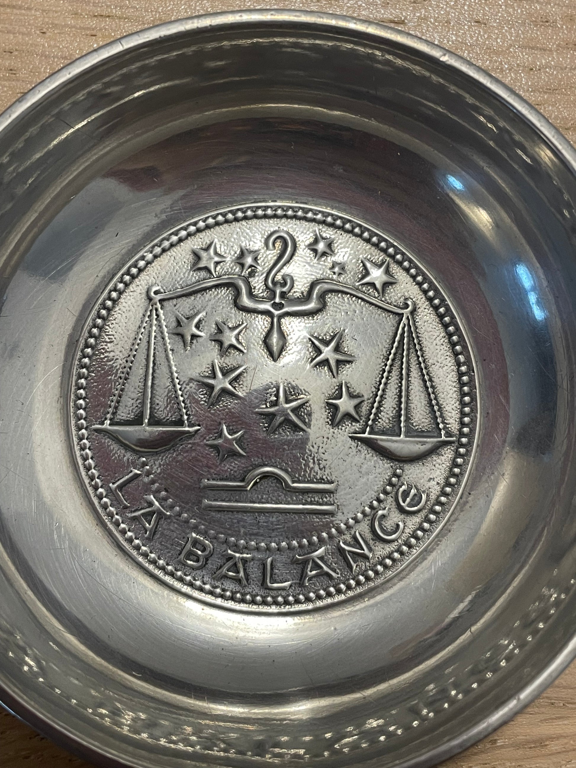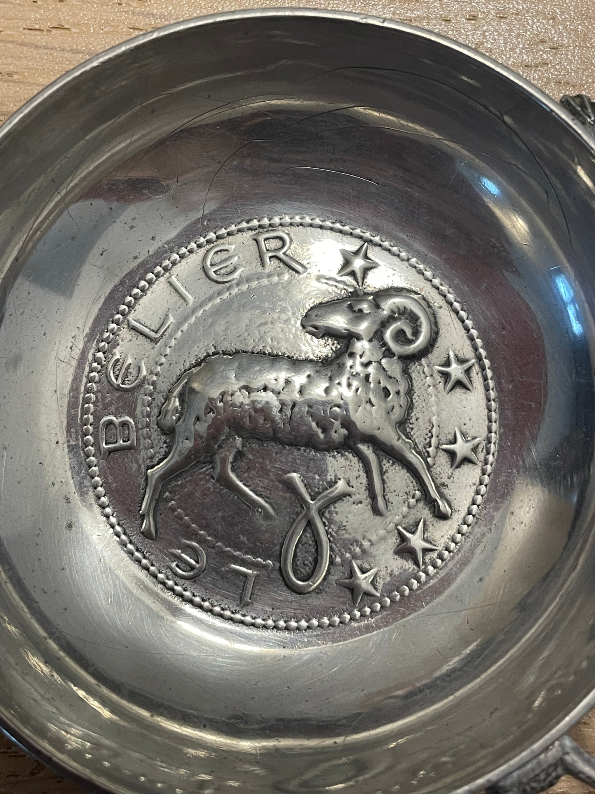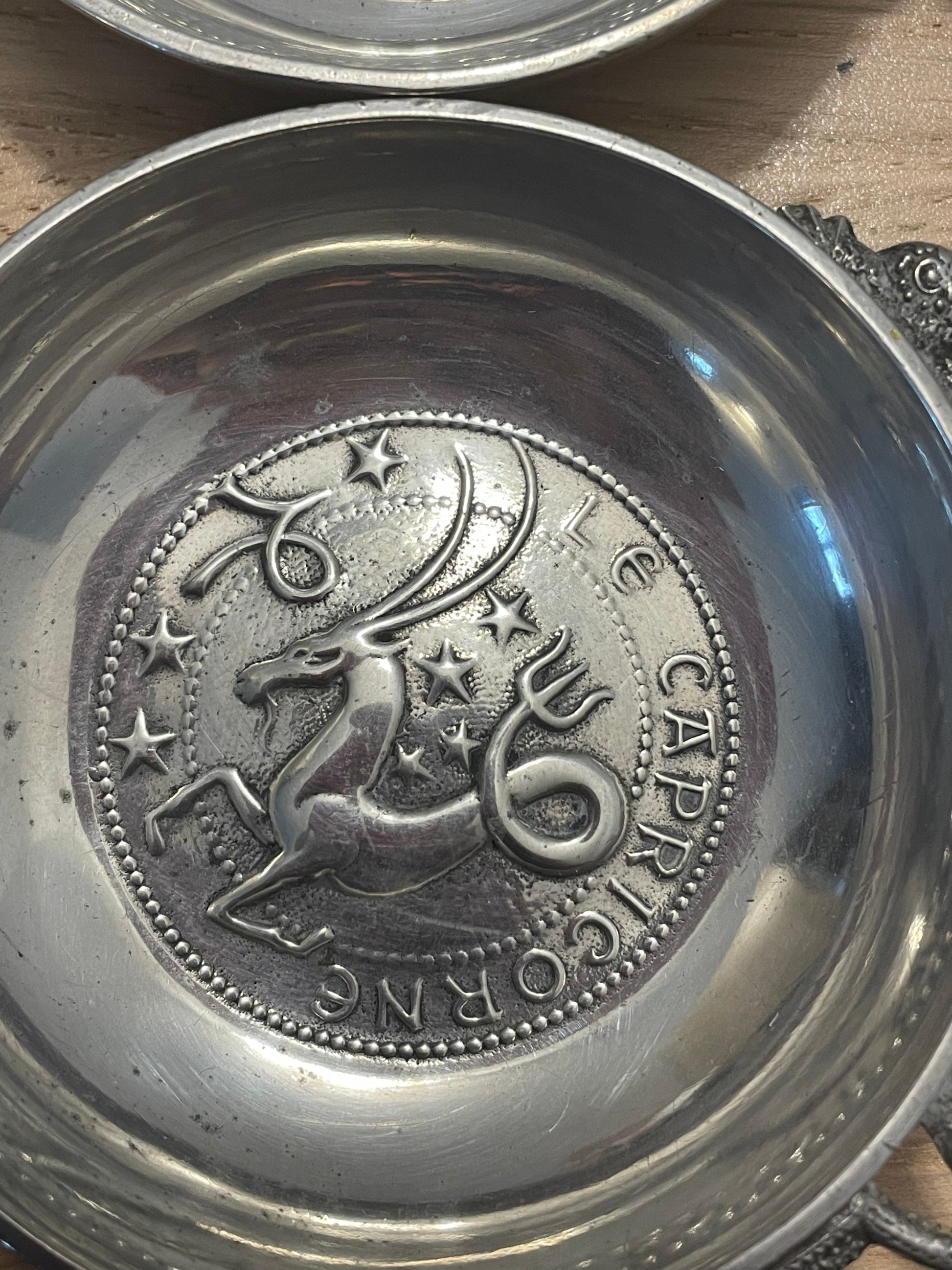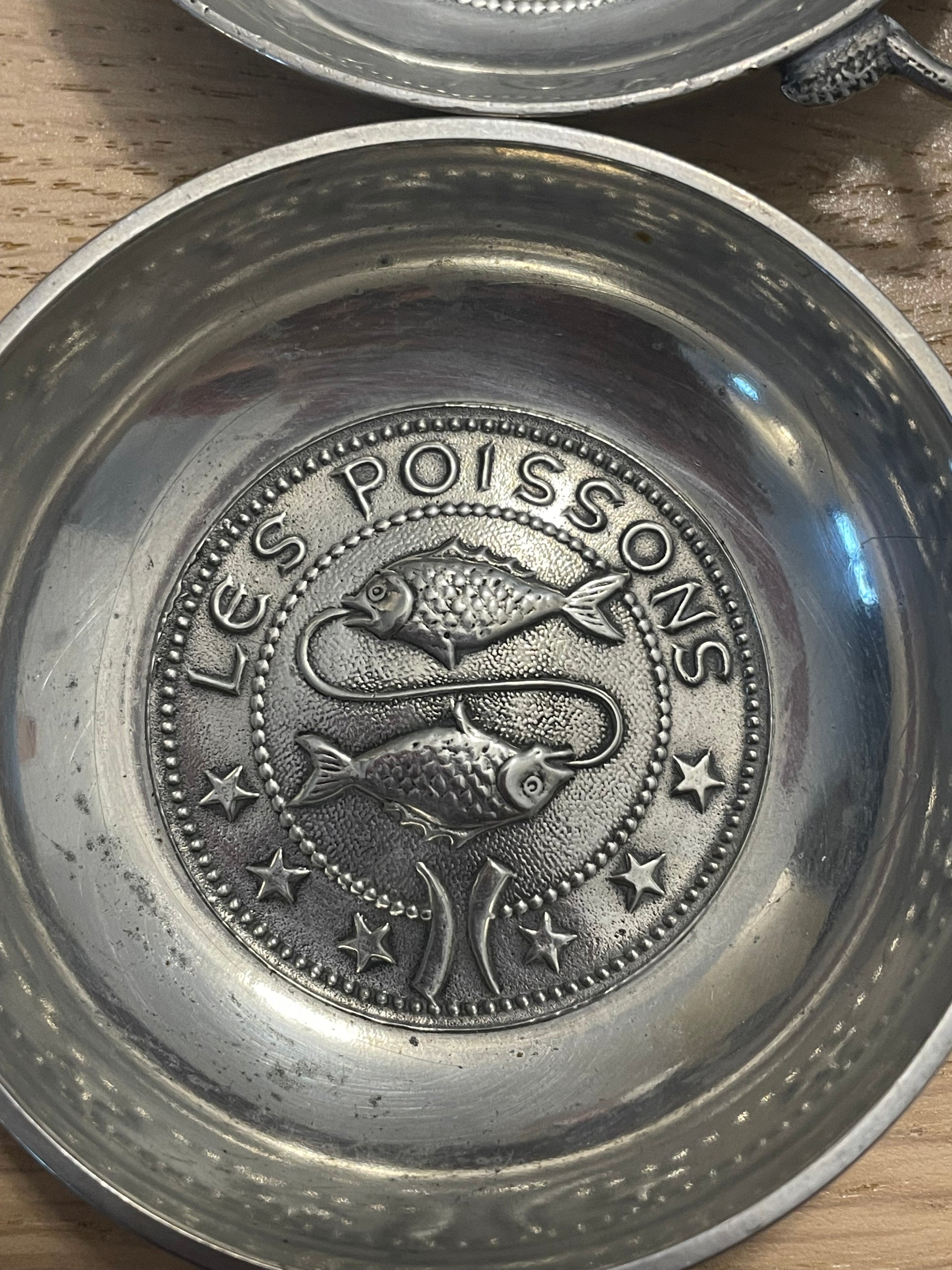 Un tempo, nelle cantine francesi, il taste-vin era lo strumento dei maestri cantinieri: una piccola coppa in peltro o argento, usata per osservare il colore del vino alla luce tremolante delle torce. Questi esemplari, firmati Étain d’Art, appartengono alla tradizione più raffinata: quattro coppe dedicate ai segni zodiacali, dove il sapere del vino incontra la poesia delle stelle. La luce scivola sul rilievo del metallo, disegnando arieti, bilance, pesci e capricorni come antiche costellazioni in una notte d’inverno. Perfetti da collezionare o da appendere in una enoteca d’epoca, come un omaggio alla cultura francese e ai rituali del vino.