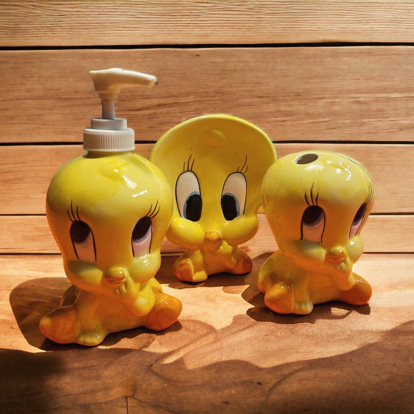 Chi non ama #titti ? Tutti almeno una volta nella vita abbiamo detto #mièsemblatodivedeleungatto 🐣👀 ed allora ecco il #setbagno #vintage in #porcellana a tema #looneytoons : c’è il #portasapone classico e quello per il liquido, e naturalmente il #portaspazzolini . E tutto l’ambiente diventa più allegro 🐱