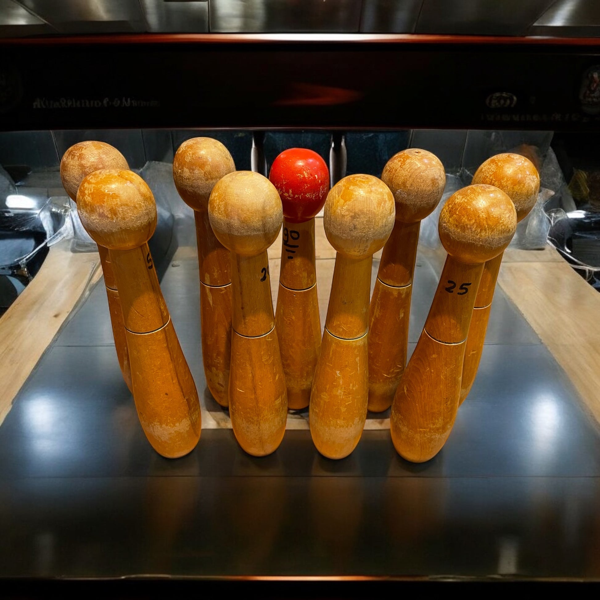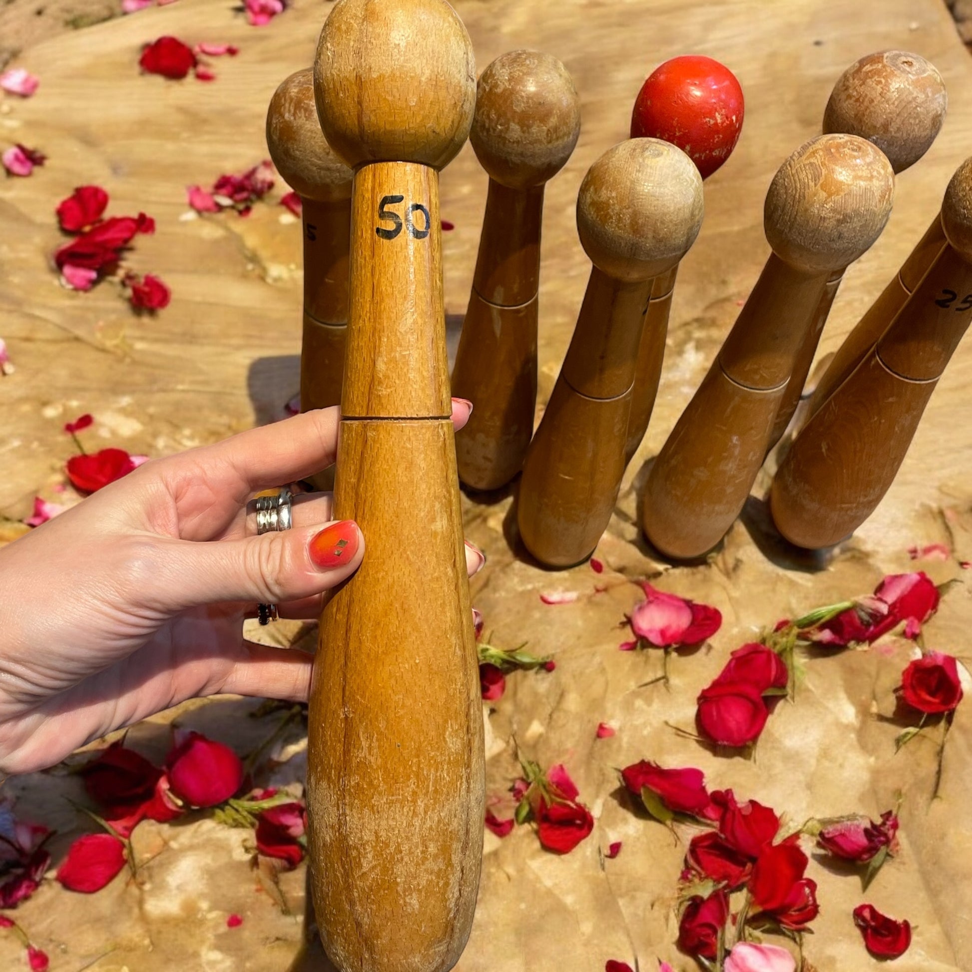 Questi 9 birilli in legno, alti circa 30 cm, appartengono a una variante del bowling pensata per l’interno, un passatempo che negli anni ’40 e ’50 trovava spazio nelle sale da gioco domestiche e nei circoli ricreativi. Non era raro che famiglie e amici si riunissero attorno a un tappeto o a una pista improvvisata, magari tra le sedie spostate del salotto, per sfidarsi in partite che sapevano mescolare abilità e divertimento. L’atmosfera era quella tipica delle serate conviviali dell’epoca: il crepitio della radio accesa in sottofondo, una bottiglia di vino aperta sul tavolo e le risate che accompagnavano ogni colpo ben riuscito — o ogni tiro maldestro che lasciava in piedi proprio quel maledetto birillo rosso, il più temuto e desiderato insieme, perché abbatterlo significava ribaltare la partita. La patina del legno, vissuta e levigata dal tempo, conserva il ricordo di mani che li hanno afferrati e sistemati mille volte, come piccoli trofei di un’epoca in cui il gioco era un’occasione per stare insieme. Un oggetto che ci invita a rivivere quei momenti: basta un tiro e, per un istante, si torna a quella serata degli anni ’40 o ’50, con la voce di Frank Sinatra che sussurra da una radio lontana e una palla che rotola lenta verso il birillo rosso… colpirà o lo sfiorerà appena?