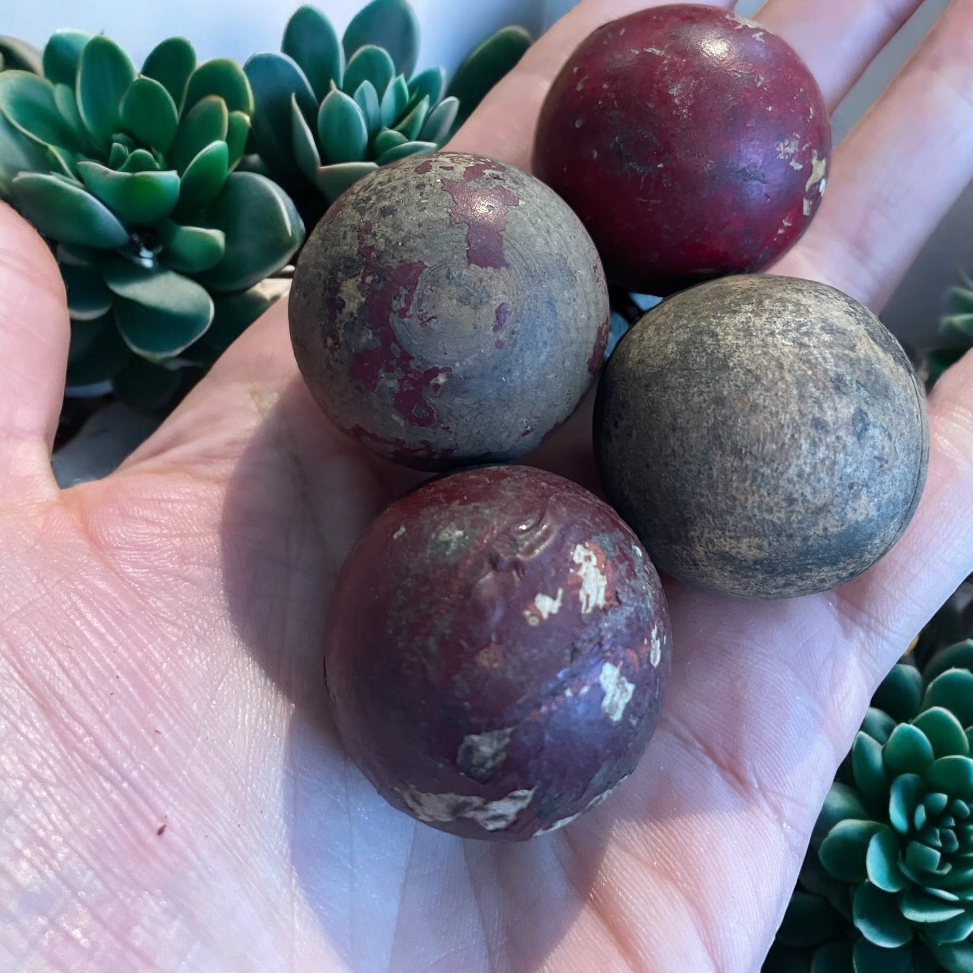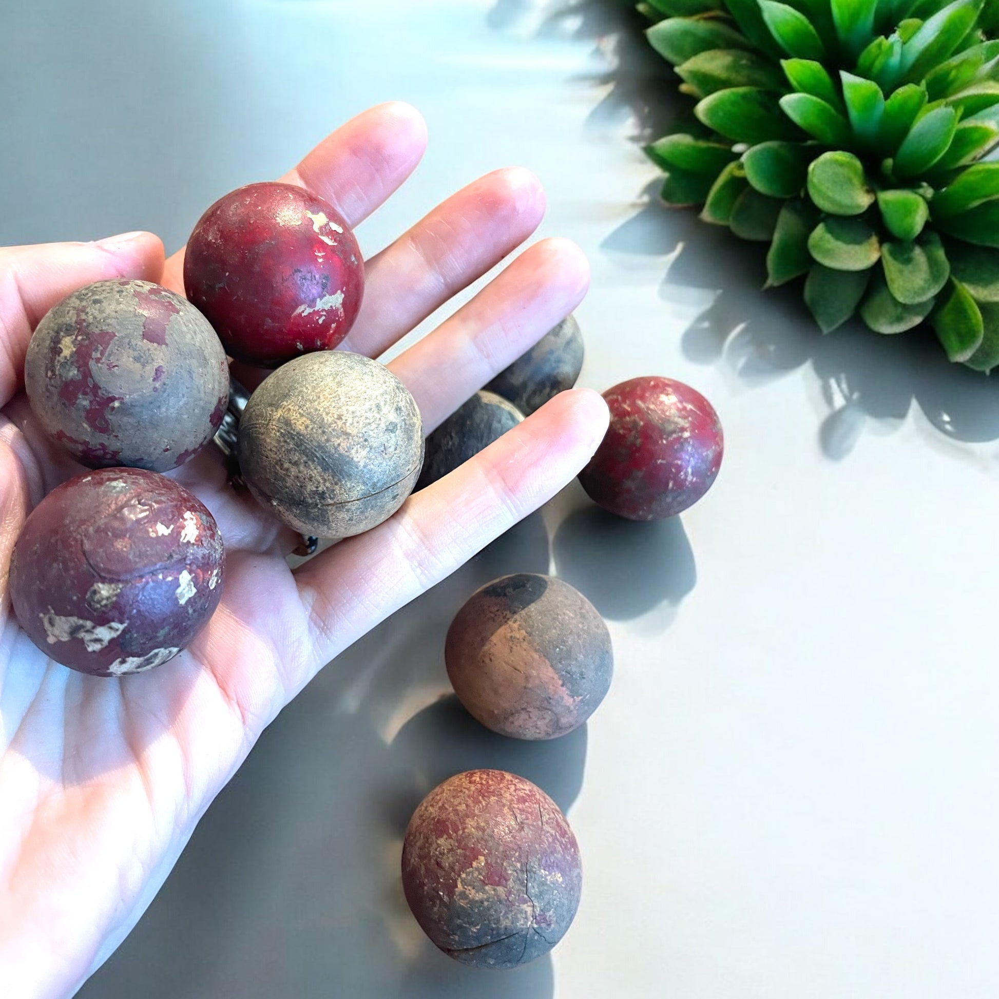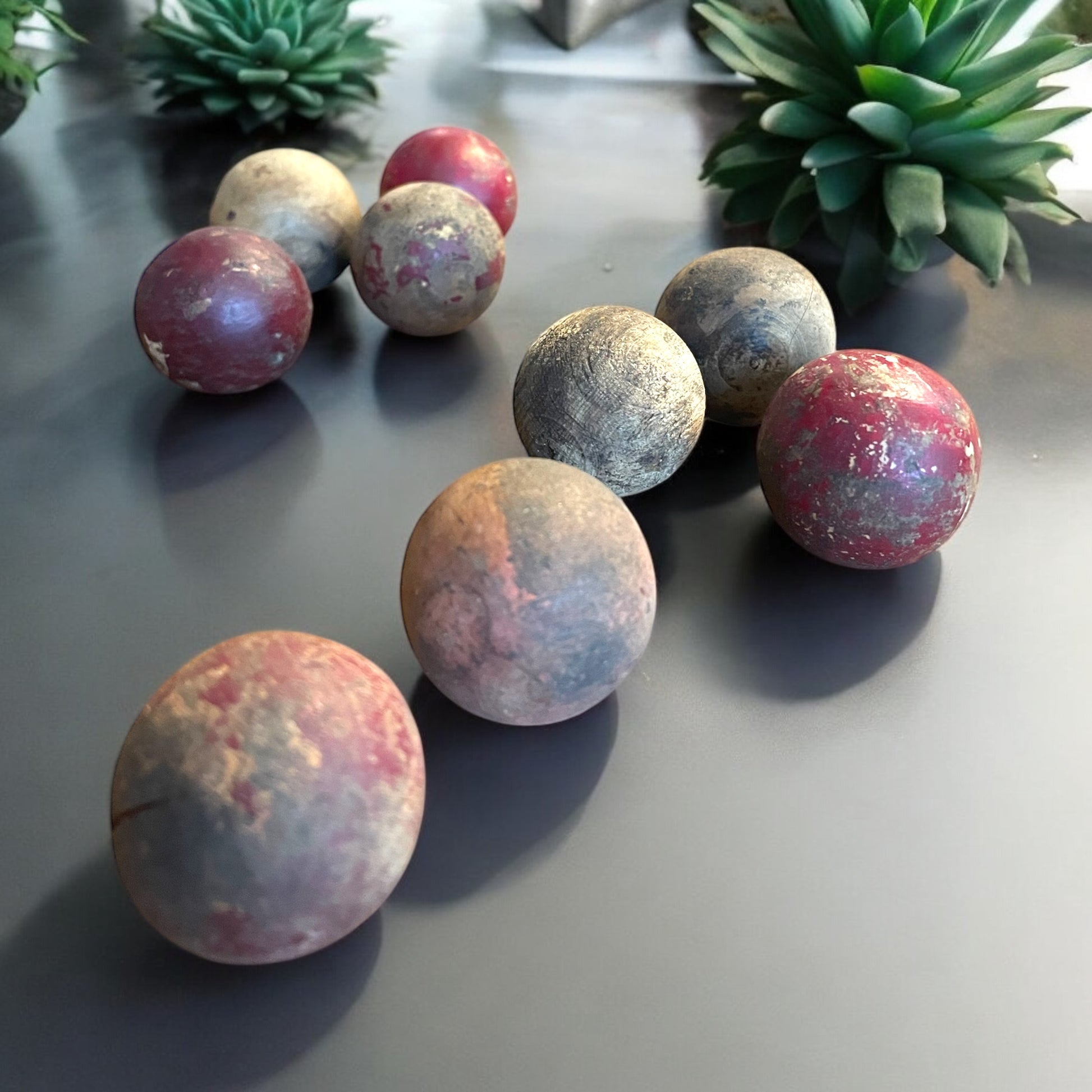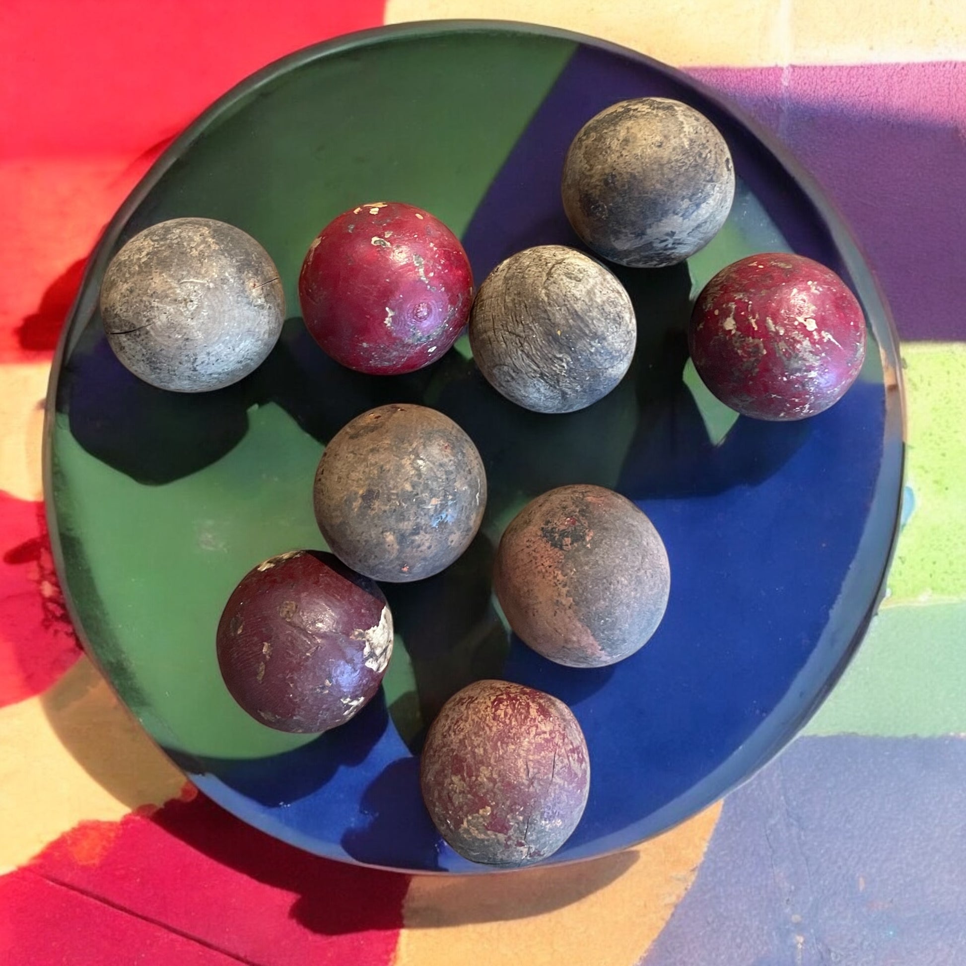 Piccole sfere del tempo – antiche palle in legno da jeu de boules. Immagina un cortile assolato, ombreggiato da un grande platano. Lì, tra risate e chiacchiere in dialetto, mani esperte lanciano piccole sfere in legno levigato verso un bersaglio invisibile. Queste nove palle, consumate dall’uso e dal tempo, raccontano proprio quelle giornate: partite improvvisate di jeu de boules, il tradizionale gioco popolare che animava i pomeriggi dei villaggi francesi. In legno tornito, alcune ancora conservano tracce della vernice rossa originaria, come un’eco lontana della loro vivacità. Ogni segno, ogni usura, è una storia: un rimbalzo troppo forte, una risata, un ricordo. Perfette come oggetti decorativi per chi ama lo charme d’antan, ma anche come pezzi da collezione per gli appassionati di giochi storici. Nota: vi propongo insieme i birilli d’epoca gia pubblicati, ideali da abbinare per completare un set da gioco vintage o creare un allestimento suggestivo.