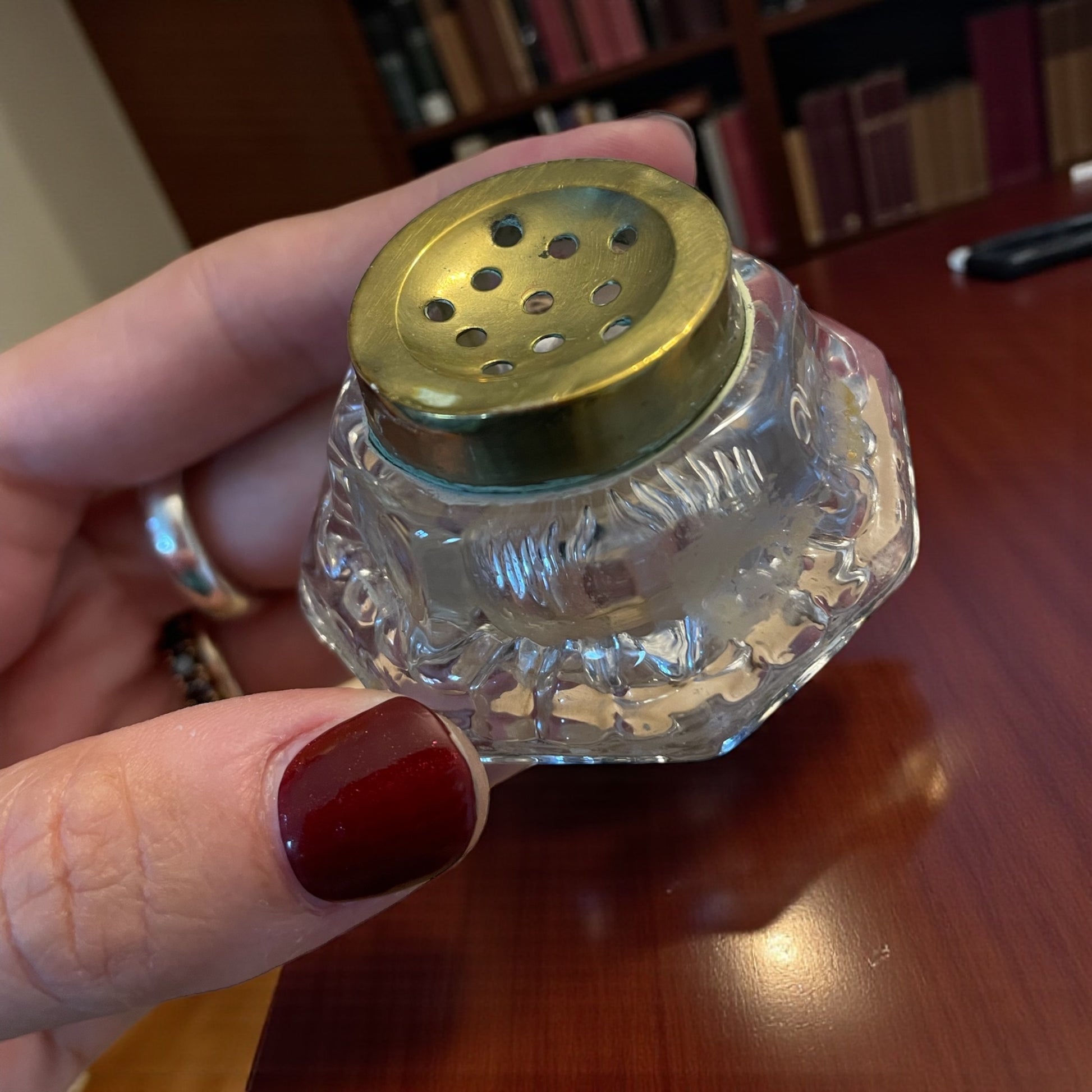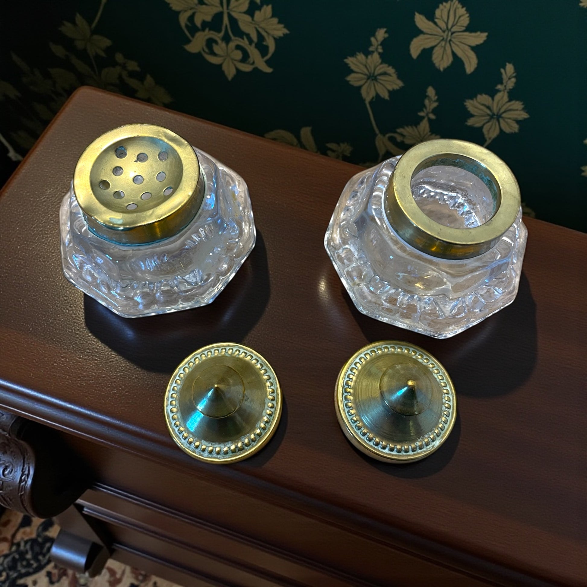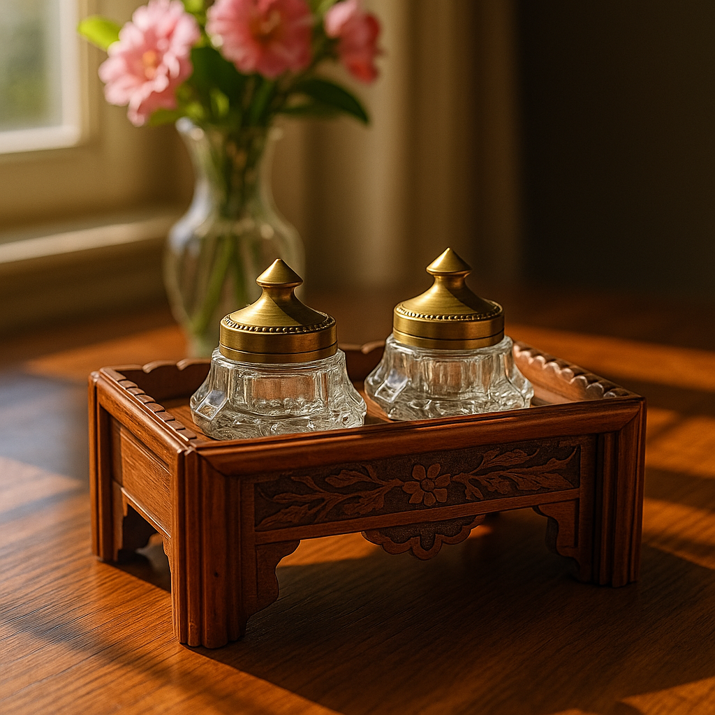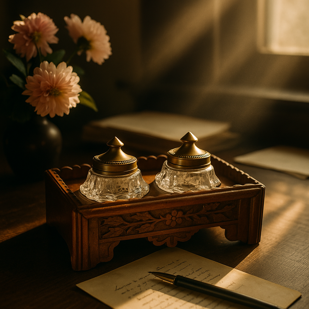 Quest’oggetto appartiene a un tempo in cui le parole nascevano lentamente, scivolando dal pennino come gocce di pensiero. Su ogni scrivania ordinata, accanto al foglio di carta spessa e alla penna stilografica, troneggiava un piccolo altare della scrittura: il porta-calamaio. Questo elegante esemplare degli anni ’40-’50, intagliato in legno con decori floreali, custodisce due boccette in vetro pesante dai tappi in ottone dorato. Uno dei due vasetti serviva per l’inchiostro, l’altro — quello con i fori sul coperchio — conteneva la polvere d’amido o sabbia fine che(curiosità che non tutti conoscono) sparsa delicatamente sulla pagina appena scritta asciugava l’inchiostro impedendogli di sbavare. Era il gesto conclusivo di ogni lettera, quasi un piccolo rito di chiusura, prima di piegare il foglio e sigillarlo. Osservandolo oggi si immagina il profumo della carta, il fruscio dei fogli, il lento ritmo del pensiero che si fa parola. Oggetto dallo charme discreto e dal sapore d’altri tempi, capace di restituire il fascino della scrittura vissuta con calma e intenzione.