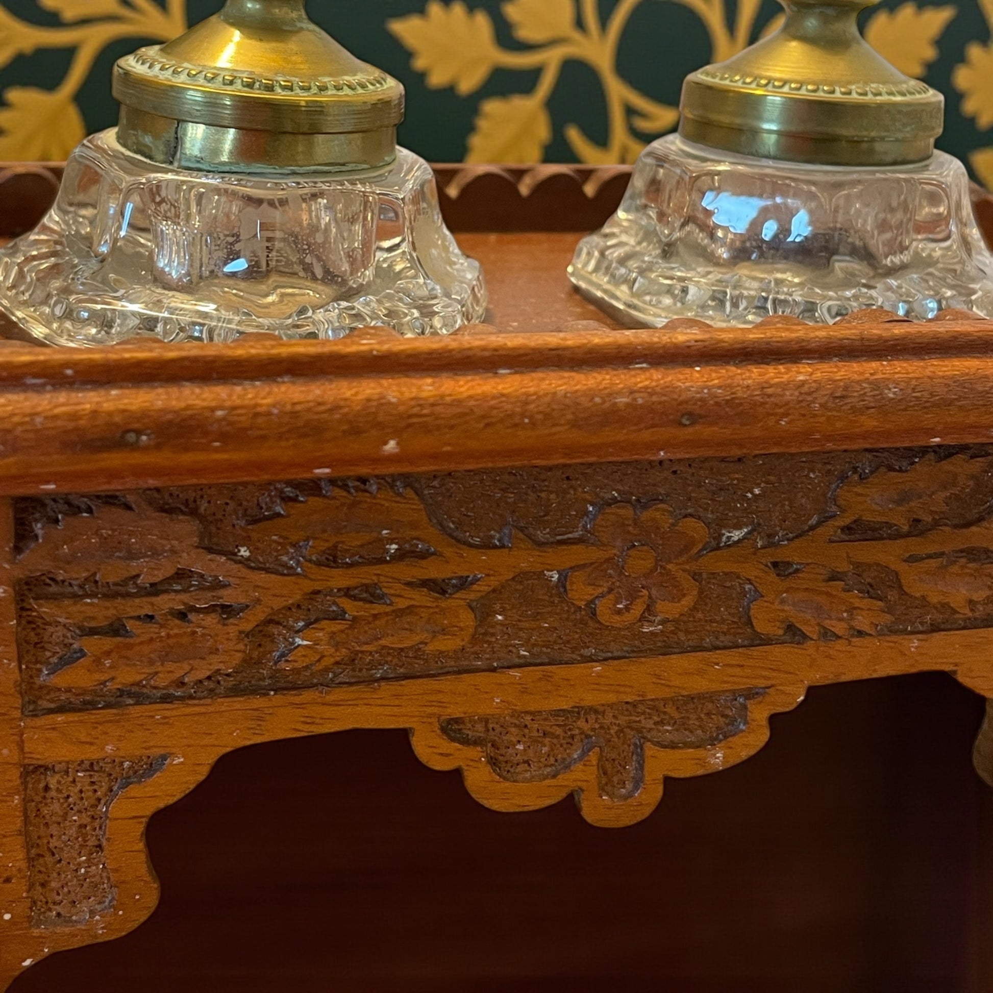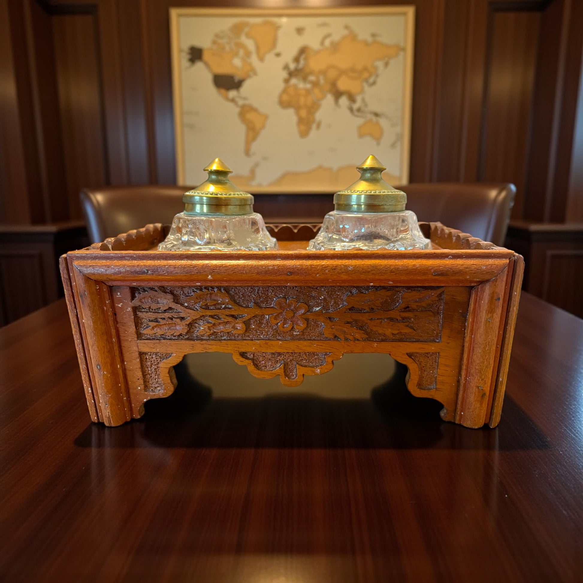 Set da Studio porta calamai in legno intagliato con due calamai, anni 40 50.