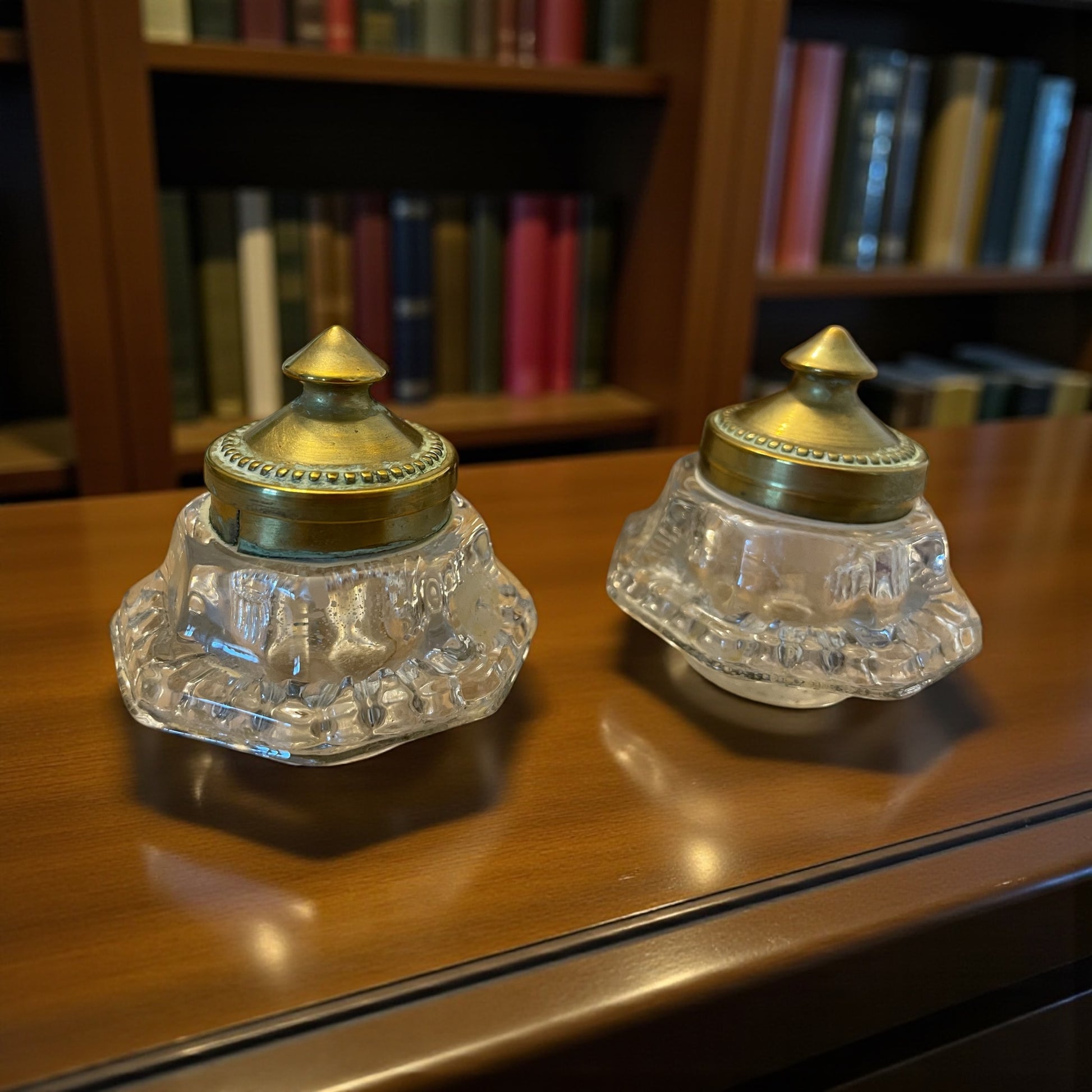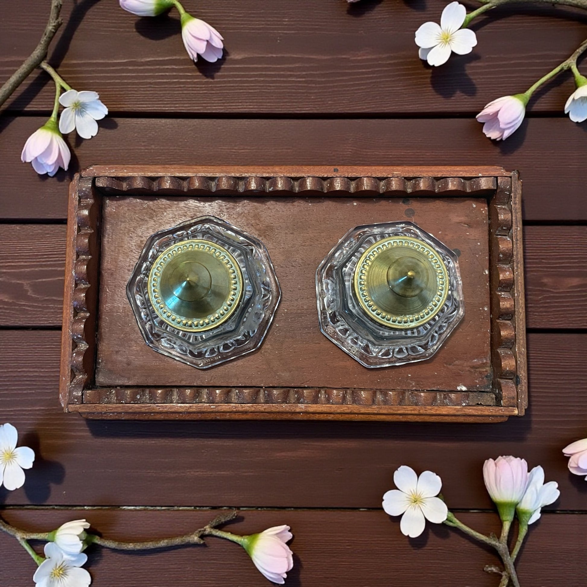 Epoca: Anni 1940-1950. Materiale supporto: Legno intagliato. Materiale calamai: Vetro pressato spesso. Tappi: Ottone con decoro perlinato. Funzione: Doppio calamaio da scrivania; uno per inchiostro, uno per polvere asciuga inchiostro. Condizioni: Buone, con lievi segni del tempo coerenti con l’età. Dimensioni del supporto: 16,5 x 10 x 7 cm.