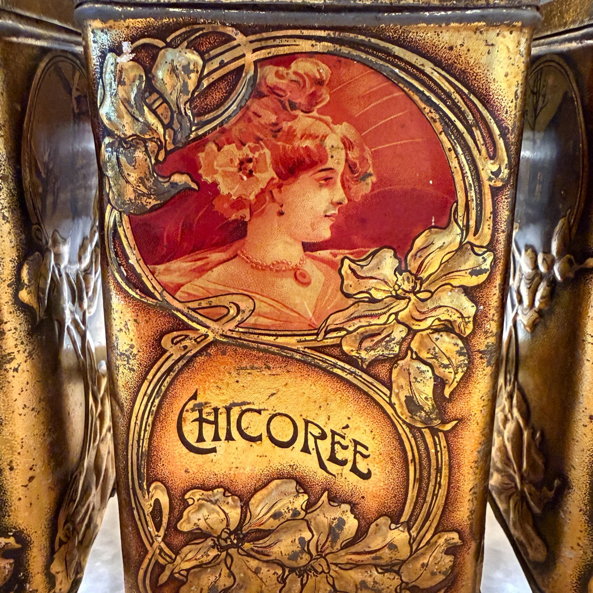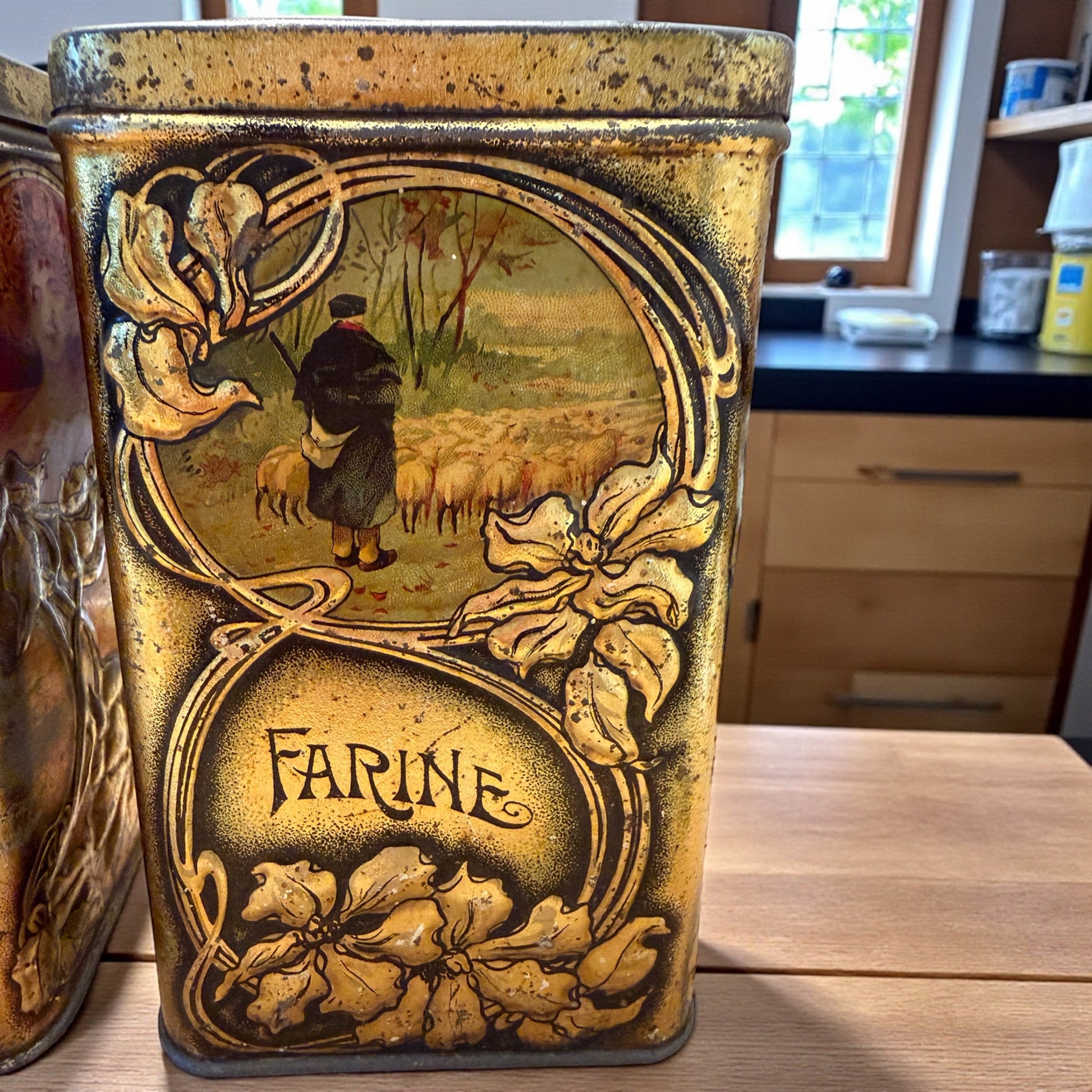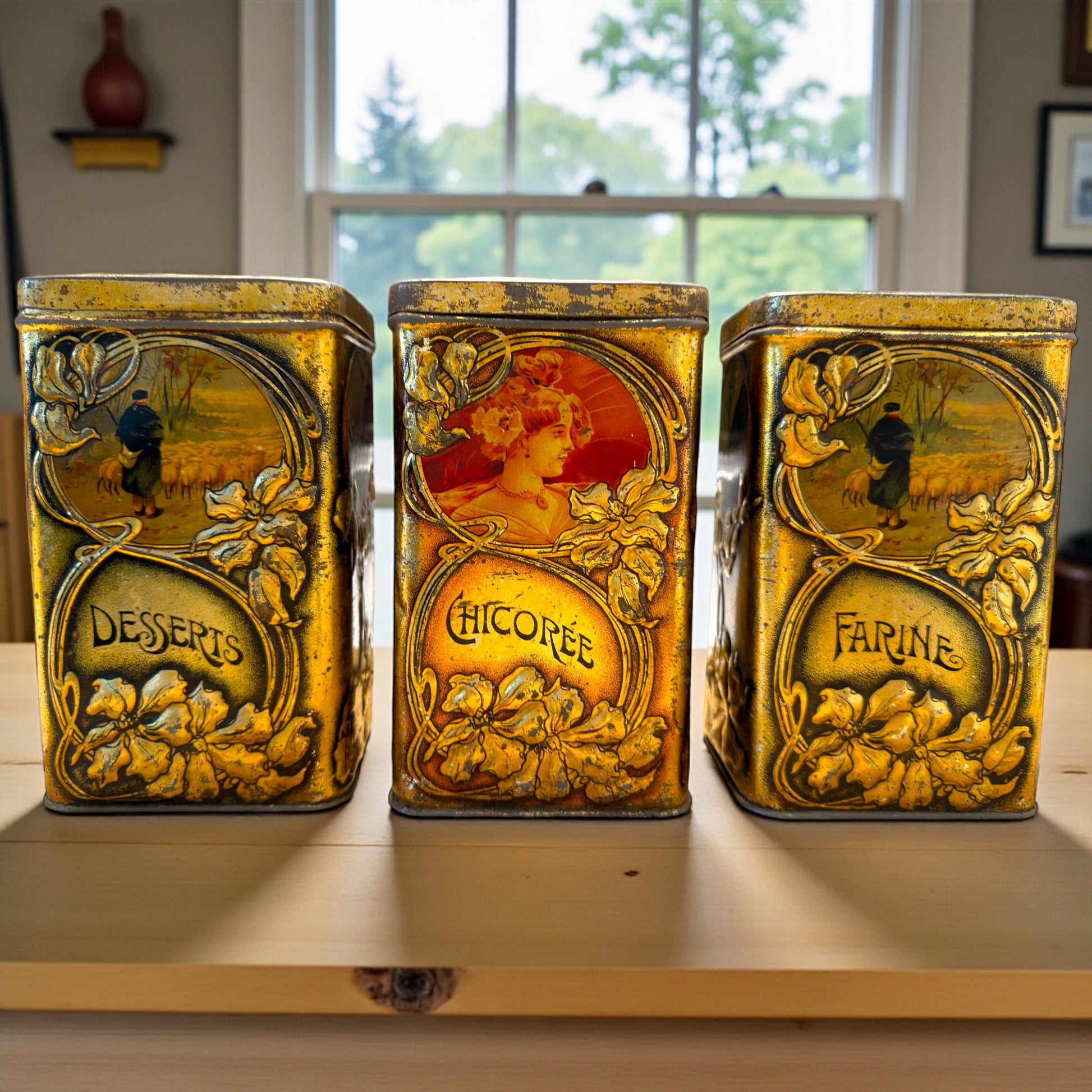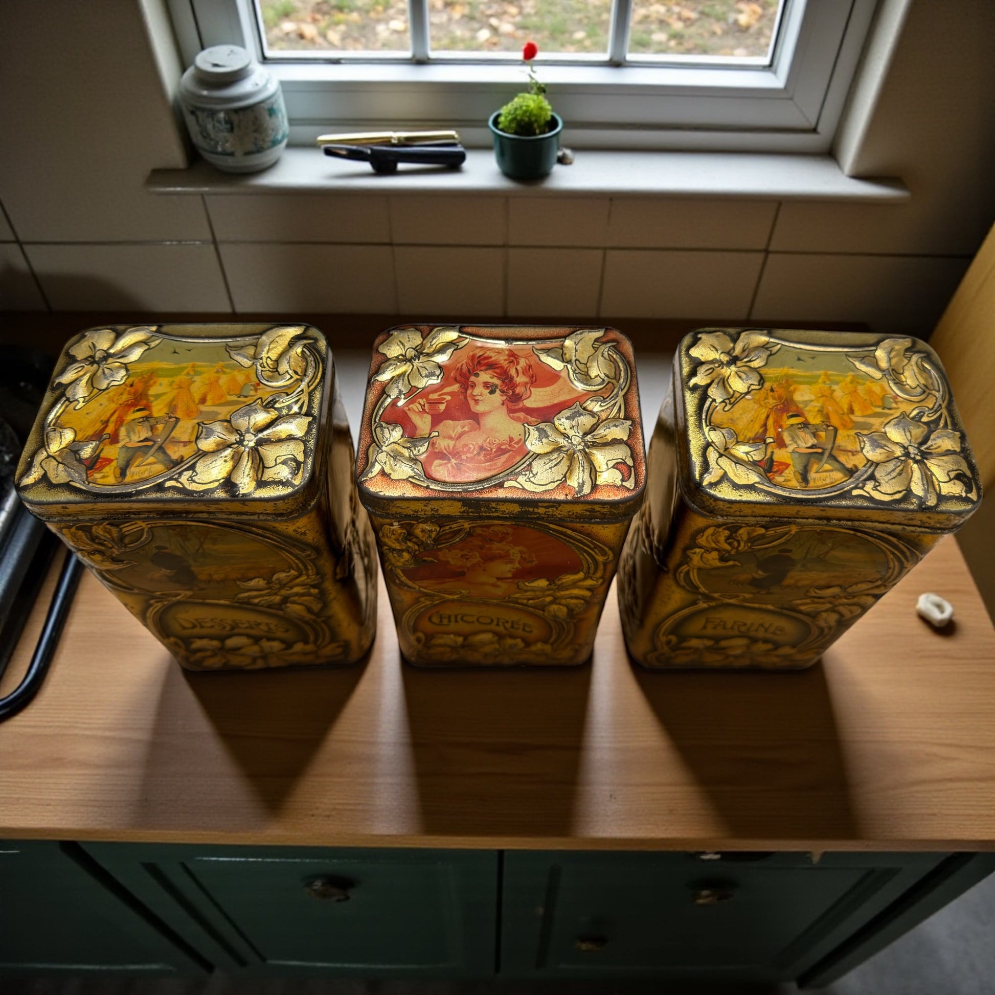 Set n. 3 antiche scatole di latta Leroux Cambrai rarissime art Nouveau per cicoria, dolci e farina.