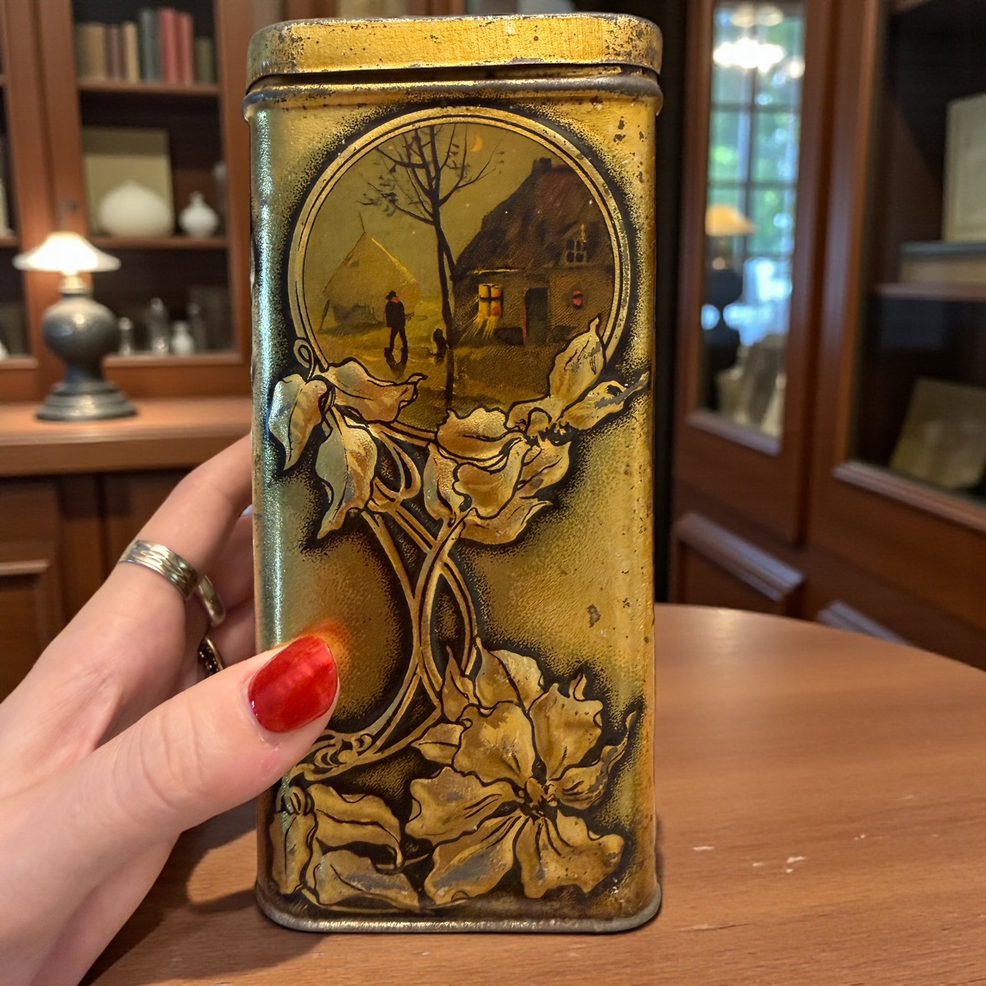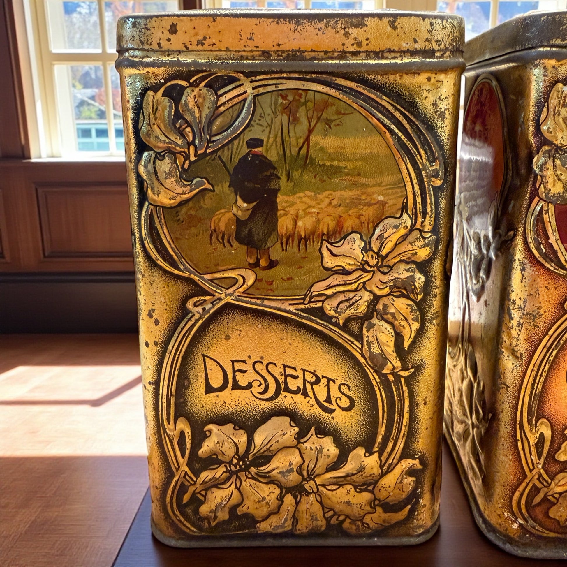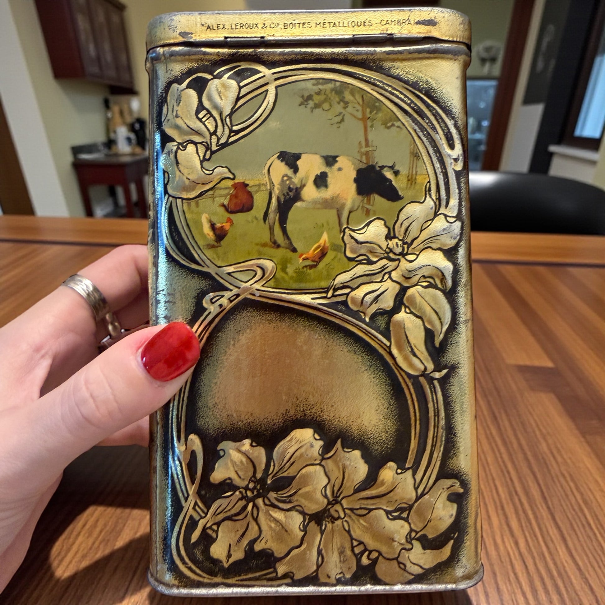 Queste tre scatole sono CAPOLAVORI DELL’ARTE ma non nascono per essere ammirate da lontano, bensì per essere aperte ogni giorno. Farina, cicoria, dolci: il cuore della cucina di fine Ottocento, raccontato attraverso il linguaggio sinuoso e floreale del Liberty. Qui l’Art Nouveau non resta su un piedistallo: scende, entra nelle case, si lascia toccare. Le linee morbide, i fiori, le figure femminili idealizzate convivono con la ripetizione del gesto quotidiano, con le mani che lavorano, impastano, misurano. È uno dei rari momenti in cui l’arte incontra davvero la vita - ed è un cortocircuito potentissimo! Le immagini sono rassicuranti, quasi lente: scene rurali, natura, nutrimento. Servivano a portare armonia in uno spazio che era anche fatica. Non oggetti di lusso allora, lo sono diventati oggi per il loro valore artistico ed iconografico. Al tempo erano oggetti pensati con cura, dove la bellezza si faceva presenza silenziosa nelle mani di cuoche e fantesche. Un set che racconta un’epoca in cui anche la cucina era un luogo attraversato dall’arte, e in cui il quotidiano non era escluso dalla poesia.