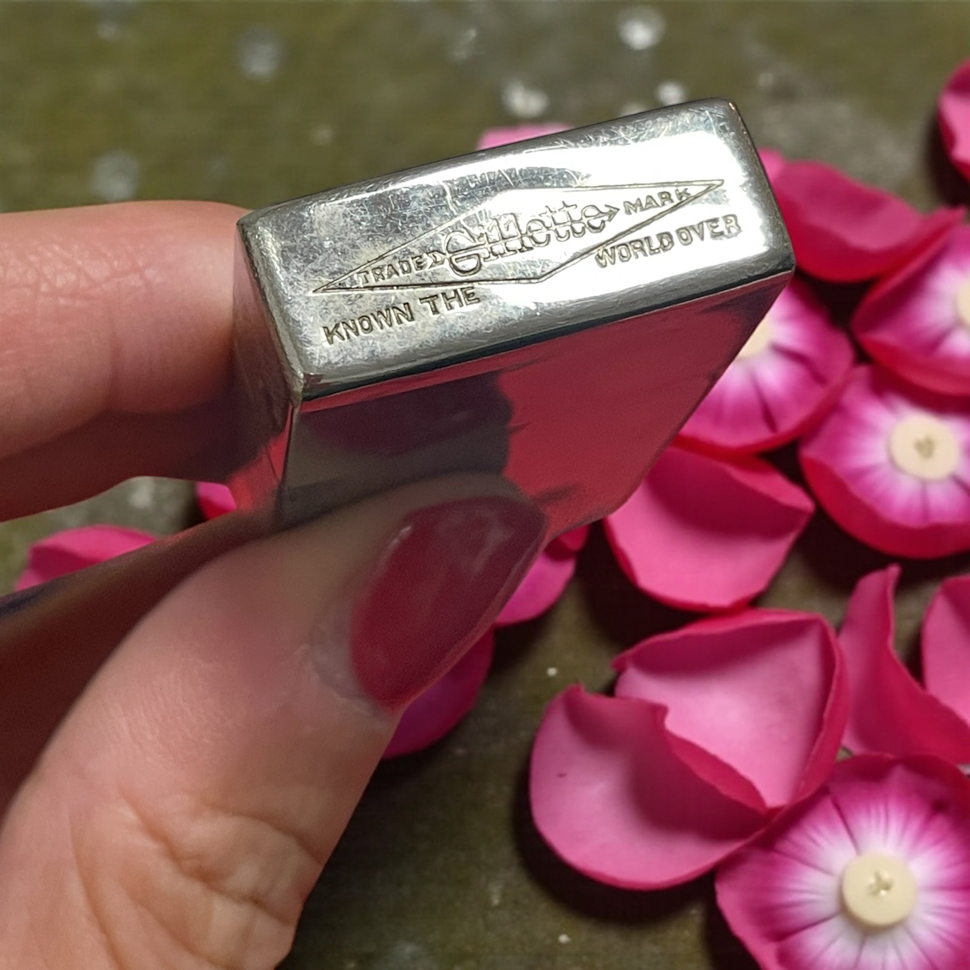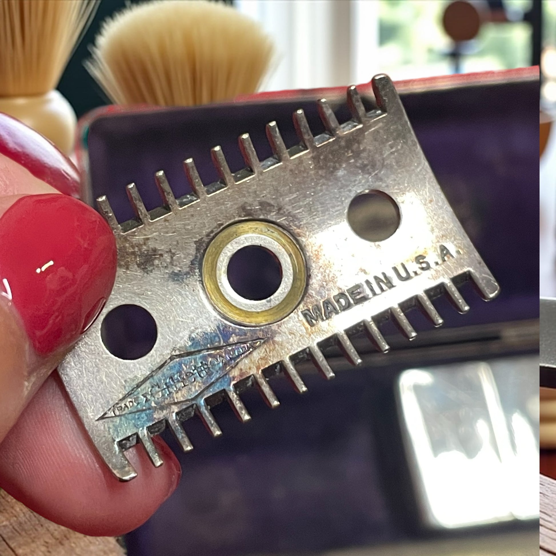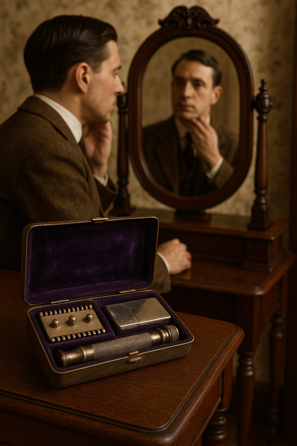 Questo rasoio da viaggio Gillette – custodito nella sua elegante scatola in metallo con interno in velluto viola – sembra raccontare la storia di un uomo che non rinunciava mai alla dignità del proprio aspetto, neppure lontano da casa. Me lo immagino poggiato accanto a una bacinella d’acqua in una stanza d’albergo del 1920, o forse in una tenda militare durante la Grande Guerra, quando radersi ogni mattina non era solo un’abitudine, ma un modo per restare umani. Bastava avvitare le tre parti, inserire la lama, e quel piccolo rito di ordine ristabiliva un frammento di identità. Prodotto negli Stati Uniti tra il 1915 e il 1925, questo set accompagnava viaggiatori, militari e professionisti che attraversavano il mondo in treno, in nave, forse su uno dei primi aerei. La custodia compatta, la solidità del metallo nichelato e la precisione del meccanismo raccontano una cultura fatta di affidabilità, di cura e di cose costruite per durare. Un frammento di storia maschile, un simbolo di quel tempo in cui prendersi cura di sé era un atto di disciplina e stile. È uno di quegli oggetti che portano con sé il peso delicato delle vite che hanno toccato.