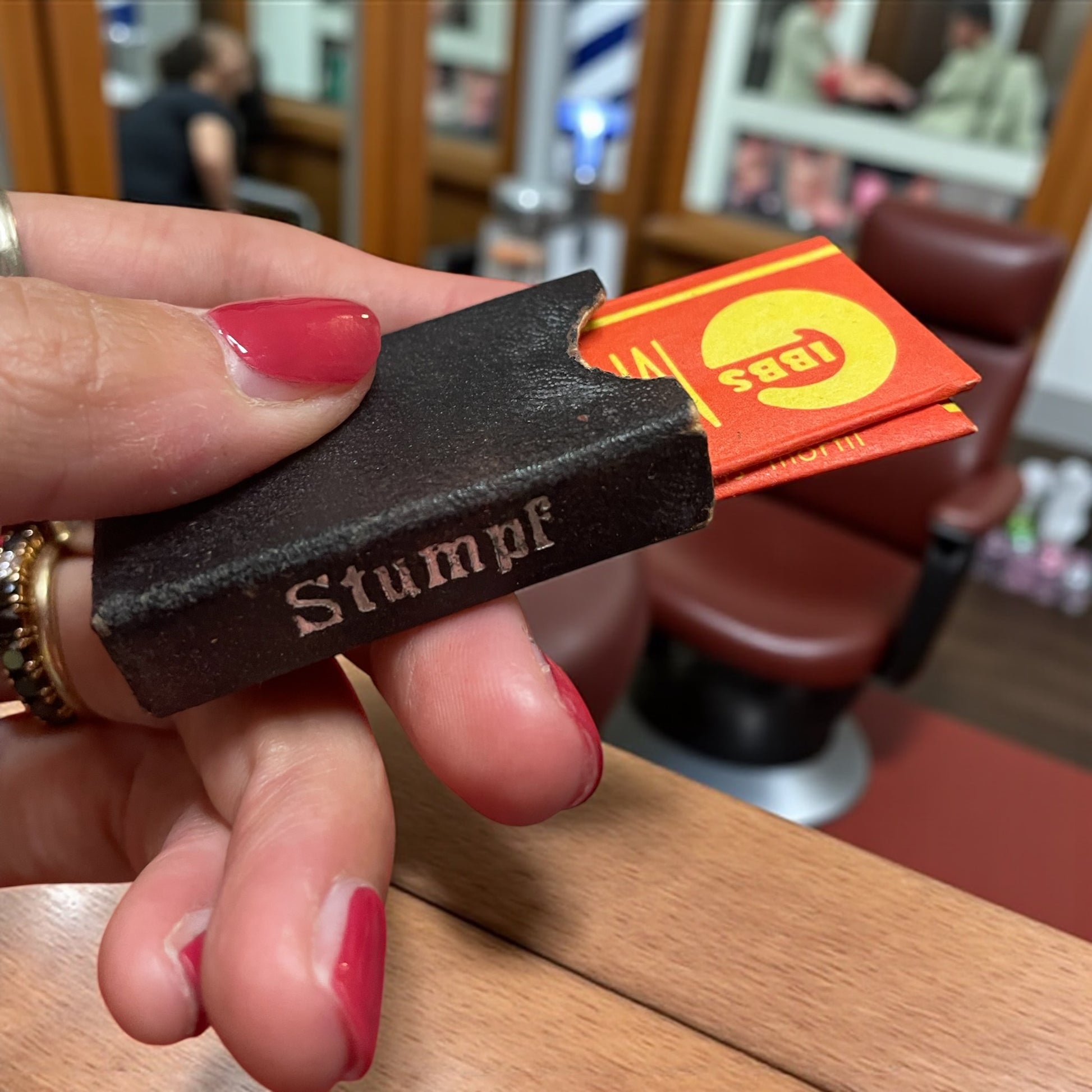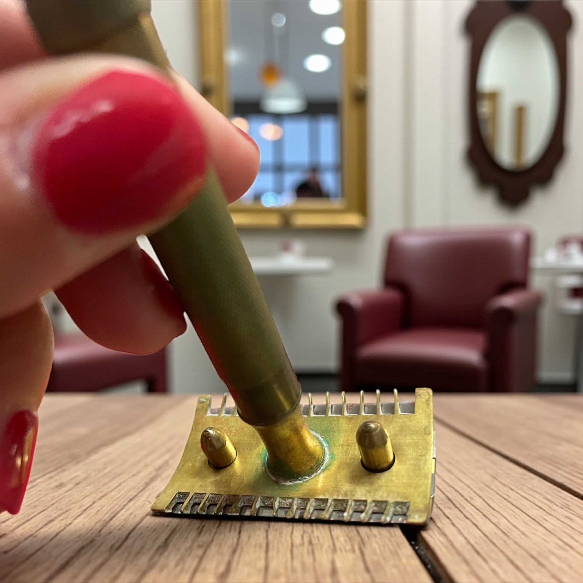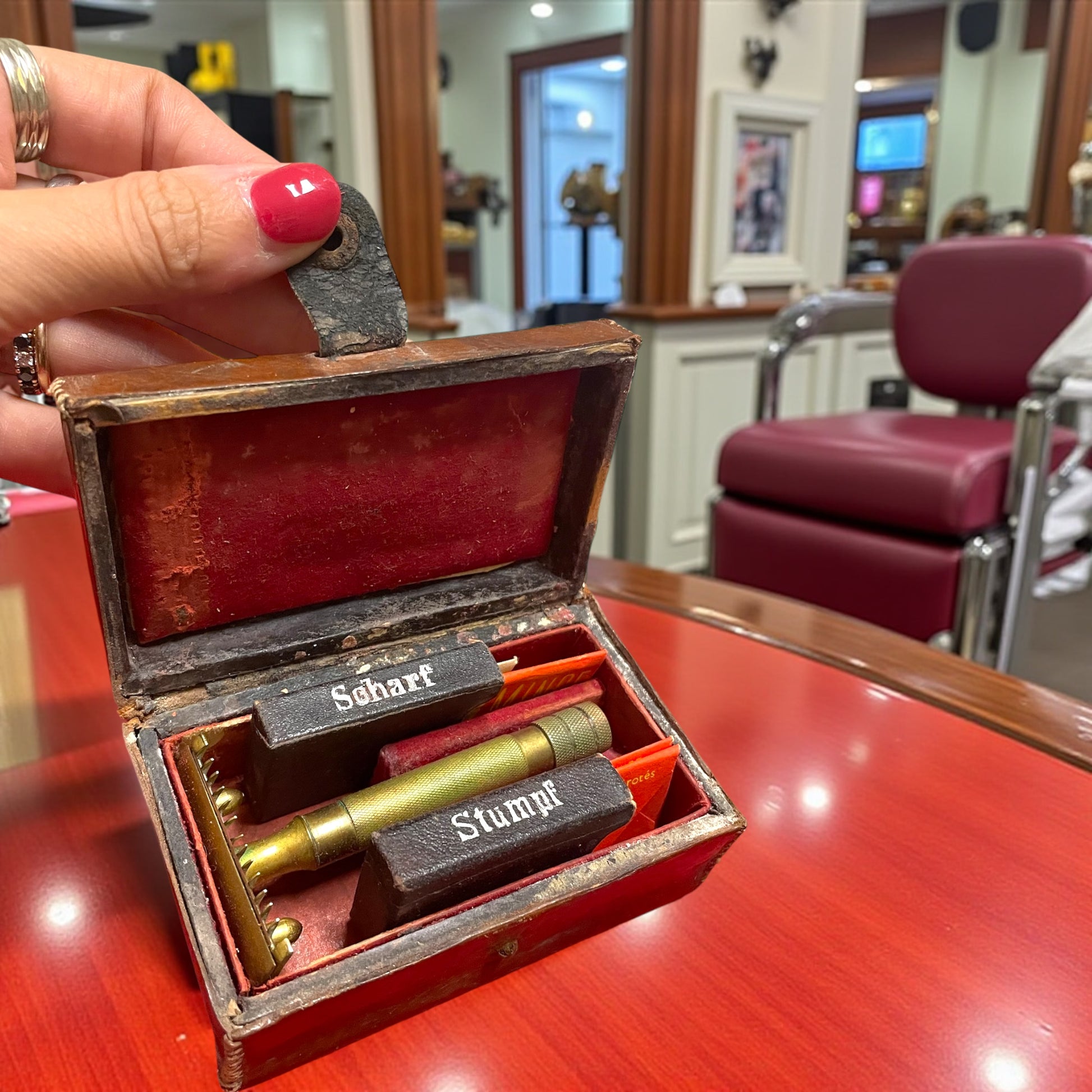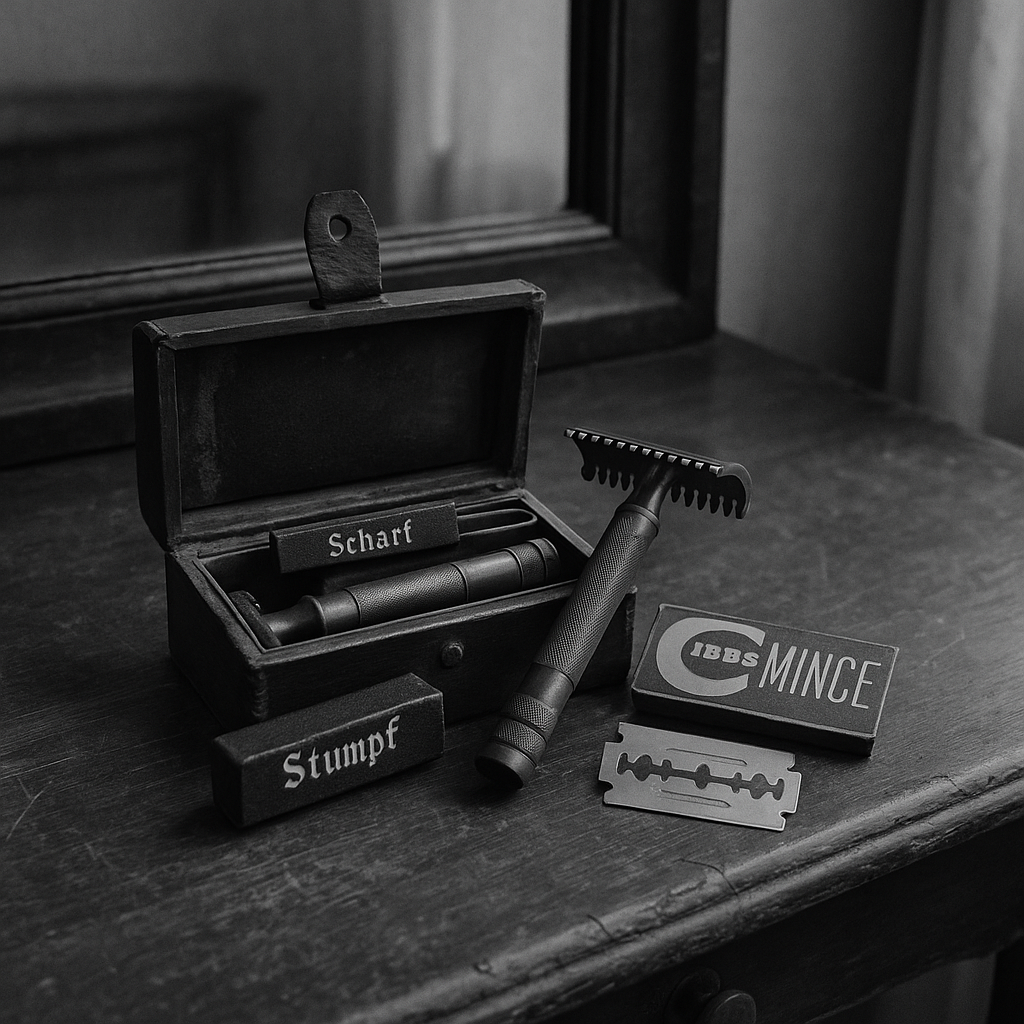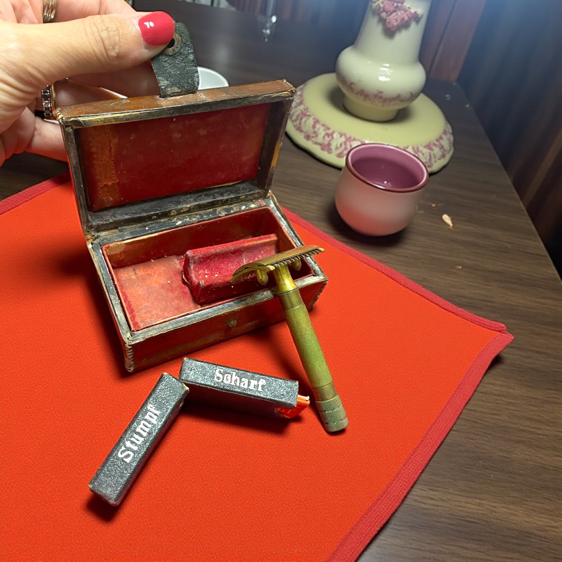 Un gesto antico, la luce del mattino sul metallo: e il tempo si fa barba e silenzio. Apri il piccolo scrigno marrone e trovi un compagno di viaggio di inizio Novecento: un rasoio di sicurezza in ottone, a pettine aperto, nato quando la cura di sé era un rito calmo. Nella custodia rossa due portalamette segnano il ritmo — Scharf per l’affilato, Stumpf per ciò che ha dato tutto — mentre le Gibbs francesi attendono il loro turno, sottili come promesse (“mince”). Immagino una stanza d’albergo, un treno da prendere, l’acqua calda in una bacinella e il profumo del sapone: la mano gira il manico zigrinato, appoggia la lama, un respiro, poi il suono breve del pettine sul viso. È un oggetto sincero: non chiede di brillare, preferisce la patina delle cose fedeli. E quando lo chiudi, tutto rientra al suo posto, pronto per il prossimo viaggio. Se ti piace circondarti di oggetti che sanno raccontare mentre stanno zitti, questo rasoio è un piccolo rituale che torna vivo ogni volta che lo guardi. Ti va di immaginare chi lo abbia portato con sé e in quali mattini lo abbia usato?
