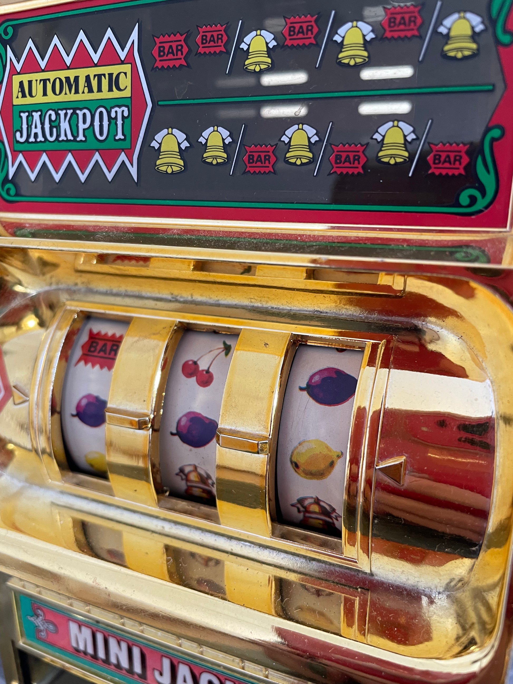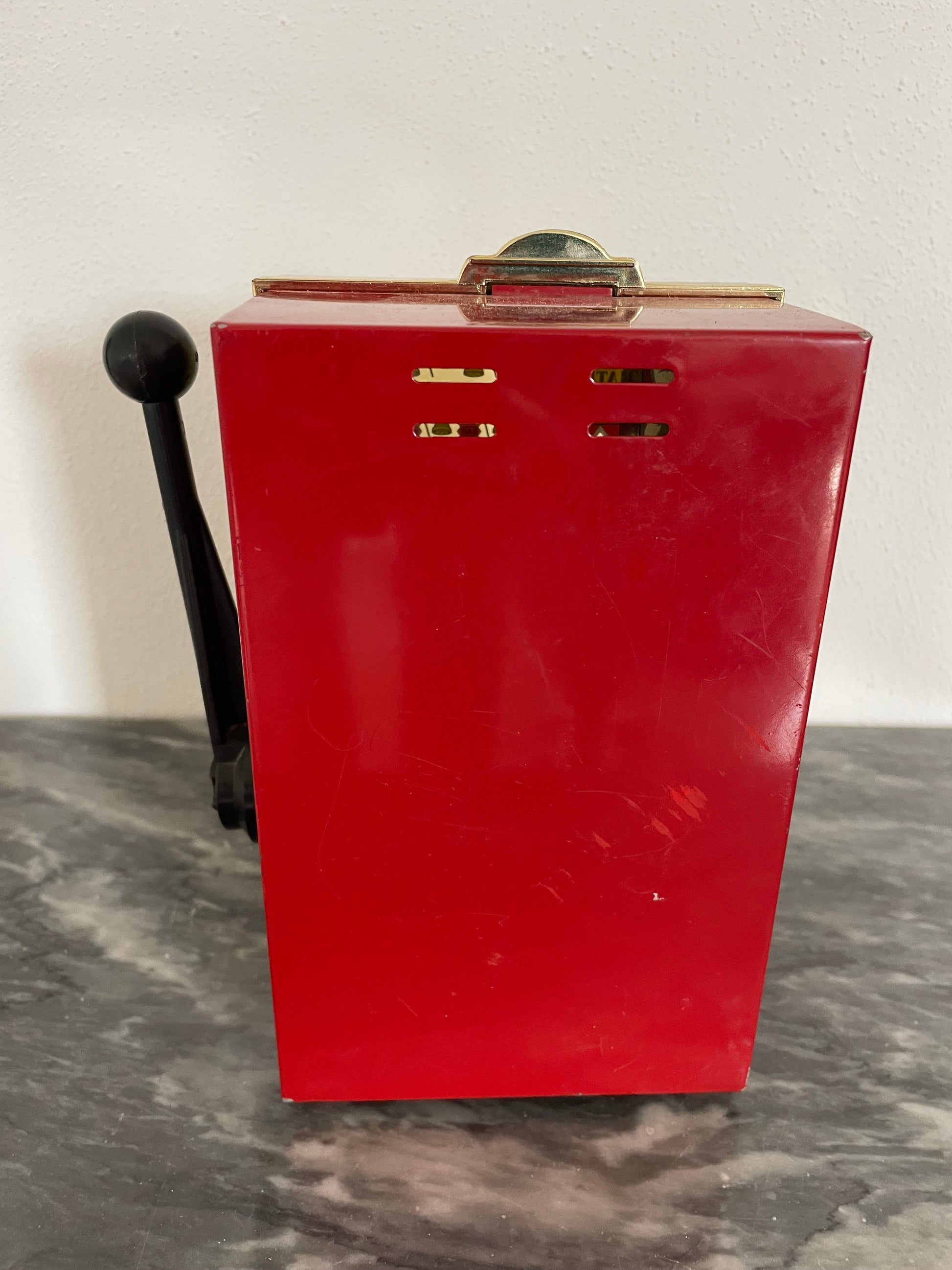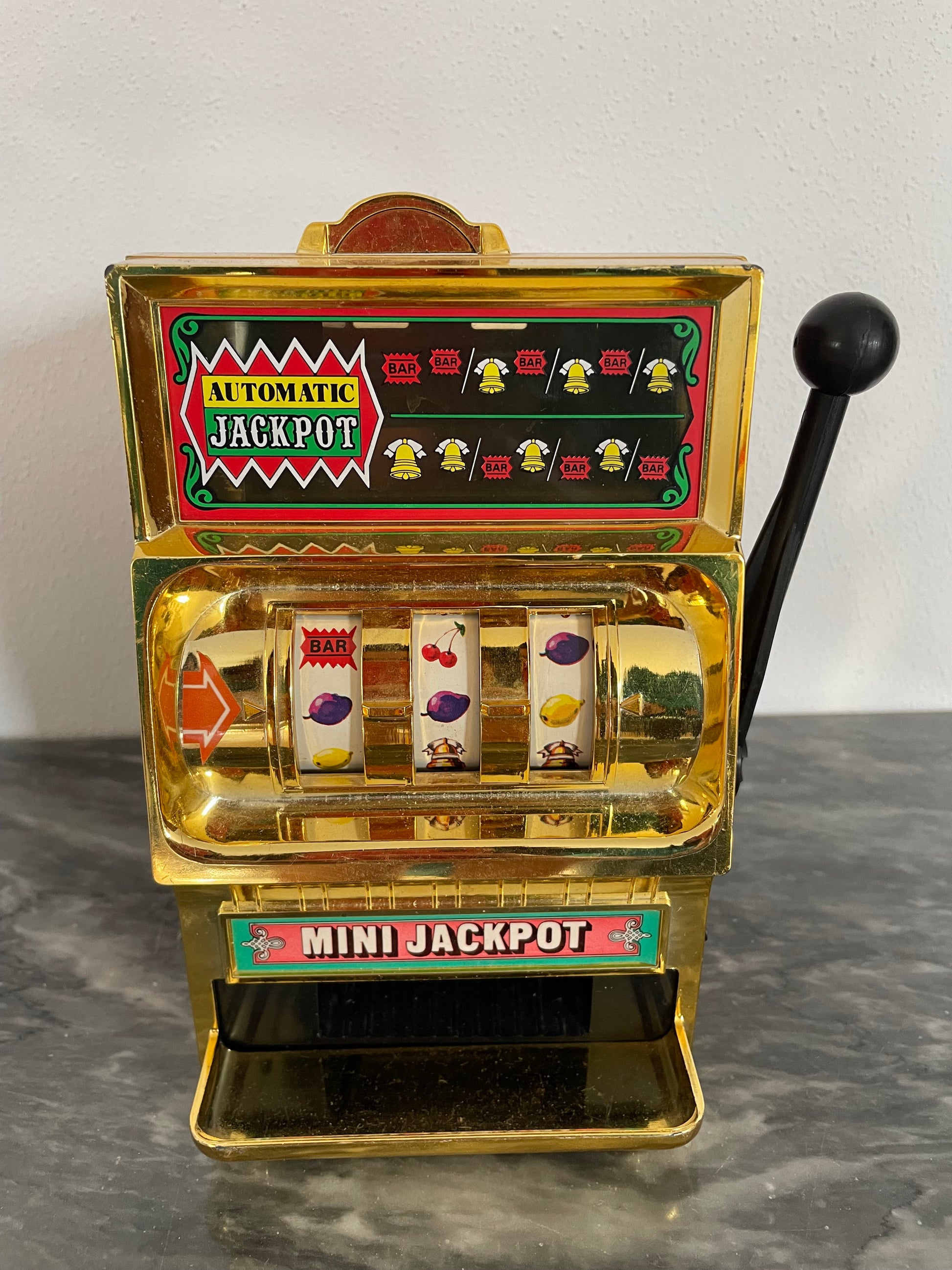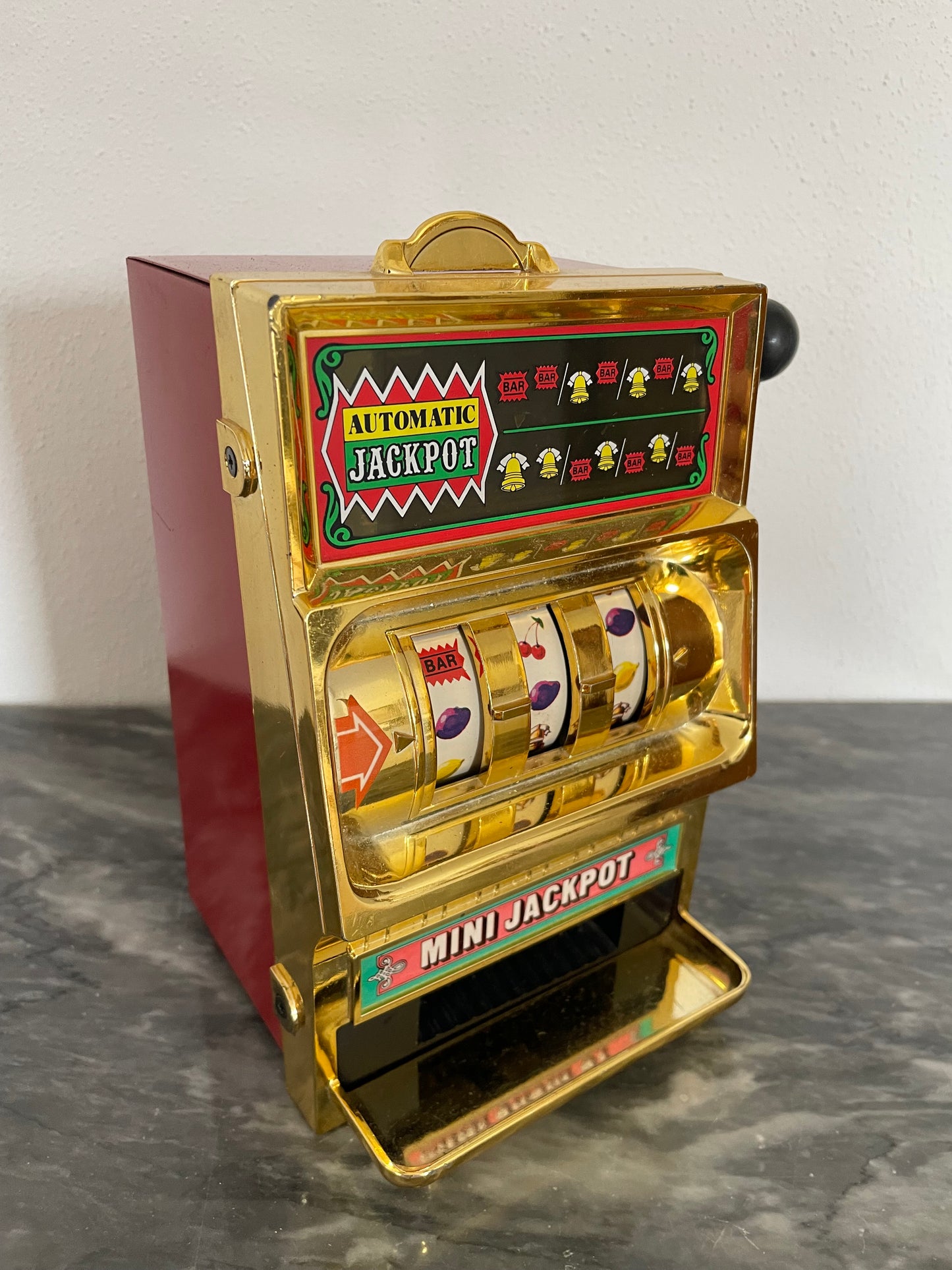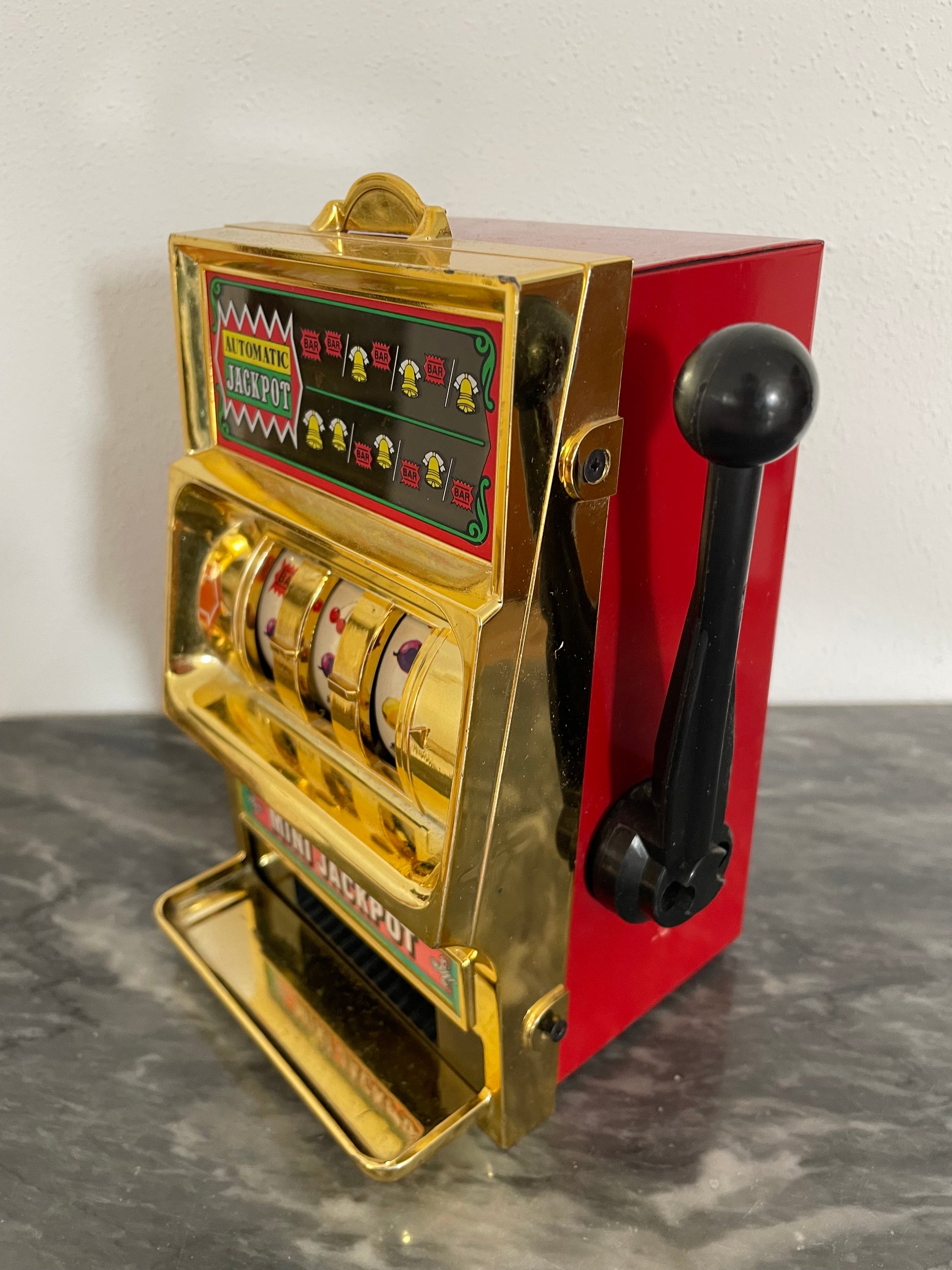 Modernariato ricercato: si tratta di una slot-machine anni 80 in miniatura realizzata in ferro dalla ben conosciuta Waco, fatta in Giappone. Queste slot-machine sono molto ricercate, la manopola funziona correttamente e le combinazioni cambiano di volta in volta. Non vengono erogati i soldi. Bel pezzo da collezione.