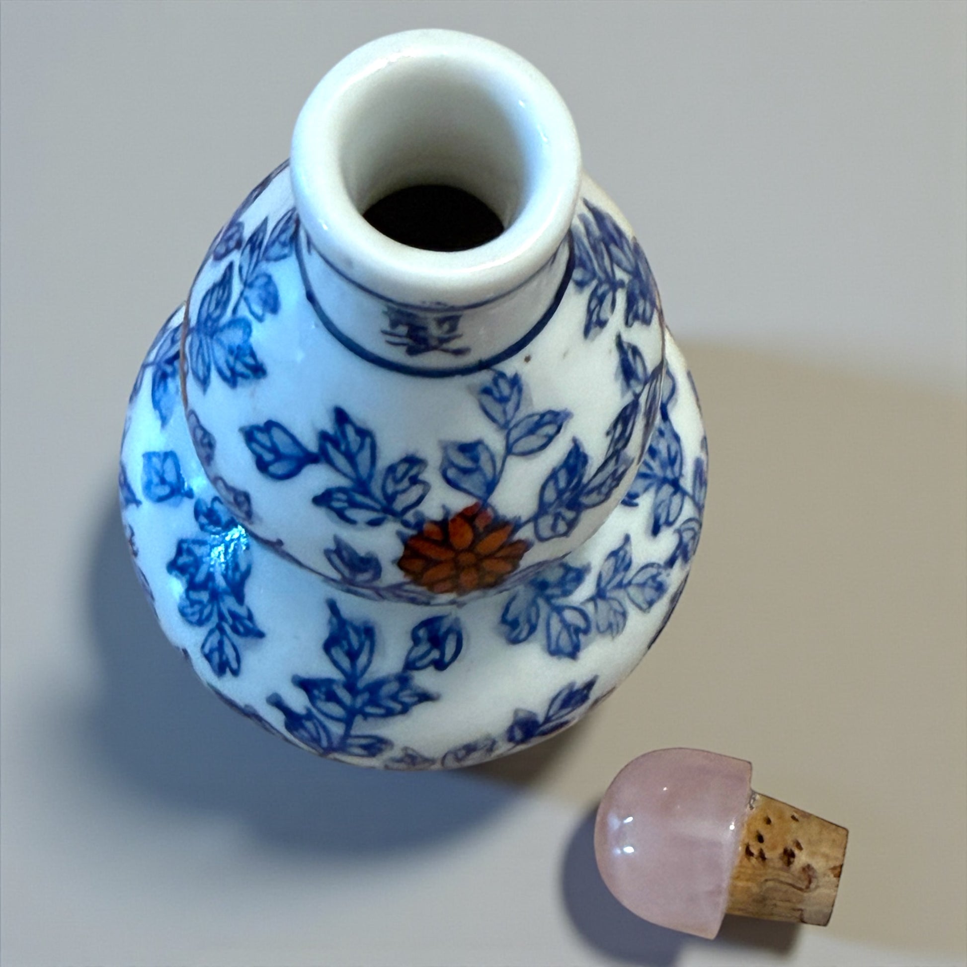 Una piccola zucca di porcellana che porta con sé l’eco dei simboli antichi. ✨ Ci sono oggetti che catturano lo sguardo per la loro semplice bellezza, e altri che sembrano suggerire qualcosa in più — un gesto di cura, un augurio, un significato nascosto. Questa snuff bottle in porcellana nasce proprio così. Il blu cobalto, colore della quiete e della profondità, si intreccia al rosso caldo dei fiori, simbolo di vitalità e buon auspicio. In Cina, l’incontro tra blu e rosso è considerato una piccola benedizione visiva: equilibrio, fortuna, energia che prende forma. La sagoma a doppia zucca (hulu) non è casuale: nelle tradizioni orientali rappresenta la protezione, la longevità e il contenere il bene. È un amuleto benevolo, una forma gentile che “abbraccia” ciò che custodisce. Il suo tappo in quarzo rosa, morbido alla vista e naturalmente luminoso, completa l’insieme con un richiamo alla calma e all’armonia. Un oggetto delizioso, nato nella seconda metà del Novecento per essere bello, rassicurante e simbolico. Un piccolo tocco di poesia orientale, pronto per la tua casa o per un regalo che parla con eleganza.
