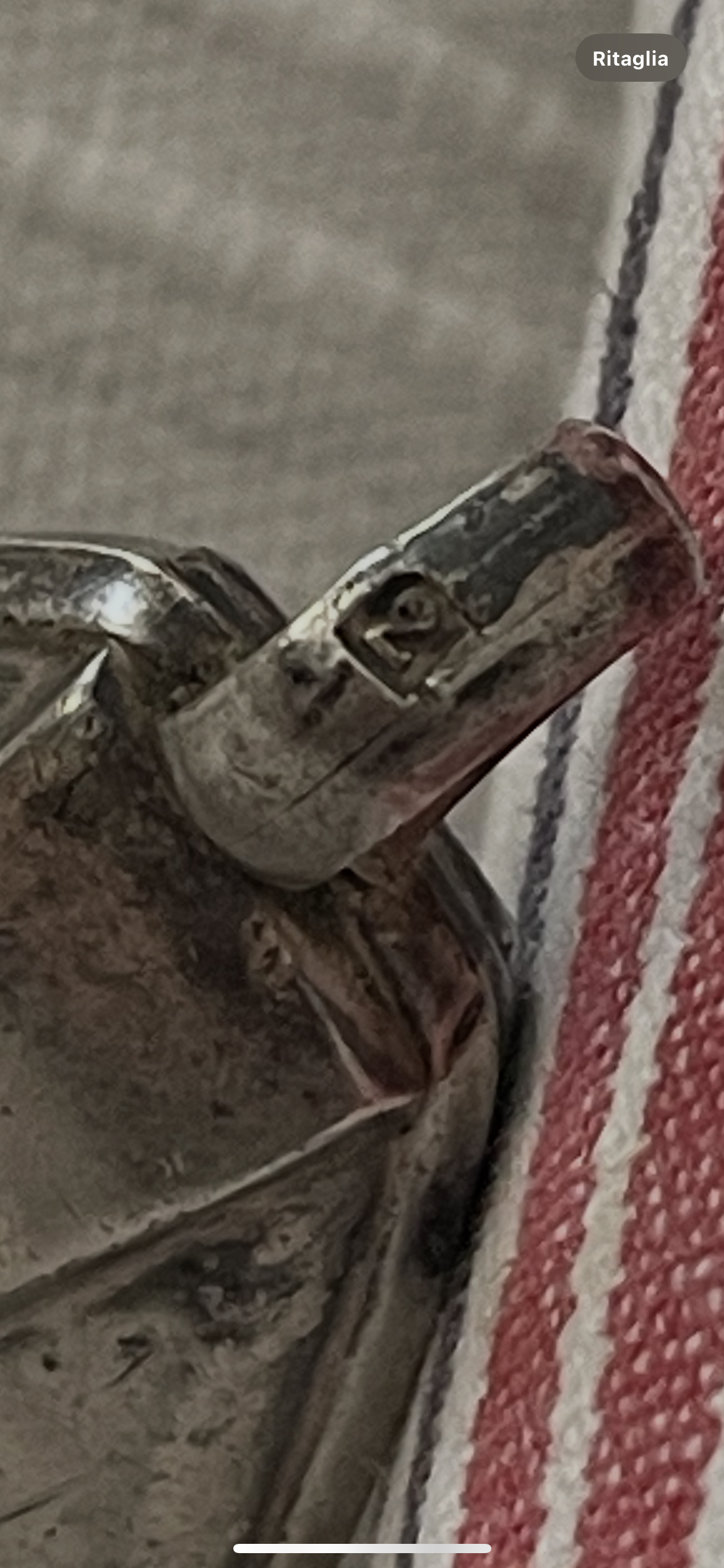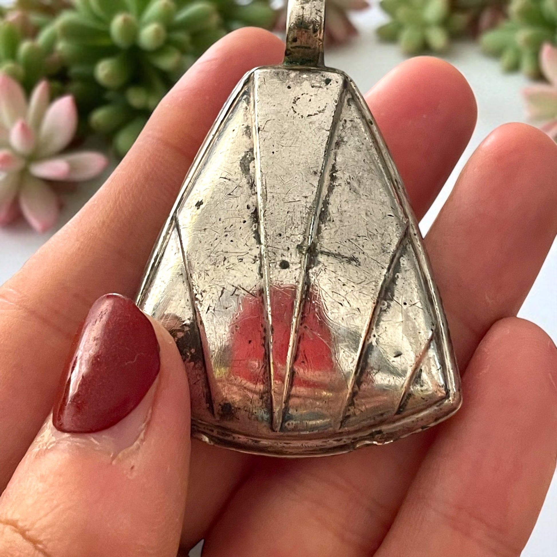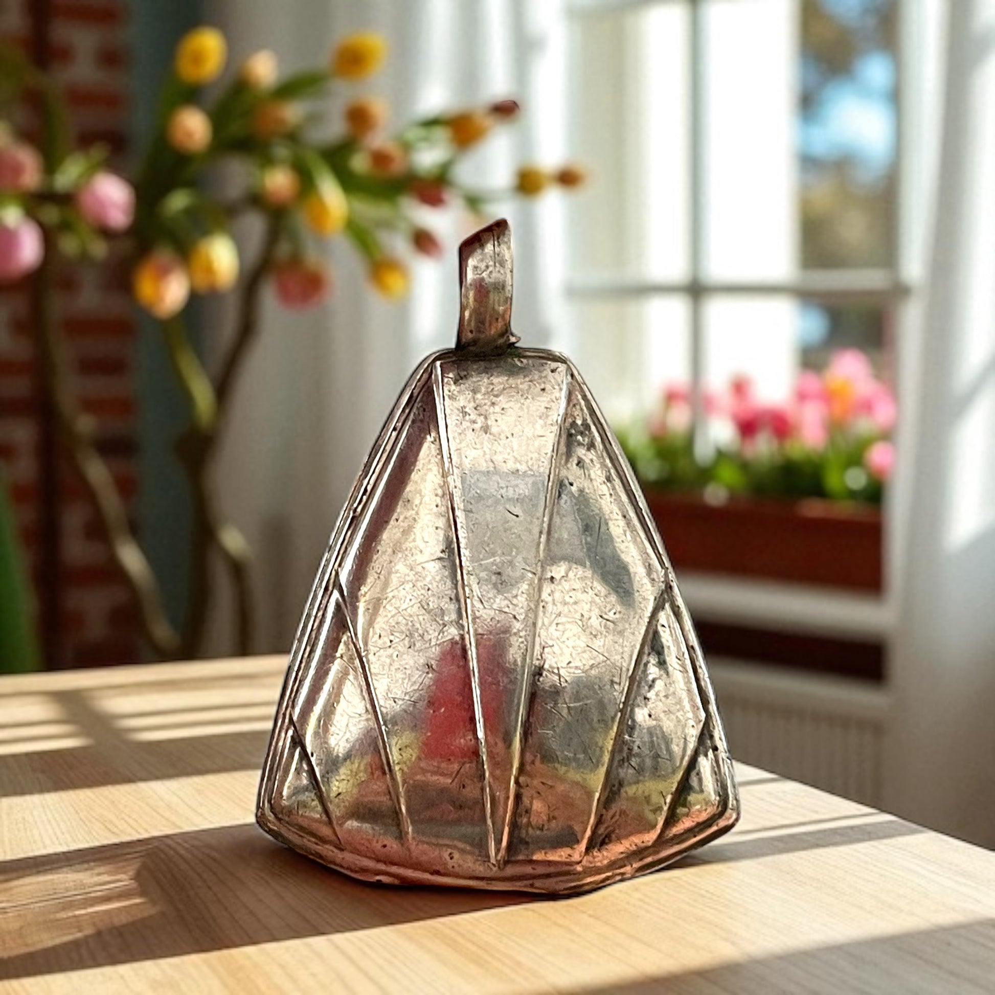 All’inizio del Novecento, i neonati venivano accolti nel mondo con piccoli oggetti simbolici, e tra i più significativi c’erano i sonagli. Non erano solo strumenti per attirare l’attenzione del bambino: si credeva che il loro tintinnio allontanasse gli spiriti maligni, proteggendo la nuova vita con suoni leggeri e rassicuranti. Il sonaglio diventava così un primo talismano d’affetto, spesso donato alla nascita, portato appeso a nastri o catene, accarezzato da mani curiose o fatto oscillare da una madre per far addormentare il suo piccolo. Quello che vedi qui non è un comune sonaglio placcato – come tanti che circolavano all’epoca – ma un raro esempio in argento massiccio, punzonato. Il suo design Art Déco, con linee geometriche affilate e simmetriche, ricorda una piccola scultura da indossare. La superficie liscia è attraversata da nervature che lo rendono quasi un origami metallico: essenziale, elegante, intrinsecamente moderno. Una piccola deformazione su un lato, ed i segni del tempo, raccontano la vita e la delicatezza del tempo che ha attraversato. Può essere facilmente indossato con una catenina, trasformandosi in un ciondolo potente e carico di memoria - nonché bellissimo e fuori dal comune. È come portare al collo un frammento d’infanzia e di amore, con la bellezza quasi statuaria di un oggetto che trascende la sua funzione originaria. Oggi non suona più solo per i neonati, ma per chiunque voglia ascoltare le storie silenziose delle cose autentiche. 53 x 37 mm, peso 8,08g.