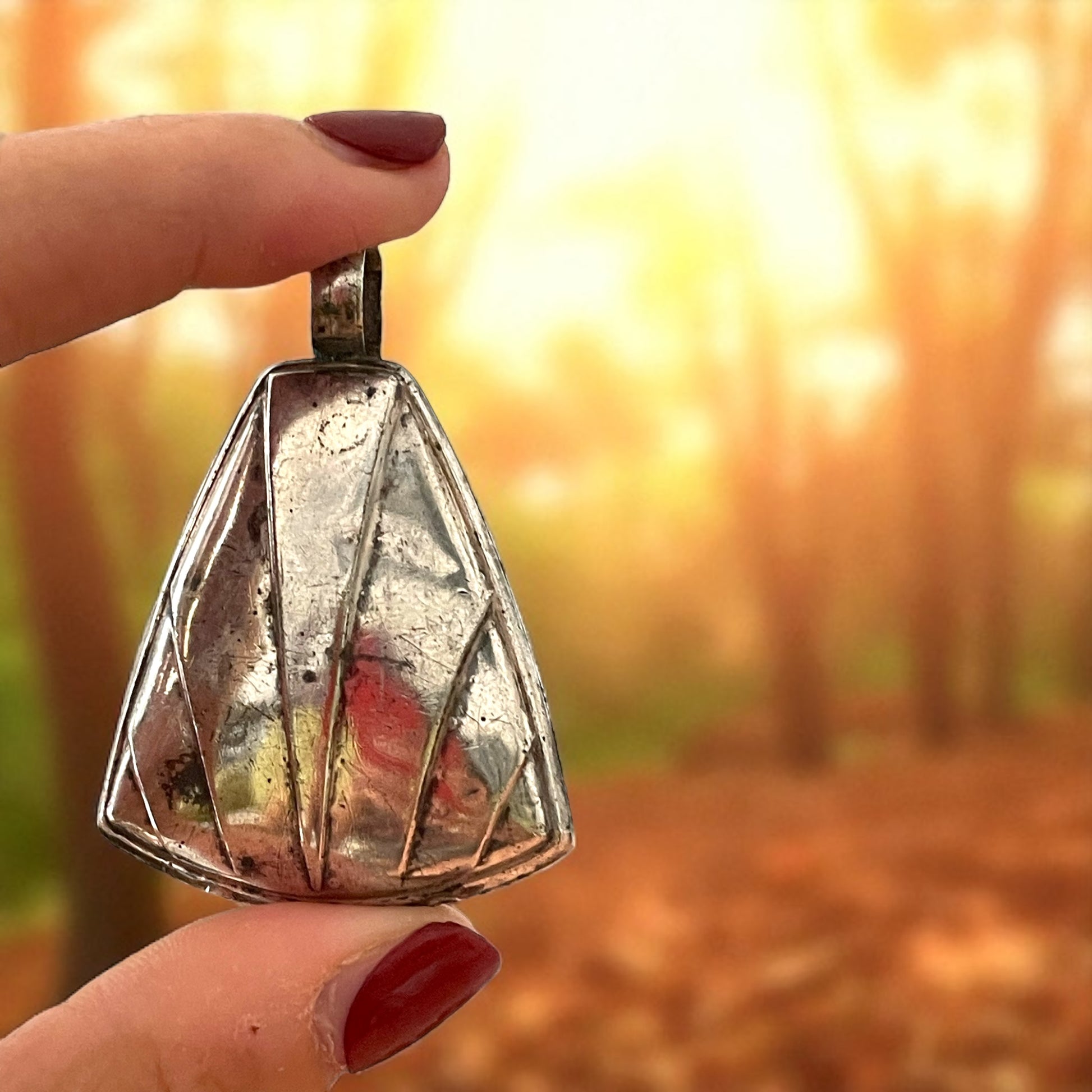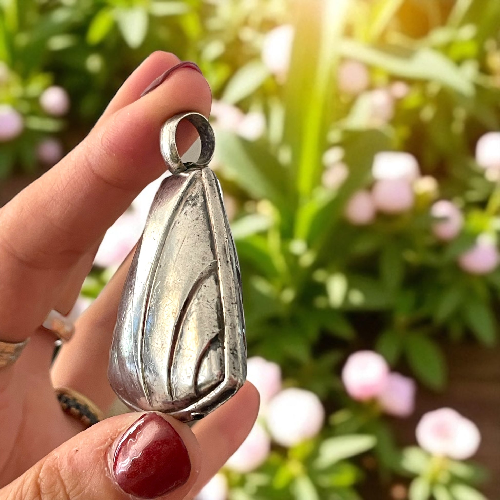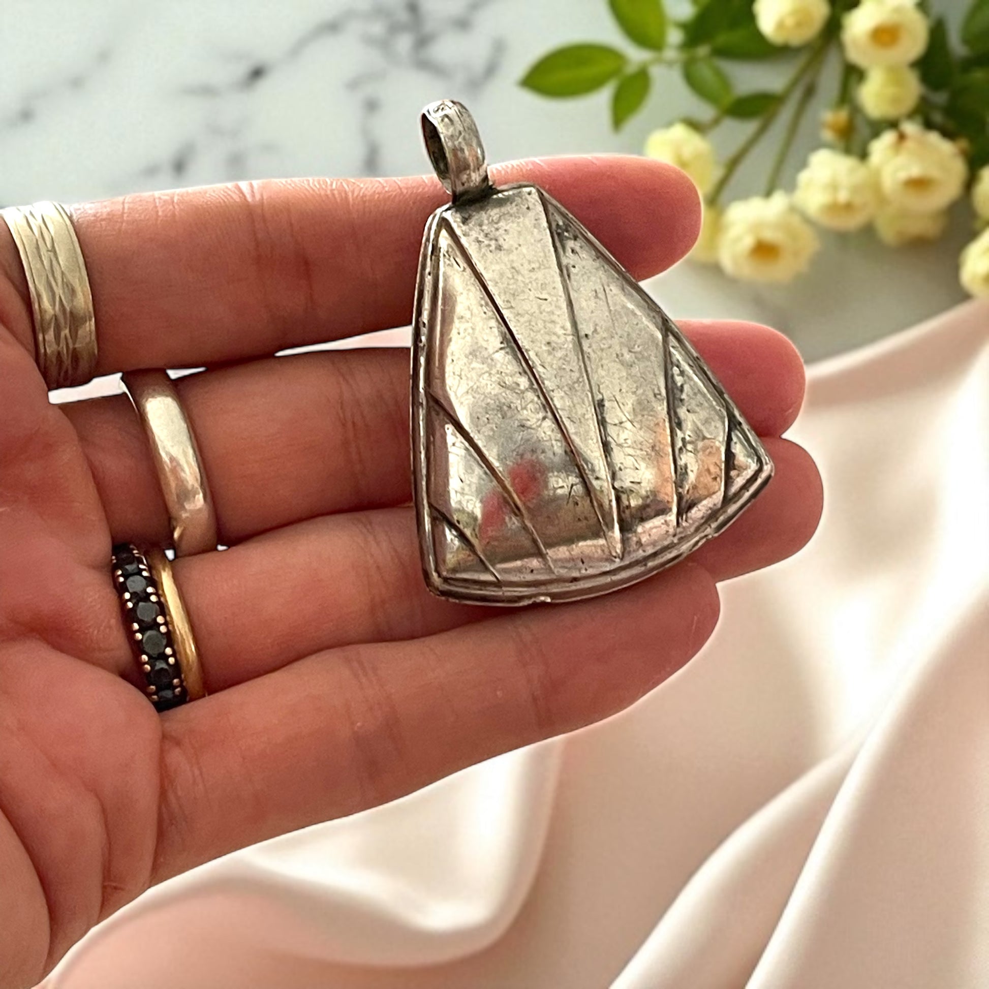All’inizio del Novecento, i neonati venivano accolti nel mondo con piccoli oggetti simbolici, e tra i più significativi c’erano i sonagli. Non erano solo strumenti per attirare l’attenzione del bambino: si credeva che il loro tintinnio allontanasse gli spiriti maligni, proteggendo la nuova vita con suoni leggeri e rassicuranti. Il sonaglio diventava così un primo talismano d’affetto, spesso donato alla nascita, portato appeso a nastri o catene, accarezzato da mani curiose o fatto oscillare da una madre per far addormentare il suo piccolo. Quello che vedi qui non è un comune sonaglio placcato – come tanti che circolavano all’epoca – ma un raro esempio in argento massiccio, punzonato. Il suo design Art Déco, con linee geometriche affilate e simmetriche, ricorda una piccola scultura da indossare. La superficie liscia è attraversata da nervature che lo rendono quasi un origami metallico: essenziale, elegante, intrinsecamente moderno. Una piccola deformazione su un lato, ed i segni del tempo, raccontano la vita e la delicatezza del tempo che ha attraversato. Può essere facilmente indossato con una catenina, trasformandosi in un ciondolo potente e carico di memoria - nonché bellissimo e fuori dal comune. È come portare al collo un frammento d’infanzia e di amore, con la bellezza quasi statuaria di un oggetto che trascende la sua funzione originaria. Oggi non suona più solo per i neonati, ma per chiunque voglia ascoltare le storie silenziose delle cose autentiche. 53 x 37 mm, peso 8,08g.