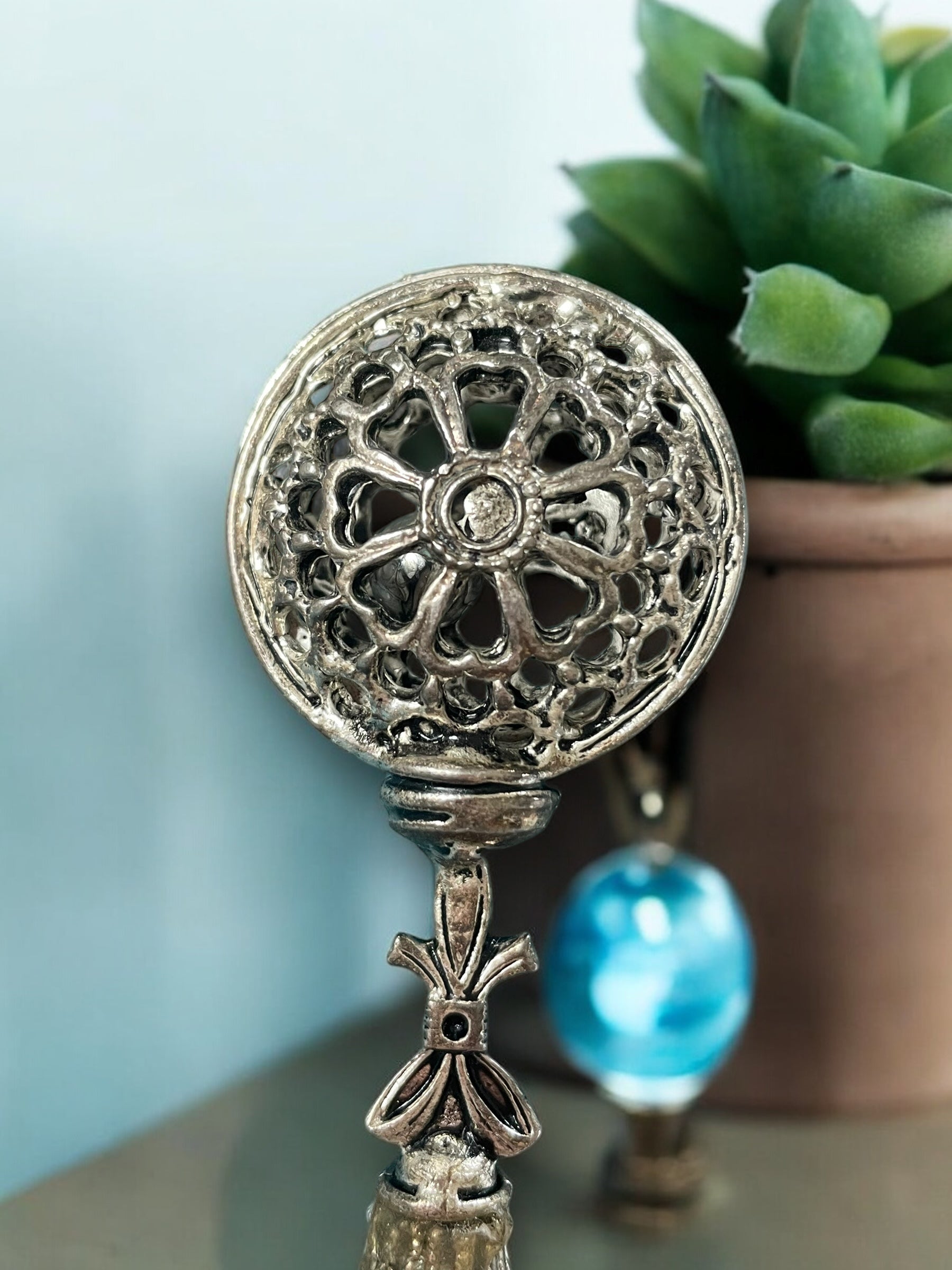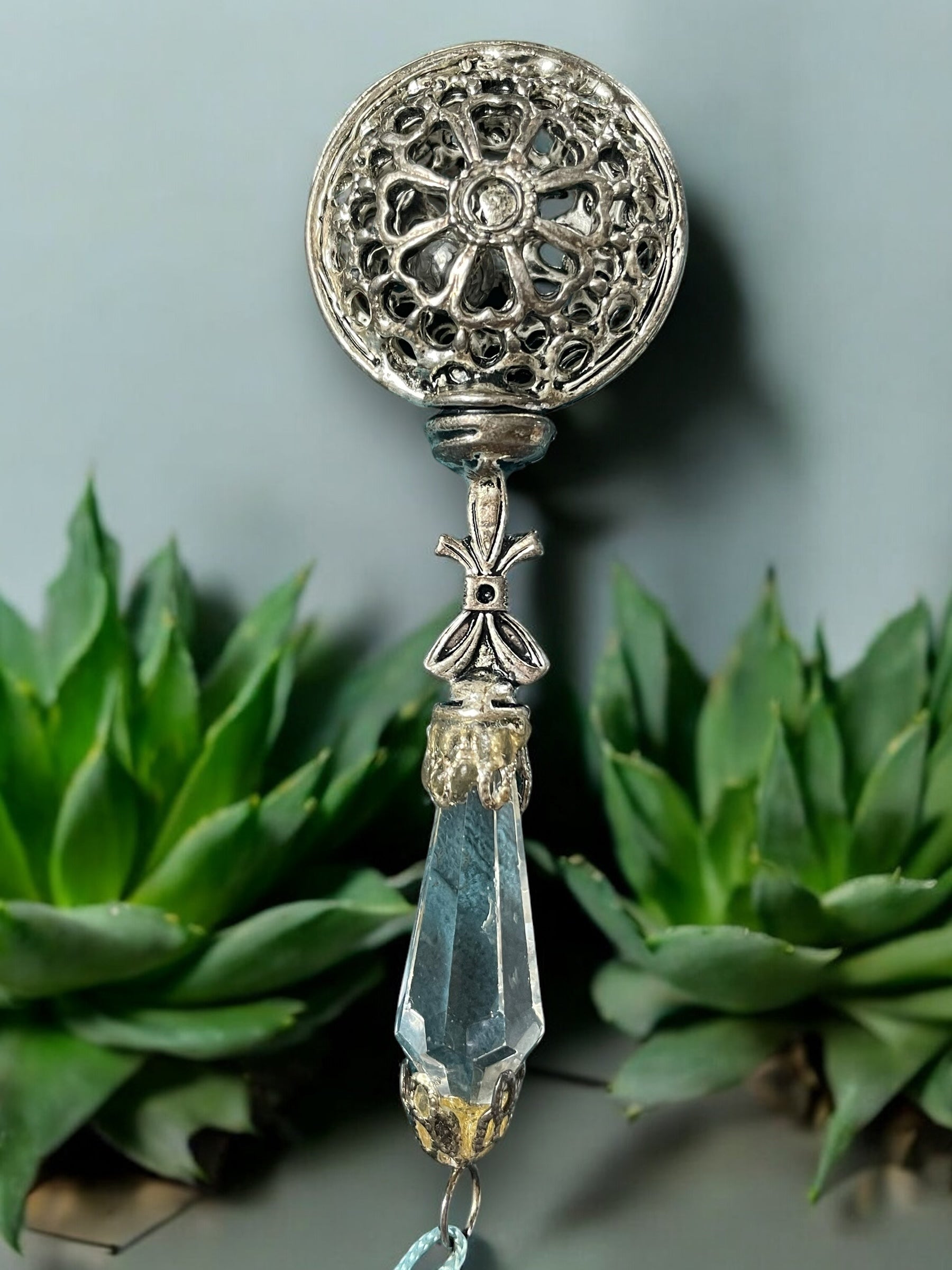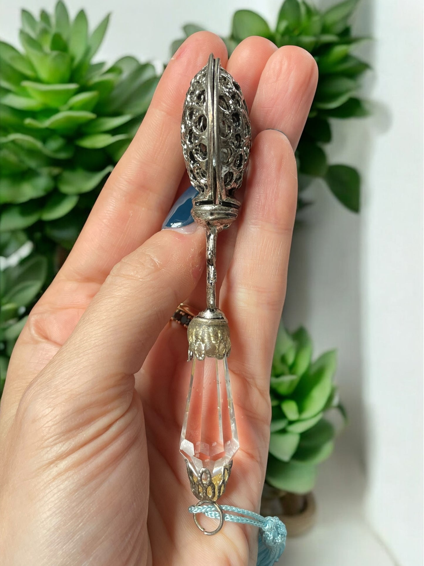 Raffinato sonaglio vintage, dal fascino elegante e ricercato, che presenta un’impugnatura in vetro sfaccettato o cristallo, che riflette la luce con delicati giochi di trasparenza. La parte superiore, finemente decorata con motivi floreali traforati, racchiude al suo interno una piccola sfera che produce un suono delicato e cristallino. La finitura argentata gli conferisce un aspetto nobile e senza tempo. Probabilmente risalente alla metà del Novecento, evoca lo stile decorativo tipico degli anni ‘60. Perfetto per arricchire una collezione, come oggetto decorativo o come piccolo dono simbolico dal fascino antico. Un piccolo tesoro che porta con sé l’eleganza di un’epoca passata. Lunghezza cm 10 (senza nappina).