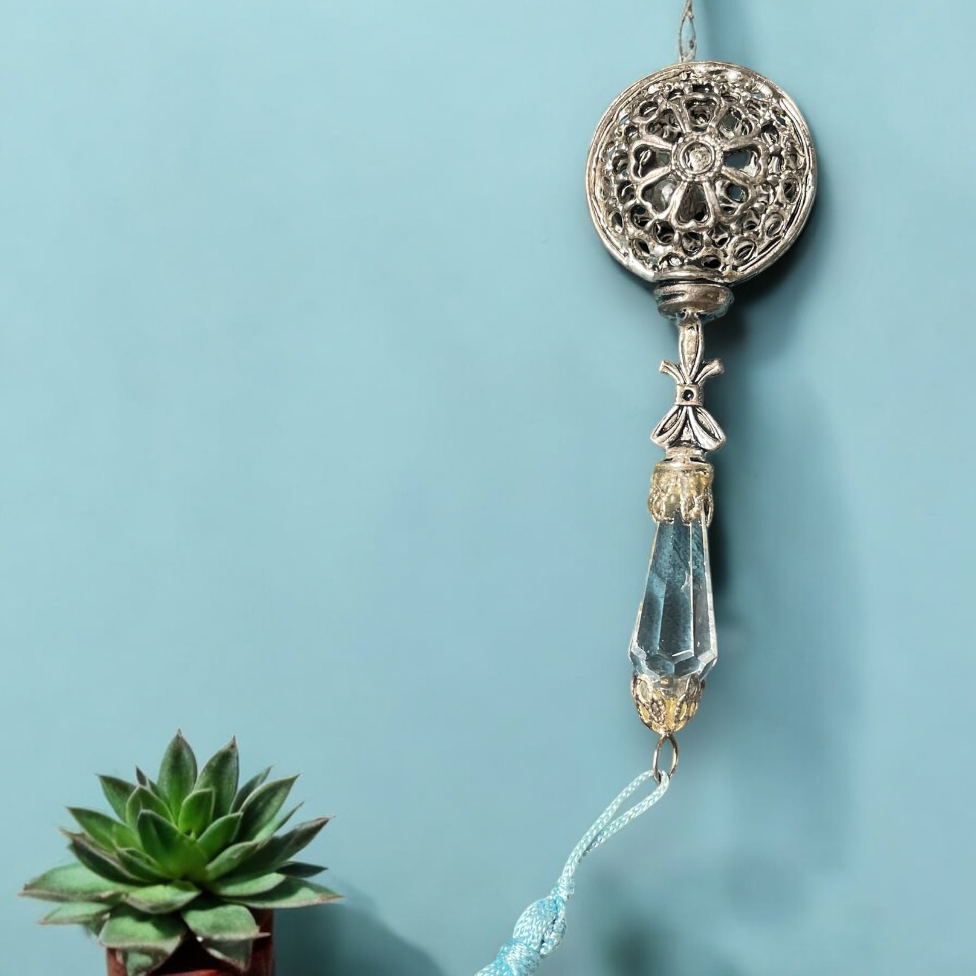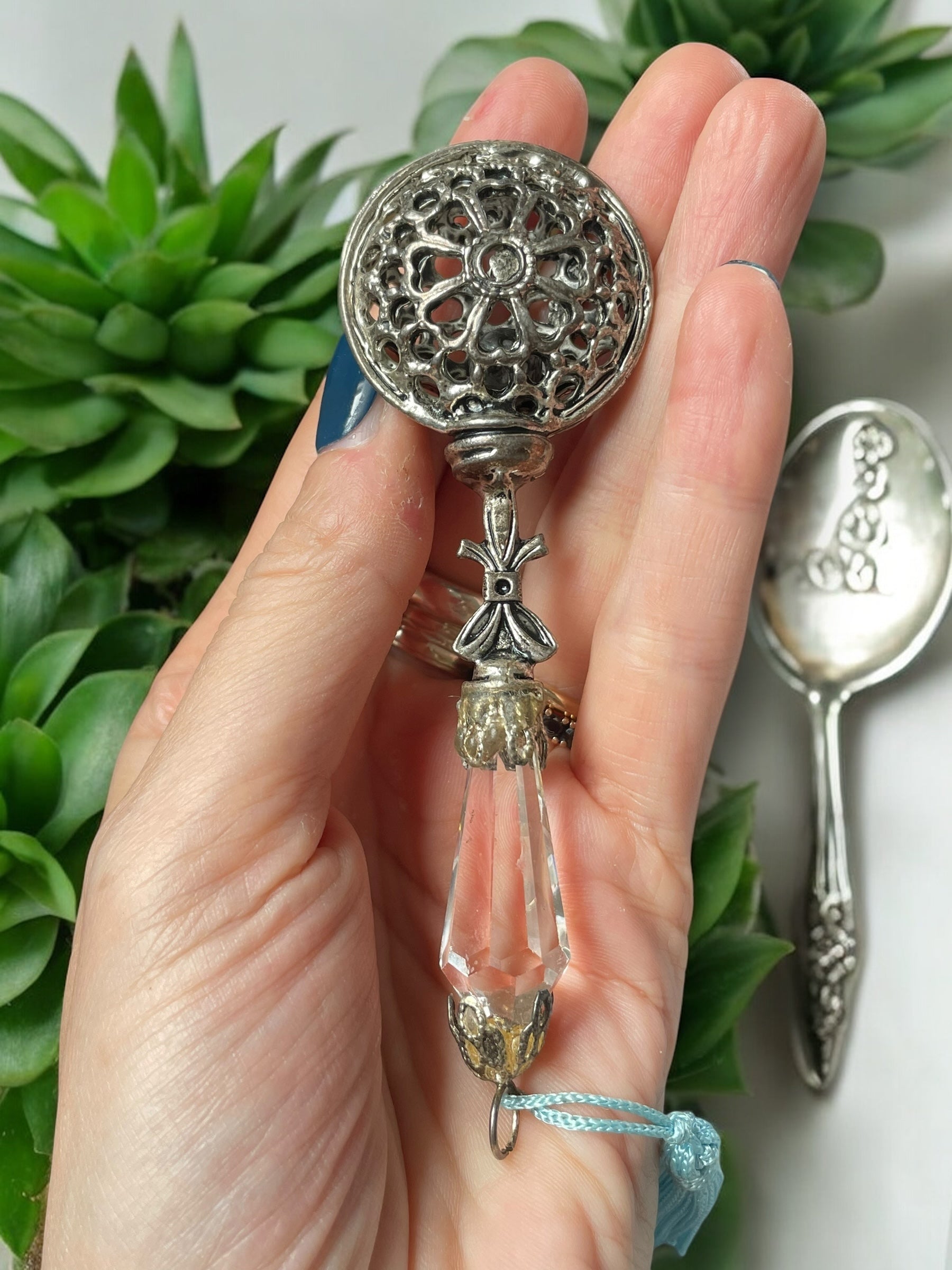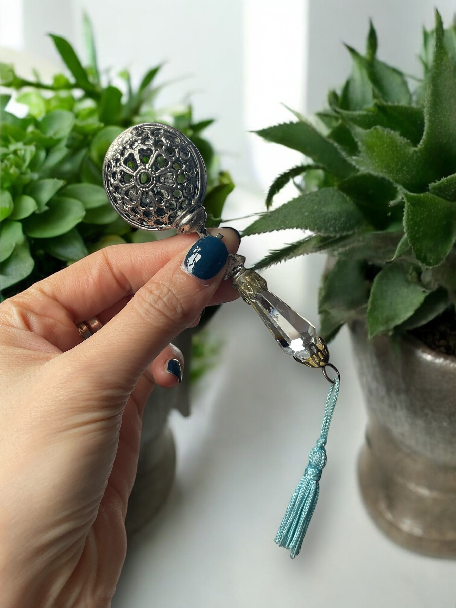 Raffinato sonaglio vintage, dal fascino elegante e ricercato, che presenta un’impugnatura in vetro sfaccettato o cristallo, che riflette la luce con delicati giochi di trasparenza. La parte superiore, finemente decorata con motivi floreali traforati, racchiude al suo interno una piccola sfera che produce un suono delicato e cristallino. La finitura argentata gli conferisce un aspetto nobile e senza tempo. Probabilmente risalente alla metà del Novecento, evoca lo stile decorativo tipico degli anni ‘60. Perfetto per arricchire una collezione, come oggetto decorativo o come piccolo dono simbolico dal fascino antico. Un piccolo tesoro che porta con sé l’eleganza di un’epoca passata. Lunghezza cm 10 (senza nappina).