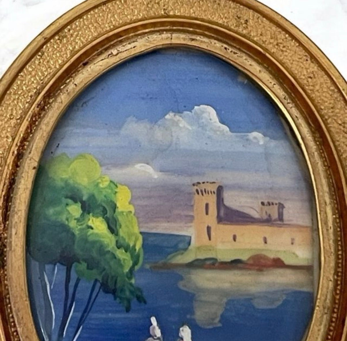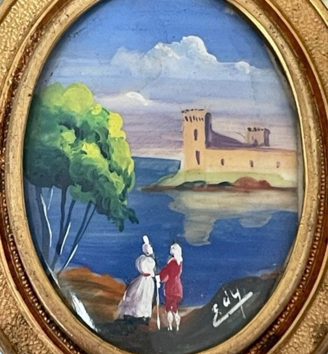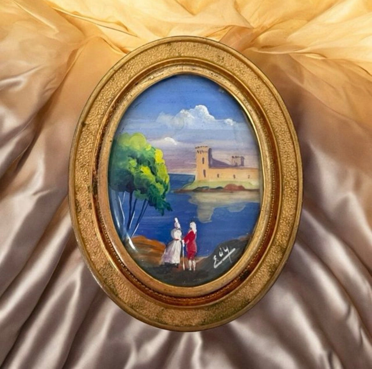 Spilla ovale con miniatura dipinta a mano – acquerello dietro vetro bombato. Firma Edy. Cornice in metallo dorato. Dim. 5 x 4 cm.