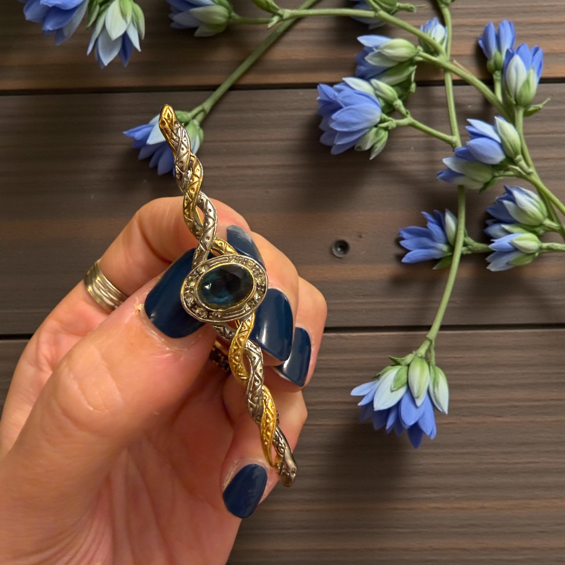 Sembra uscita da La Storia Infinita. Ci sono gioielli che sembrano usciti da un racconto; questo ne è un esempio meraviglioso. Una spilla in argento 925 che richiama immediatamente un’immagine archetipica: due serpenti che si avvolgono su se stessi, formando un equilibrio perfetto, eppure scelgono direzioni opposte con lo sguardo. I corpi intrecciati parlano di unità, di legame, di un movimento continuo che non si interrompe. Le teste, orientate una verso destra e una verso sinistra, raccontano invece la differenza, la possibilità di camminare separati senza smettere di appartenersi. È un simbolo antico, quasi mitico: la protezione, il ciclo eterno, la tensione tra opposti che non si annullano ma si riconoscono. Al centro, una pietra blu profonda trattiene la luce come un sigillo, rendendo questo gioiello più simile a un talismano che a un semplice ornamento. Una spilla che sembra custodire una storia, o forse ricordarci che ogni equilibrio autentico nasce proprio lì: nel restare intrecciati pur guardando altrove.
